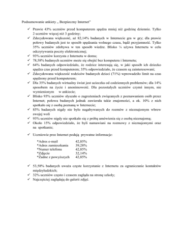 Podsumowanie ankiety „ Bezpieczny Internet” Prawie 43% uczniów przed komputerem spędza mniej niż godzinę dziennie. Tylko 2 uczniów więcej niż 3 godziny; Zdecydowana większość, aż 82,14% badanych w Internecie gra w gry; dla prawie połowy badanych jest to sposób spędzania wolnego czasu, bądź przyjemność. Tylko 35% uczniów zdobywa w ten sposób wiedze. Blisko ¼ używa Internetu w celu odczytywania poczty elektronicznej; 93% uczniów korzysta z Internetu w domu; 78,58% badanych uczniów może się obejść bez komputera i Internetu; 64% badanych odpowiedziało, że rodzice interesują się, w jaki sposób ich dziecko spędza czas przed komputerem; 35% odpowiedziało, że czasem są zainteresowani; Zdecydowana większość rodziców badanych dzieci (71%) wprowadziło limit na czas spędzony przed komputerem; Dla 35% badanych wirtualny świat jest ucieczka od codziennych problemów; dla 14% sposobem na życie i anonimowość. Dla pozostałych uczniów czymś innym, nie wymienionym w ankiecie; Blisko 93% uczniów słyszało o zagrożeniach związanych z poznawaniem osób przez Internet; połowa badanych jednak zawierała takie znajomości, a ok. 10% z nich spotkało się z osobą poznaną w Internecie; 85% badanych nigdy nie było nagabywanych do rozmów z nieznajomym wbrew swojej woli 93% uczniów nigdy nie spotkało się z próbą umówienia się z osobą nieznajomą; Około 15% odpowiedziało, że byli namawiani na rozmowy z nieznajomymi oraz na spotkanie; Uczniowie prze Internet podają prywatne informacje: *Adres e-mail *Adres zamieszkania *Numer telefonu *Zdjęcie *Żadne z powyższych 42,85% 39,28% 42,85% 32,14% 42,85% 53,58% badanych uważa częste korzystanie z Internetu za ograniczanie kontaktów międzyludzkich; 32% uczniów często i czasem zagląda na stronę szkoły; Najczęściej zaglądają do galerii zdjęć. Wnioski: 1. Należy systematycznie przeprowadzić lekcje, które uświadomią zagrożenia płynące z długiego przebywania przy komputerze, ze szczególnym zwróceniem uwagi na choroby cywilizacyjne (mogą to być również pogadanki z pielęgniarką szkolną, lekcje wychowawcze związane z profilaktyką zdrowotną). 2. Należy uświadamiać uczniów i pokazywać skutki częstego grania w gry na komputerze. 3. Należy cały czas uświadamiać uczniów o grożących im w sieci niebezpieczeństwach, uczyć ich jak sobie z nimi radzić i do kogo się zwracać w razie potrzeby np. również na lekcji wychowawczej, na języku polskim (plagiaty), na języku obcym (translatory nie zawsze poprawnie tłumaczą) itd. 4. Rodzice powinni w dalszym ciągu zwracać uwagę na to, co dziecko ogląda w Internecie, z kim rozmawia przez komunikator i z jakich stron korzysta.