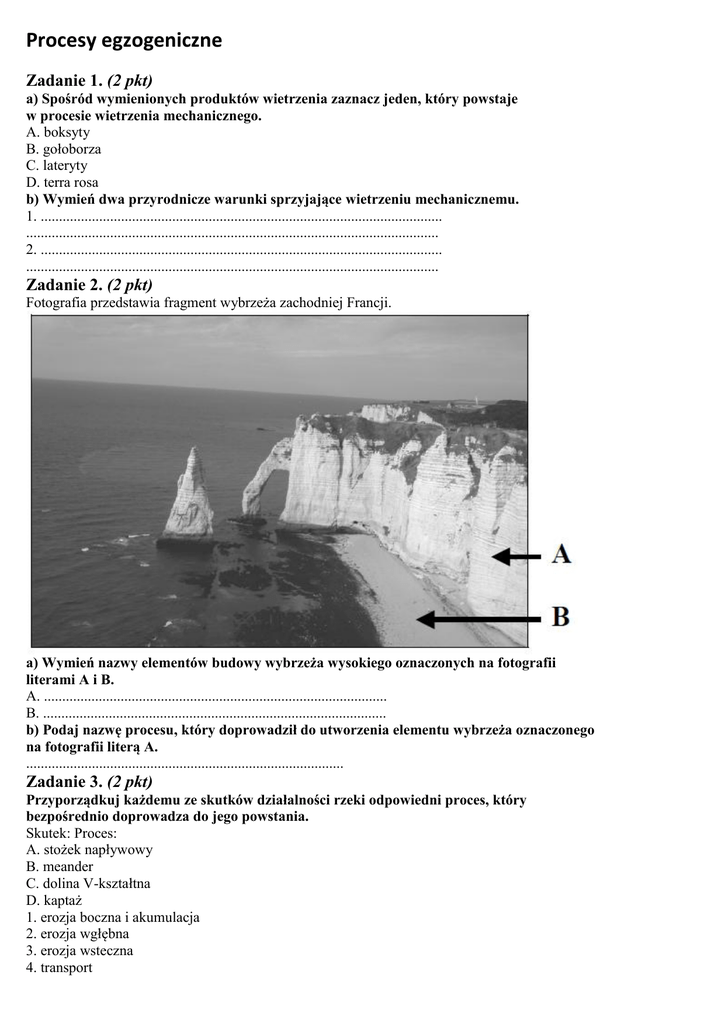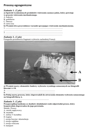 Procesy egzogeniczne Zadanie 1. (2 pkt) a) Spośród wymienionych produktów wietrzenia zaznacz jeden, który powstaje w procesie wietrzenia mechanicznego. A. boksyty B. gołoborza C. lateryty D. terra rosa b) Wymień dwa przyrodnicze warunki sprzyjające wietrzeniu mechanicznemu. 1. .............................................................................................................. ................................................................................................................. 2. .............................................................................................................. ................................................................................................................. Zadanie 2. (2 pkt) Fotografia przedstawia fragment wybrzeża zachodniej Francji. a) Wymień nazwy elementów budowy wybrzeża wysokiego oznaczonych na fotografii literami A i B. A. .............................................................................................. B. .............................................................................................. b) Podaj nazwę procesu, który doprowadził do utworzenia elementu wybrzeża oznaczonego na fotografii literą A. ....................................................................................... Zadanie 3. (2 pkt) Przyporządkuj każdemu ze skutków działalności rzeki odpowiedni proces, który bezpośrednio doprowadza do jego powstania. Skutek: Proces: A. stożek napływowy B. meander C. dolina V-kształtna D. kaptaż 1. erozja boczna i akumulacja 2. erozja wgłębna 3. erozja wsteczna 4. transport 5. akumulacja A. ............................. B. ............................. C. ............................. D. ............................. Zadanie 4. (2 pkt) Na rysunkach od 1. do 3. przedstawiono rozwój rzeźby gór następujący w wyniku działalności lodowców górskich. 1 2 3 Na podstawie: Jan Flis, Wstęp do geografii fizycznej, WSiP, Warszawa, 1988 Korzystając z rysunków wykaż, podając dwa argumenty, że działalność lodowców przekształca rzeźbę gór. 1. .................................................................................................................................................. ...................................................................................................................................................... 2. .................................................................................................................................................. ...................................................................................................................................................... Zadanie 5. (3 pkt) Rysunek ilustruje działalność rzeźbotwórczą rzeki wzdłuż jej biegu. Przekroje przez dolinę rzeczną i ujście I II III IV Na podstawie: Dorota Makowska, Podręcznik do geografii fizycznej dla szkoły średniej, WSiP, Warszawa 1998 Uzupełnij tabelę, wpisując dla każdego z wyróżnionych odcinków biegu rzeki (A, B, C) następujące elementy: – numer przekroju poprzecznego doliny rzecznej od II do IV – dominujący proces rzeźbotwórczy wybrany z następujących: erozja boczna, erozja wgłębna, akumulacja, erozja wsteczna – przykładową formę rzeźby charakterystyczną dla danego biegu rzeki. Odcinek Numer Dominujący proces Forma rzeźby rzeki przekroju rzeźbotwórczy charakterystyczna doliny w danym biegu A B C ujście I akumulacja Zadanie 46. (3 pkt) Rysunki przedstawiają wydmę paraboliczną i barchan. kierunek wiatru ............................................ ............................................................ a) Wpisz pod rysunkami właściwy typ wydmy. delta b) Wyjaśnij przyczyny różnego ustawienia ramion wydm w stosunku do kierunku wiatru. A ................................................................................................................................................. ..................................................................................................................................................... B ................................................................................................................................................ ..................................................................................................................................................... Zadanie 48. (5 pkt) W tabeli zestawiono czynniki, procesy i formy polodowcowe. Uzupełnij tabelę, tak aby powstał ciąg przyczynowo . skutkowy. Czynnik proces forma Cyrk lodowcowy (kar) Wody fluwioglacjalne Erozja wzdłuż czoła lądolodu