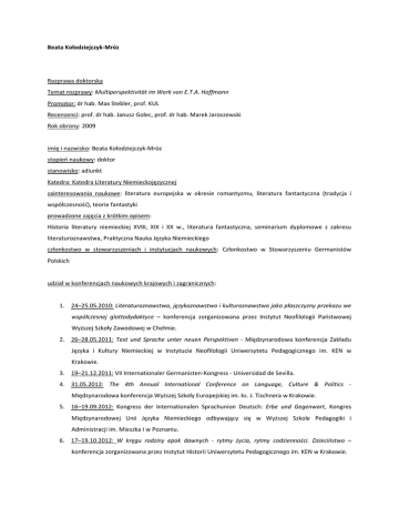 Beata Kołodziejczyk‐Mróz Rozprawa doktorska Temat rozprawy: Multiperspektivität im Werk von E.T.A. Hoffmann Promotor: dr hab. Max Stebler, prof. KUL Recenzenci: prof. dr hab. Janusz Golec, prof. dr hab. Marek Jaroszewski Rok obrony: 2009 imię i nazwisko: Beata Kołodziejczyk‐Mróz stopień naukowy: doktor stanowisko: adiunkt Katedra: Katedra Literatury Niemieckojęzycznej zainteresowania naukowe: literatura europejska w okresie romantyzmu, literatura fantastyczna (tradycja i współczesność), teorie fantastyki prowadzone zajęcia z krótkim opisem: Historia literatury niemieckiej XVIII, XIX i XX w., literatura fantastyczna, seminarium dyplomowe z zakresu literaturoznawstwa, Praktyczna Nauka Języka Niemieckiego członkostwo w stowarzyszeniach i instytucjach naukowych: Członkostwo w Stowarzyszeniu Germanistów Polskich udział w konferencjach naukowych krajowych i zagranicznych: 1. 24–25.05.2010: Literaturoznawstwo, językoznawstwo i kulturoznawstwo jako płaszczyzny przekazu we współczesnej glottodydaktyce – konferencja zorganizowana przez Instytut Neofilologii Państwowej Wyższej Szkoły Zawodowej w Chełmie. 2. 26–28.05.2011: Text und Sprache unter neuen Perspektiven ‐ Międzynarodowa konferencja Zakładu Języka i Kultury Niemieckiej w Instytucie Neofilologii Uniwersytetu Pedagogicznego im. KEN w Krakowie. 3. 19–21.12.2011: VII Internationaler Germanisten‐Kongress ‐ Universidad de Sevilla. 4. 31.05.2012: The 4th Annual International Conference on Language, Culture & Politics ‐ Międzynarodowa konferencja Wyższej Szkoły Europejskiej im. ks. J. Tischnera w Krakowie. 5. 16–19.09.2012: Kongress der Internationalen Sprachunion Deutsch: Erbe und Gegenwart, Kongres Międzynarodowej Unii Języka Niemieckiego odbywający się w Wyższej Szkole Pedagogiki i Administracji im. Mieszka I w Poznaniu. 6. 17–19.10.2012: W kręgu rodziny epok dawnych ‐ rytmy życia, rytmy codzienności. Dzieciństwo – konferencja zorganizowana przez Instytut Historii Uniwersytetu Pedagogicznego im. KEN w Krakowie. 7. 09.05.2013: Perwersja w literaturze, literatura w perwersji – ogólnopolska konferencja Instytutu Polonistyki Akademii Pomorskiej w Słupsku. 8. 27‐29.09.2013: „O milczeniu“ – Przemilczane – Niepowiedziane – Niewymowne ‐ II Międzynarodowa interdyscyplinarna konferencja Zakładu Języka i Kultury Niemieckiej Uniwersytetu Pedagogicznego w Krakowie. 9. 04‐05.10.2013: Interkulturelle und transkulturelle Dimension im linguistischen, kulturellen und historischen Kontext – Międzynarodowa konferencja Uniwersytetu w Pardubicach. 10. 17‐18.10.2013: Autobiographisches Schreiben von Frauen 1900‐1950. Theoretische Ansätze und Praxis – Międzynarodowa konferencja Uniwersytetu w Alcalá de Henares. 11. 15–16.10.2014: W kręgu rodziny epok dawnych – rytmy życia, rytmy codzienności. Kobieta i mężczyzna – dwa światy, jedna przestrzeń – II międzynarodowa konferencja naukowa zorganizowana przez Instytut Historii Uniwersytetu Pedagogicznego im. KEN w Krakowie 12. 16‐17.10.2014: Samotność – Aspekty, Konteksty, Wymiary – międzynarodowa interdyscyplinarna konferencja naukowa zorganizowana przez Katedrę Rosjoznawstwa, Literatury i Kultury Rosyjskiej Uniwersytetu Gdańskiego 13. 07‐08.03.2015: Inter. Intra. Trans. Theater als Begegnungsort: deutsch‐polnischer Kulturtransfer – konferencja naukowa zorganizowana przez Instytut Germanistyki Uniwersytetu Warszawskiego 14. 30.03–01.04.2015: Kultura duchowa w języku i tekście – interdyscyplinarna ogólnopolska konferencja zorganizowana przez Katedrę Filologii Germańskiej Uniwersytetu Warmińsko‐Mazurskiego w Olsztynie 15. 06‐07.05.2015: Światopoglądy modernizmu – konferencja zorganizowana przez Katedrę Literatury Pozytywizmu Młodej Polski Uniwersytetu Łódzkiego 16. 09‐10.10.2015: Interkulturelle und transkulturelle Dimension im linguistischen, kulturellen und historischen Kontext – międzynarodowa konferencja zorganizowana przez Uniwersytet w Pardubicach kontakt: telefon służbowy ‐ (12) 662 67 44 adres e‐mail: [email protected] nr pokoju: 310 Publikacje: ‐ artykuły 1. Das Phänomen des Phantastischen im „Sandmann“ von E.T.A. Hoffmann w: Orbis Linguarum, Vol. 33 (2008): 159‐178, pod redakcją Edwarda Białka, Eugeniusza Tomiczka i Leszka Żylińskiego, Oficyna Wydawnicza ATUT – Wrocławskie Wydawnictwo Oświatowe, ISBN 978‐83‐7432‐391‐8. 2. Das Verhältnis zwischen Rationalem und Irrationalem im „Schimmelreiter“ von Theodor Storm w: Roczniki Humanistyczne, zeszyt 5: Neofilologia, tom LVII (2009): 67‐94, Wydawnictwo KUL, Lublin, ISSN 0035‐7707. 3. Fantastyka we współczesnej prozie niemieckojęzycznej na przykładzie opowiadania Ursa Widmera „Błękitny syfon” w: Kultura i polityka, zeszyt nr 8 (2010): 166‐178, Wydawnictwo Wyższej Szkoły Europejskiej im. ks. J. Tischnera, Kraków, ISBN 1899‐4466. 4. „Das Fräulein von Scuderi” von E.T.A. Hoffmann – zum Verhältnis zwischen Realem und Dämonischem w: Roczniki Humanistyczne, zeszyt 5: Neofilologia, tom LX (2012): 225‐247, Wydawnictwo KUL, Lublin, ISSN 0035‐ 7707. 5. Konzept der Verwandlung – Christoph Ransmayrs „Die letzte Welt“ w Studia Niemcoznawcze, Tom L (2012): 497‐503, red. Lech Kolago, Warszawa, ISSN 0208‐4597. 6. : „Wersje” perwersji w literaturze niemieckojęzycznej XIX i XX wieku w: Orbis Linguarum, Vol. 43 (2015): 465‐ 477, red: Białek, E., Kowal, G., Lopuschanskyj, J. (red.):, Neisse Verlag & Oficyna Wydawnicza ATUT, Dresden – Wrocław, ISBN: 978‐3‐86276‐181‐4. (współautor: Piotr Majcher). ‐ rozdziały w monografiach 1. Sens a tekst literacki – wybrane fragmenty opowiadania „Piaskun” E.T.A Hoffmanna i ich korespondencja do tekstu źródłowego w: Literaturoznawstwo, językoznawstwo i kulturoznawstwo jako płaszczyzny przekazu we współczesnej glottodydaktyce (2010): 159‐166, redakcja: Jolanta Knieja, Tomasz Zygmunt,