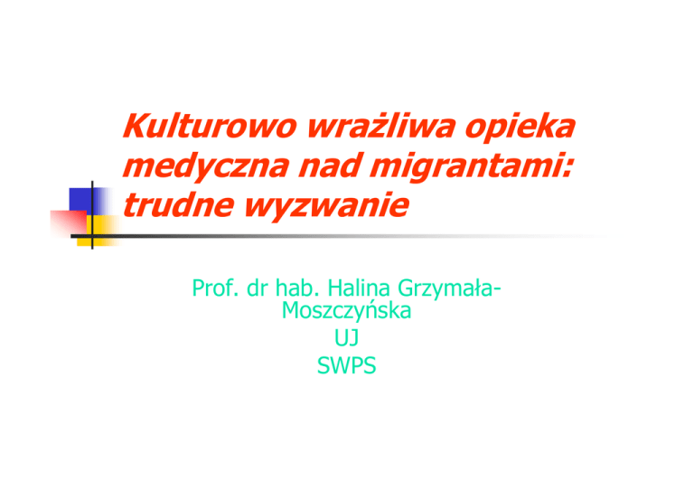 Kulturowo wrażliwa opieka medyczna nad migrantami: trudne wyzwanie Prof. dr hab. Halina GrzymałaMoszczyńska UJ SWPS Polska zmiana kulturowa Utrata homogeniczności Pojawienie się ” pełzającej” wielokulturowości (obcokrajowcy i Polacy po doświadczeniach z innymi kulturami) Rola kultury w zaburzeniach psychicznych i fizycznych Kultura jako czynnik: - patogenny - terapeutyczny - patoplastyczny (Culture bound syndromes) Terapeutyczny wpływ kultury - - efekt zdrowego migranta: osoba która emigruje ze swojego kraju, jest zdrowsza niż przeciętny reprezentant populacji, kultura, z której pochodzi imigrant, promuje zdrowszy styl życia niż kultura docelowa prozdrowotne oddziaływaniem kultury poprzez wspieranie przez nią poczucia identyczności jednostki Ważnym czynnikiem kulturowym wpływającym na zdrowie psychiczne są też kulturowo akceptowane działania prewencyjne. - umiejętność odreagowywania napięcia przy pomocy technik relaksacyjnych - światopogląd religijny Kultura a zdrowie Kultura określa czym jest zdrowie i co, w konkretnej kulturze, oznacza bycie chorym koncepcje zdrowia i choroby powstały na gruncie kultury zachodniej i związanej z nią tradycji judeo-chrześcijańskiej. Odzwierciedlają zarówno wzorce tej kultury, jak i normy postępowania. tak skonstruowane koncepcje są najczęściej traktowane jako normatywne dla wszystkich kręgów kulturowych. normy te zaczynają być coraz częściej kwestionowane przez badaczy z kultur niezachodnich, którzy opierają się na materiale pochodzącym ze swoich kręgów kulturowych Choroba a kultura znajomość naczelnego, w danym kontekście kulturowym, źródła władzy ( polityczne, religijne lub technologiczne) pozwala przewidzieć, jakie przyczyny zaburzenia (illness) i sposoby jego leczenia, będą tam stosowane. Społecznie uprawomocniona władza określa działanie systemu opieki nad chorym. Decyduje czy będzie się odwoływał do tradycji politycznej, systemu wierzeń czy też do dorobku nauki. Terminologia Illness jest oparta na normach kulturowych, bo przez ich pryzmat rozpoznajemy nasze objawy. Czynnikiem w istotny sposób zespalającym illness z disease (symptomatologią) jest system leczenia i postępowania z chorymi, wypracowany przez daną kulturę. W społeczeństwach tradycyjnych leczenie przede wszystkim jest zwrócone na illness, czyli na zinterpretowanie, dla potrzeb pacjenta i jego otoczenia, natury zaburzenia i wskazanie zabiegów, które mają doprowadzić do jego usunięcia Wyleczenie, to spowodowanie ustąpienia objawów zaburzenia i – co równie istotne – nadanie sensu przeżytemu doświadczeniu. zachodni model opieki zdrowotnej: wyleczenie, w sensie medycznym, dotyczy usunięcia objawów (disease), przy niemal zupełnym pominięciu ustosunkowania się do związanych z nimi problemów jednostkowych i społecznych – czyli illness. Choroba w kulturze Zachodu Choroba jest traktowana identycznie bez względu na to, u kogo występuje (wynika to z założenia o identycznej budowie anatomicznej ludzkiego ciała, a w szczególności identycznej budowie układu nerwowego) Choroba psychiczna a kultura Wschodu zdrowie to harmonijne funkcjonowanie jednostki ludzkiej na wielu płaszczyznach (indywidualnej, społecznej, środowiskowej) jednocześnie. Choroba to zaburzenie harmonii na którejś z płaszczyzn Culture bound syndroms Lokalne, ludowe kategorie diagnostyczne, unikalne dla określonej grupy osób, kultury czy obszaru geograficznego. Ich objawy są rozpoznawane przez członków danej grupy i wywołują standardową reakcję. Zaburzenia te niosą cały szereg symbolicznych znaczeń, moralnych, społecznych i psychologicznych, czytelnych zarówno dla osoby która na nie cierpi, jak i dla otoczenia. W wielu wypadkach służą do wyrażenia antyspołecznych emocji i konfliktów społecznych, w kulturowo unormowany sposób. Wrażliwe kulturowo podejście do pacjenta winno uwzględnić kulturową identyczność pacjenta kulturowe wyjaśnienie przyczyn choroby z punktu widzenia pacjenta kulturowe czynniki związane z otoczeniem społecznym i poziomem funkcjonowania pacjenta, uwzględniając stresory i system wsparcia kulturowe elementy relacji pomiędzy klientem a terapeutą, włączając sposób, w jaki występujące tu różnice mogą wpłynąć na przebieg leczenia kulturowa ocena diagnozy i sposobu leczenia, kiedy terapeuta włącza w to wszystkie czynniki kulturowe, pozwalające zaplanować najwłaściwszy sposób leczenia Narzędzia i procedury kliniczne najczęściej budowane są w krajach zachodnich, angielskojęzycznych zaś często stosowane poza swoim obszarem kulturowym, prowadząc do zafałszowania wyników Trudności diagnostyczne Problemem jest styl udzielania odpowiedzi. - W wielu kulturach badani nie są w stanie wyrazić swoich odczuć w sposób jednoznaczny, odpowiadając na pytania „tak” lub „nie”. Poważną trudnością jest kulturowe znaczenie określonych zachowań. -somatyzacja zaburzeń w kulturach kolektywistycznych Kultura a emocje W kulturze zachodniej ceniona jest otwarta, widoczna na zewnątrz ekspresja emocji w kulturach azjatyckich bardziej będzie cenione opanowanie emocjonalne. Kultura a poziom wglądu Kultura zachodnia – poziom wglądu pożądany Inne kultury – zbyteczny a nawet zły Zachowanie lekarza musi być z tym spójne Gotowość do otwarcia się w obecności terapeuty W wielu kulturach takie ujawnianie swoich przeżyć jest zarezerwowane tylko dla najbliższych przyjaciół i rodziny. Bliskie relacje potrzebne do takiej otwartości, są tworzone w ciągu dłuższego okresu czasu, a nie krótkiego i sformalizowanego kontaktu z lekarzem Postawa lekarza W podejściu zachodnim, terapeuta ma być racjonalny, neutralny i logiczny jak naukowiec W kulturach nie-zachodnich podejście cyrkularne, holistyczne. Cenioną metodą jest raczej intuicja, niż racjonalne, upraszczająco redukcjonistyczne rozwiązywanie problemu w oparciu o „techniczne