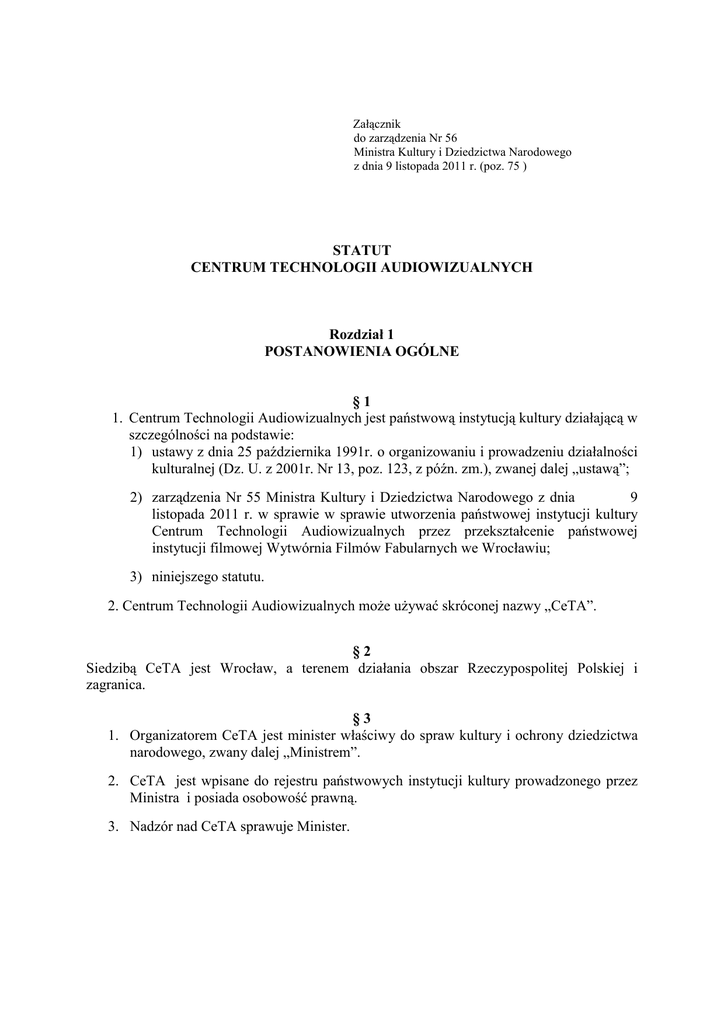 Załącznik do zarządzenia Nr 56 Ministra Kultury i Dziedzictwa Narodowego z dnia 9 listopada 2011 r. (poz. 75 ) STATUT CENTRUM TECHNOLOGII AUDIOWIZUALNYCH Rozdział 1 POSTANOWIENIA OGÓLNE §1 1. Centrum Technologii Audiowizualnych jest państwową instytucją kultury działającą w szczególności na podstawie: 1) ustawy z dnia 25 października 1991r. o organizowaniu i prowadzeniu działalności kulturalnej (Dz. U. z 2001r. Nr 13, poz. 123, z późn. zm.), zwanej dalej „ustawą”; 2) zarządzenia Nr 55 Ministra Kultury i Dziedzictwa Narodowego z dnia 9 listopada 2011 r. w sprawie w sprawie utworzenia państwowej instytucji kultury Centrum Technologii Audiowizualnych przez przekształcenie państwowej instytucji filmowej Wytwórnia Filmów Fabularnych we Wrocławiu; 3) niniejszego statutu. 2. Centrum Technologii Audiowizualnych moŜe uŜywać skróconej nazwy „CeTA”. §2 Siedzibą CeTA jest Wrocław, a terenem działania obszar Rzeczypospolitej Polskiej i zagranica. §3 1. Organizatorem CeTA jest minister właściwy do spraw kultury i ochrony dziedzictwa narodowego, zwany dalej „Ministrem”. 2. CeTA jest wpisane do rejestru państwowych instytucji kultury prowadzonego przez Ministra i posiada osobowość prawną. 3. Nadzór nad CeTA sprawuje Minister. Rozdział 2 ZAKRES DZIAŁALNOŚCI §4 1. Przedmiotem działania CeTA jest edukacja i upowszechnianie kultury oraz nowatorskich technik multimedialnych, szczególnie w zakresie rozwiązań dla kinematografii. CeTA realizuje swoje zadania w szczególności przez: 1) tworzenie warunków do moŜliwie szerokiego dostępu do nowatorskich technologii elektronicznych oraz wysokokwalifikowanej kadry specjalistów w dziedzinie nowoczesnych technologii multimedialnych; 2) tworzenie, współtworzenie i promowanie najnowszych technologii w zakresie produkcji wizualnych efektów specjalnych na potrzeby filmu, telewizji i internetu; 3) tworzenie, współtworzenie i świadczenie wysokiej jakości usług produkcyjnych na rzecz podmiotów prowadzących działalność w zakresie kinematografii i telewizji oraz innych podmiotów krajowych i zagranicznych, wykorzystując w procesie produkcji najnowsze technologie elektroniczne oraz nowatorskie techniki multimedialne, w szczególności tzw. wizualne efekty specjalne; 4) prowadzenie profesjonalizacji zawodowej w dziedzinie sztuk wizualnych i audiowizualnych, efektów specjalnych, post produkcji elektronicznej oraz nowoczesnych technologii multimedialnych; 5) produkowanie i koprodukowanie filmów; 6) inicjowanie i prowadzenie prac badawczych nad usprawnieniem procesów technologicznych związanych z produkcją filmową. 2. CeTA moŜe realizować swoje zadania we współpracy z szkołami wyŜszymi w kraju i zagranicą. Rozdział 3 ORGANIZACJA I ZARZĄDZANIE §5 Organami CeTA są: 1) Dyrektor; 2) Rada Programowa, zwana dalej „Radą”. §6 1. Dyrektor zarządza CeTA i reprezentuje je na zewnątrz. 2. Do zadań Dyrektora naleŜy w szczególności: 1) zapewnienie bieŜącej działalności CeTA oraz nadzór nad powierzonym mieniem; 2) przygotowywanie rocznych i wieloletnich programów działania oraz rocznych planów działalności CeTA; 3) nadzór i koordynacja wykonania przygotowanych programów działania i planów działalności CeTA; 4) sporządzanie sprawozdań merytorycznych i sprawozdań finansowych za kaŜdy rok kalendarzowy; 5) racjonalne i efektywne gospodarowanie posiadanymi środkami finansowymi i materialnymi; 6) zapewnienie zachowania ciągłości technicznej i technologicznej CeTA, w tym w zakresie nabywania licencji oraz patentów na sprzęt, programy komputerowe i linie przemysłowe; 7) wydawanie wewnętrznych zarządzeń i regulaminów. 3. Dyrektora powołuje i odwołuje Minister w trybie określonym ustawą. 4. Dyrektor moŜe zarządzać CeTA przekraczającej dwóch. przy pomocy zastępców, w liczbie nie 5. Zastępców dyrektora powołuje i odwołuje Dyrektor. §7 1. CeTA moŜe tworzyć oddziały. 2. Tworzenie, łączenie, przekształcanie i likwidacja oddziałów następuje na podstawie zarządzenia Dyrektora, po wyraŜeniu zgody przez Ministra. 3. Organizację wewnętrzną CeTA oraz zakres zadań komórek organizacyjnych oraz samodzielnych stanowisk pracy określa regulamin organizacyjny nadany przez Dyrektora, w trybie określonym w art. 13 ust. 3 ustawy. §8 1. Rada jest organem doradczym i opiniodawczym Dyrektora CeTA. 2. Do zadań Rady naleŜy w szczególności: 1) opiniowanie rocznych i wieloletnich programów działania, rocznych planów działalności CeTA oraz ocena ich realizacji; 2) analizowanie efektywności działań podejmowanych przez CeTA; 3) poszukiwanie nowych form wsparcia organizacyjnego, koncepcyjnego i finansowego działalności CeTA; 4) wyraŜanie opinii we wszystkich istotnych sprawach związanych z działalnością CeTA. §9 1. W skład Rady wchodzą osoby powoływane na okres 4 lat przez Ministra, na wniosek Dyrektora. 2. Rada liczy nie więcej niŜ 6 członków. 3. Pierwsze posiedzenie Rady zwołuje Dyrektor . 4. Rada na pierwszym posiedzeniu wybiera ze swojego składu w głosowaniu tajnym Przewodniczącego i jego Zastępcę. 5. Przewodniczący zwołuje posiedzenia Rady oraz kieruje jej pracami. 6. W razie nieobecności Przewodniczącego, jego zadania wykonuje zastępca Przewodniczącego. § 10 1. Uchwały Rady zapadają na posiedzeniach w głosowaniu jawnym, z zastrzeŜeniem ust. 2, zwykłą większością głosów, przy obecności co najmniej połowy składu Rady. 2. Tajne głosowanie zarządza się na wniosek co najmniej połowy składu Rady lub Dyrektora. 3. Przewodniczący zwołuje posiedzenia Rady w zaleŜności od potrzeb, nie rzadziej jednak niŜ raz na pół roku. Zawiadomienie o posiedzeniu wraz z przewidywanym porządkiem obrad doręcza się nie później niŜ na 14 dni roboczych przed planowanym terminem posiedzenia. 4. Posiedzenie Rady moŜe być zwołane w trybie nadzwyczajnym na wniosek Ministra, Dyrektora lub co najmniej połowy składu Rad