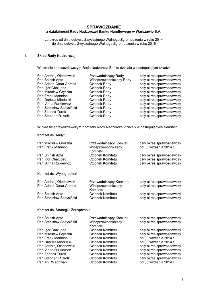 SPRAWOZDANIE z działalności Rady Nadzorczej Banku Handlowego w Warszawie S.A. za okres od dnia odbycia Zwyczajnego Walnego Zgromadzenia w roku 2014 do dnia odbycia Zwyczajnego Walnego Zgromadzenia w roku 2015 I. Skład Rady Nadzorczej W okresie sprawozdawczym Rada Nadzorcza Banku działała w następującym składzie: Pan Andrzej Olechowski Pan Shirish Apte Pan Adnan Omar Ahmed Pan Igor Chalupec Pan Mirosław Gryszka Pan Frank Mannion Pan Dariusz Mioduski Pani Anna Rulkiewicz Pan Stanisław Sołtysiński Pan Zdenek Turek Pan Stephen R. Volk Przewodniczący Rady Wiceprzewodniczący Rady Członek Rady Członek Rady Członek Rady Członek Rady Członek Rady Członek Rady Członek Rady Członek Rady Członek Rady cały okres sprawozdawczy cały okres sprawozdawczy cały okres sprawozdawczy cały okres sprawozdawczy cały okres sprawozdawczy cały okres sprawozdawczy cały okres sprawozdawczy cały okres sprawozdawczy cały okres sprawozdawczy cały okres sprawozdawczy cały okres sprawozdawczy W okresie sprawozdawczym Komitety Rady Nadzorczej działały w następujących składach: Komitet ds. Audytu Pan Mirosław Gryszka Pan Frank Mannion Pan Shirish Apte Pan Igor Chalupec Pani Anna Rulkiewicz Przewodniczący Komitetu Wiceprzewodniczący Komitetu Członek Komitetu Członek Komitetu Członek Komitetu cały okres sprawozdawczy od 30 września 2014 r. Przewodniczący Komitetu Wiceprzewodniczący Komitetu Członek Komitetu Członek Komitetu cały okres sprawozdawczy cały okres sprawozdawczy cały okres sprawozdawczy cały okres sprawozdawczy cały okres sprawozdawczy Komitet ds. Wynagrodzeń Pan Andrzej Olechowski Pan Adnan Omar Ahmed Pan Shirish Apte Pan Stanisław Sołtysiński cały okres sprawozdawczy cały okres sprawozdawczy Komitet ds. Strategii i Zarządzania Pan Shirish Apte Pan Stanisław Sołtysiński Pan Igor Chalupec Pan Mirosław Gryszka Pan Frank Mannion Pan Dariusz Mioduski Pan Andrzej Olechowski Pani Anna Rulkiewicz Pan Zdenek Turek Pan Stephen R. Volk Pan Anil Wadhwani Przewodniczący Komitetu Wiceprzewodniczący Komitetu Członek Komitetu Członek Komitetu Członek Komitetu Członek Komitetu Członek Komitetu Członek Komitetu Członek Komitetu Członek Komitetu Członek Komitetu cały okres sprawozdawczy cały okres sprawozdawczy cały okres sprawozdawczy cały okres sprawozdawczy od 30 września 2014 r. od 30 września 2014 r. cały okres sprawozdawczy cały okres sprawozdawczy cały okres sprawozdawczy cały okres sprawozdawczy od 30 września 2014 r. 1 Komitetu ds. Ryzyka i Kapitału Pan Zdenek Turek Pan Igor Chalupec Pan Frank Mannion Pan Andrzej Olechowski Pan Stephen R. Volk Pan Dariusz Mioduski Pan Anil Wadhwani Przewodniczący Komitetu Wiceprzewodniczący Komitetu Członek Komitetu Członek Komitetu Członek Komitetu Członek Komitetu Członek Komitetu cały okres sprawozdawczy cały okres sprawozdawczy od 30 września 2014 r. cały okres sprawozdawczy cały okres sprawozdawczy cały okres sprawozdawczy od 30 września 2014 r. Rada Nadzorcza wskazuje, iż w jej skład w okresie sprawozdawczym wchodziły osoby posiadające szeroką wiedzę z zakresu prawa, ekonomii, bankowości, zarządzania i finansów. Członkowie Rady posiadają wiedzę praktyczną nabytą podczas sprawowania funkcji kierowniczych w międzynarodowych instytucjach gospodarczych. Rada Nadzorcza ocenia, iż kwalifikacje członków Rady Nadzorczej zapewniają prawidłowe wykonywanie zadań Rady wynikających z obowiązujących przepisów. Struktura Rady, w tym wyodrębnione komitety, wykorzystują doświadczenie i wiedzę Członków Rady przyczyniając się do realizacji postawionych przed Radą Nadzorczą celów. II. OCENA WYNIKÓW FINANSOWYCH I OGÓLNEJ SYTUACJI SPÓŁKI (i) W 2014 roku tempo wzrostu gospodarczego było stosunkowo stabilne, odnotowując najwyższy wzrost w II kwartale, po czym wyhamowywało osiągając poziom 3,3% na przestrzeni całego roku. Z kolei indeks cen towarów i usług nie zmienił się w ujęciu rocznym, na co w dużej mierze miał wpływ spadek cen paliw i żywności. W konsekwencji znacznego spadku inflacji oraz pogarszające się perspektywy wzrostu gospodarczego w II połowie 2014 roku Rada Polityki Pieniężnej (RPP) zdecydowała się obniżyć stopę referencyjną o 50 p.b., a lombardową o 100 p.b. W tym wymagającym otoczeniu rynkowym, Bank osiągnął zysk netto na poziomie 971 milionów złotych, co stanowiło wzrost o 4% w porównaniu do roku poprzedniego. Wysoka efektywność Banku, bezpieczna i stabilna pozycja kapitałowa, to obszary, w których Bank pozytywnie wyróżniał się na tle konkurencji. (i) Do głównych czynników, które miały wpływ na poziom wyniku finansowego w 2014 roku należy zaliczyć spadek wyniku odsetkowego, skompensowany przez konsekwentną dyscyplinę kosztową oraz dodatni wynik odpisów z tytułu utraty wartości aktywów finansowych dzięki dalszej stabilizacji portfela kredytowego Banku. (ii) Przychody operacyjne wyniosły w 2014 roku 2 miliardy 408 milionów złotych i były niższe o 58 milionów złotych, to jest 2,4% od przychodów operacyjnych w 2013 roku, głównie za sprawą spadku wyniku odsetkowego oraz niższego wyniku na inwestycyjnych dłużnych papierach wartościowych. Z drugiej strony pozytywną dynamikę odnotował wynik na handlowych instrumentach finansowych i rewaluacji o 35 milionów złotych, to jest 10,1%, będący efektem wyższego wyniku z tytułu działalności na rynku międzybankowym. (iii) W 2014 roku, tak samo jak w 2013 rok Bank poświęcił dużą uwagę na utrzymanie dyscypliny kosztowej. W porównaniu do 2013 roku odnotowano spadek kosztów o 82 miliony złotych, to jest 6,2% wynikający głównie z oszczędności restrukturyzacyjnych częściowo reinwestowanych w transformację oddziałów (w tym Bankowy Ekosystem Smart), technologię oraz marketing. 2 III. (iv) W 2014 roku miała miejsce dalsza stabilizacja jakości portfela kredytowego, co zostało odnotowane w dodatnim wyniku odpisów z ty