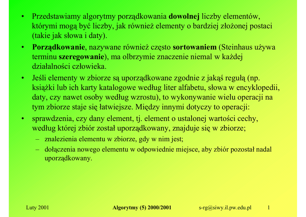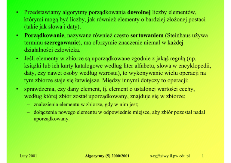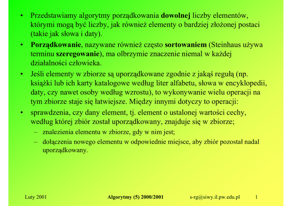 • Przedstawiamy algorytmy porządkowania dowolnej liczby elementów, którymi mogą być liczby, jak również elementy o bardziej złożonej postaci (takie jak słowa i daty). • Porządkowanie, nazywane również często sortowaniem (Steinhaus używa terminu szeregowanie), ma olbrzymie znaczenie niemal w każdej działalności człowieka. • Jeśli elementy w zbiorze są uporządkowane zgodnie z jakąś regułą (np. książki lub ich karty katalogowe według liter alfabetu, słowa w encyklopedii, daty, czy nawet osoby według wzrostu), to wykonywanie wielu operacji na tym zbiorze staje się łatwiejsze. Między innymi dotyczy to operacji: • sprawdzenia, czy dany element, tj. element o ustalonej wartości cechy, według której zbiór został uporządkowany, znajduje się w zbiorze; – znalezienia elementu w zbiorze, gdy w nim jest; – dołączenia nowego elementu w odpowiednie miejsce, aby zbiór pozostał nadal uporządkowany. Luty 2001 Algorytmy (5) 2000/2001 [email protected] 1 • Komputery w dużym stopniu zawdzięczają swoją szybkość temu, że działają na uporządkowanych informacjach. • Jeśli chcemy na przykład sprawdzić, czy w jakimś katalogu dyskowym znajduje się plik, to najpierw odpowiednio porządkujemy listę plików. • Producenci komputerów w 1973 r. szacowali, że przez ponad 25% czasu pracy komputera jest wykonywane porządkowanie. Obecnie porządkowanie to (wobec większego skomplikowania programów) zajmuje jeszcze więcej czasu. (Porządkowanie jest także podstawową operacją wykonywaną na bazach danych.) • Omawiane algorytmy porządkowania mogą być stosowane do ciągów zawierających dowolna liczbę elementów. • Dwa pierwsze algorytmy są realizacjami bardzo naturalnych pomysłów wynikających wprost z definicji problemu porządkowania. • Omówimy także sposób sortowania informacji innych niż liczby (słowa lub rekordy). Luty 2001 Algorytmy (5) 2000/2001 [email protected] 2 Algorytm bąbelkowy • Opiera się on na bardzo prostej koncepcji: jeśli ciąg nie jest uporządkowany, to znajdują się w nim przynajmniej dwa elementy, które nie są na właściwych miejscach - przestawiamy je i postępujemy tak, aż wszystkie będą na właściwych miejscach. • Można nieco uprościć to postępowanie. Zauważmy, że: – jeśli ciąg zawiera dwa elementy, które nie są jeszcze ustawione we właściwej kolejności, to istnieją w nim dwa elementy, które stoją obok siebie i nie są we właściwej kolejności. – Na przykład, w ciągu {2, 4, 6, 1, 3, 5} elementy 4 i 3 nie są we właściwym miejscu, ale istnieją dwa elementy 6 i 1 stojące obok siebie, które również nie są odpowiednio uszeregowane. – Z kolei po ich przestawieniu, elementy 4 i 1 oraz 6 i 3 znajdą się na niewłaściwych pozycjach. – Zatem, w ciągu nieuporządkowanym wystarczy przestawić ze sobą elementy, które są ustawione w złym porządku i znajdują się na sąsiednich miejscach. Luty 2001 Algorytmy (5) 2000/2001 [email protected] 3 • Aby tę strategię porządkowania zamieniæ na algorytm, musimy określić dodatkowo, w jakim porządku będziemy szukać takich par do przestawienia. – Z jednej strony bowiem nie możemy pominąć żadnej z nich. – Z drugiej - chcemy to robić w możliwie najbardziej efektywny sposób. • Algorytm bąbelkowy jest metodą porządkowania ciągów, która polega na przestawianiu sąsiednich par elementów stojących w nieodpowiedniej kolejności, przy czym ciąg jest przeglądany w tym samym kierunku tak długo, jak długo może w nim wystąpić jeszcze para elementów w niewłaściwym porządku. • Oznacza to, że po każdym przestawieniu dwóch elementów należy sprawdzić, czy ta zmiana nie zepsuła właściwego uporządkowania między innymi sąsiednimi elementami. • Elementy o większych wartościach są wynoszone wyżej, jakby przywiązane zostały do nich większe bąbelki powietrza - stąd nazwa algorytmu. • Klamrami oznaczone są zamiany elementów. – Poziome linie to granica o obszaru, w którym nie trzeba wykonywać już przestawień. • Przykład ilustruje, że wraz z liczbą kroków zwiększa się liczba elementów, które stoją na właściwym miejscu. Luty 2001 Algorytmy (5) 2000/2001 [email protected] 4 Przykład sortowania bąbelkowego Luty 2001 9 10 10 10 10 7 9 9 9 9 1 7 7 7 7 10 1 4 4 4 4 4 1 3 3 2 3 3 1 2 3 2 2 2 1 Algorytmy (5) 2000/2001 [email protected] 5 • Dane: • Wynik: • Krok 1: • Krok 2: • Krok 3: Algorytm bąbelkowy porządkowania ciagu liczb Liczba naturalna n i ciąg n liczb x1, x2,...,xn Uporządkowanie tego ci¹gu liczb od najmniejszej do największej. Kres := n {Kres określa miejsce w ciągu, oznaczone na rysunku czerwoną linią stanowiące granicę poszukiwania pary elementów do przestawiania.} Przyjmij i:=1 oraz k:= 0 {k jest wskaźnikiem przestawionej pary} Dopóki i < Kres, wykonuj: – jeśli xi > xi + 1 , to przestaw te dwa elementy i przyjmij k := i – zwiększ i: i:= i + 1 • Krok 4: Luty 2001 Jeśli k > 1, to przyjmij Kres :=k i wróć do kroku 2, a w przeciwnym razie zakończ algorytm. Algorytmy (5) 2000/2001 [email protected] 6 Porządkowanie przez wybór • Algorytm opisany w tym punkcie można, podobnie jak algorytm bąbelkowy, wyprowadzić niemal z definicji problemu porządkowania. Zauważymy, że: – jeśli mamy ustawić elementy ciągu w kolejności od najmniejszego do największego, to można wybrać w nim najpierw element najmniejszy i umieścić go na początku, – za nim umieścić drugi najmniejszy element ciągu ( czyli najmniejszy w pozostałym ciągu) itd. • Metoda ta nazywa się algorytmem porządkowania przez wybór. • Do jej dokładnego opisania jesteśmy już przygotowani, gdyż poznaliśmy szybką (wręcz optymalną) metodę znajdowania najmniejszego elementu w ciągu. • Musimy jedynie podać, w jaki sposób kolejno znajdowane elementy, od najmniejszego do największego, mają być ustawione jeden za drugim. • 