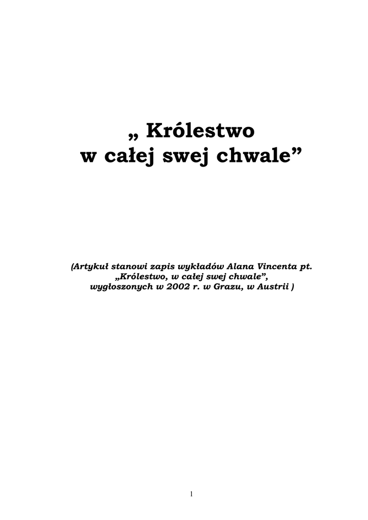 „ Królestwo w całej swej chwale” (Artykuł stanowi zapis wykładów Alana Vincenta pt. „Królestwo, w całej swej chwale”, wygłoszonych w 2002 r. w Grazu, w Austrii ) 1 Wstęp Przez kilkaset lat Kościół wierzył, że nic więcej nie można zrobić w sprawie Królestwa Bożego, do czasu aż Jezus fizycznie powróci na ziemię. Szatan miał stawać się coraz silniejszy, a Kościół miał stale słabnąć. Szatan miał zawładnąć całą ziemią. Na chwilę przed tym, zanim udałoby mu się wszystko zniszczyć, miał pojawić się Jezus i uratować Kościół, który o mały włos zostałby unicestwiony na dobre. Przez ostatnie 200 lat Kościół wierzył, że tak właśnie będzie. W 1965 r. w Bombaju w Indiach, gdy przynależałem do jedynego tamtejszego zboru, tworzyliśmy niewielką społeczność baptystów, składającą się z pięciu osób, z których żadna nie była wtedy zbawiona. Jedynym powodem, dla którego zborownicy przychodzili na nabożeństwa był fakt, że budynek miał dużą wartość. Tych pięciu zborowników to były dwie rodziny i każda z nich chciała, aby ta druga opuściła budynek, by można było go przejąć. Obie rodziny procesowały się bowiem o prawa do niego. Czy możecie sobie wyobrazić bardziej ponurą sytuację niż ta? Zacząłem z całej siły szukać Ducha Świętego. W przeciwieństwie do mojego tradycyjnego wychowania, byłem ochrzczony w Duchu Świętym, i w związku z tym przeżyłem kilka rzeczy. Zacząłem mówić językami – do dzisiaj nie mogę zrozumieć tej dziwnej mowy. Jeśli jednak robię to, o czym mówi Biblia, czyli często modlę się innymi językami, coś dzieje się w moim duchu. Więc nie przestawałem. Modliłem się wtedy na językach więcej niż kiedykolwiek wcześniej. Odkryłem moc tego tajemniczego daru. W tamtym okresie przytrafiło mi się jeszcze coś. Nie była to wizja, lecz zmiana duchowego zrozumienia. Zawsze wierzyłem teologii, ale niekoniecznie rozpatrywałem ją w duchowy sposób. Zobaczyłem moc, chwałę i autorytet zmartwychwstałego Jezusa. Duch objawił mi ogromny triumf i zwycięstwo Jezusa na krzyżu. Nagle wszystko inne zaczęło maleć, a On był ponad wszystkim. Równie ważne było to, iż zobaczyłem, że byłem z Nim w autorytecie wynikającym z chwalebnego zmartwychwstania. Do tego czasu chodziłem ulicami Bombaju, patrząc na działalność demonów i myśląc: „Co za ciemne i demoniczne miasto.” Widziałem ich działalność wszędzie. A nasz zbór był jedynym światłem w całym mieście. Po tym objawieniu wszystko się zmieniło. Zamiast siły szatana zacząłem widzieć moc Jezusa. Zacząłem czuć oburzenie, że w tym mieście Jezus nie był wystarczająco wywyższony. Wydawało mi się, że Duch może posłużyć się każdym, nawet kimś takim jak ja, aby przemienić to miasto. Zacząłem więc współdziałać z Duchem Świętym. Wtedy stało się coś jeszcze innego. Pewnego dnia odwiedził mnie człowiek, który mówił z amerykańskim akcentem. Nie znałem go i nigdy wcześniej go nie spotkałem. Zapukał do drzwi mojego biura w zborze i powiedział: „Bóg posłał mnie, abym przemawiał do liderów.” W ręku trzymał torbę, w której były książki. Powiedział do mnie: „Oto wieść od Boga: Musisz widzieć Królestwo, musisz uwierzyć w Królestwo, musisz głosić Królestwo i musisz poszerzać Królestwo. Wtedy ujrzysz chwałę Boga w swoim mieście.” Wręczył mi książkę napisaną przez człowieka, który poświęcił swoje życie misjom w Indiach. Nazywał się Dr. E Stanley Jones i lata wcześniej napisał właśnie tę książkę pt „Niezachwiane Królestwo i niezmieniony człowiek”. Mój gość podarował mi tę książkę i powiedział, że muszę ją przeczytać, uwierzyć w to, co jest tam napisane i głosić to. Zaraz potem wyszedł. Efektem tej lektury była moja przemiana. Zacząłem widzieć Królestwo Boże. Dostałem objawienie na jego temat. Zacząłem je również głosić. Inni dołączyli do mnie i z mocą zaczęliśmy poszerzać Królestwo Boże. Pierwsza rzecz, która się zmieniła to nasz zbór, który stał się żywy, mocny i skuteczny. Cuda w zborze stały się codziennością. Kiedyś pewien opętany człowiek przyszedł na nasze nabożeństwo. Zgromiłem demony w imieniu Jezusa, a człowiek ten upadł na ziemię. Demony wychodziły, a ludzie 2 byli przemieniani. To wszystko działo się w zborze, który wcześniej uznawany był za szanowaną społeczność baptystów. Może nie byliśmy już wtedy szanowani, ale z pewnością staliśmy się bliżsi wzorca biblijnego. Chcecie by wasz zbór był szanowany czy biblijny? Co jest ważniejsze? Mogliśmy wtedy spocząć na laurach i cieszyć się tym, że mamy żywy zbór, który odniósł sukces. Mogliśmy jeździć do innych zborów i opowiadać jak Bóg nam błogosławił. Bóg jednak coś mi pokazał: On nie był zadowolony z tego, że ma żywy zbór w mieście będącym w rękach demonów. On chciał zdobyć całe miasto. Pokazał mi, że pięciomilionowe miasto nie jest zbyt dużym wyzwaniem dla Boga. Siedem lat później opuściłem ten zbór, aby zacząć zakładać nowe społeczności w pogańskich częściach miasta. Najbardziej zdemonizowaną i grzeszną częścią miasta był obszar zdominowany przez kościół katolicki. Wiadomo było, że większość kryminalistów i pijaków wywodzi się właśnie z tej części. Mieszkało tam ponad milion ludzi. Bóg powiedział do mnie: „Idź i zacznij właśnie tam!” Założyliśmy więc tam zbór. Na własne oczy oglądaliśmy, jak Bóg wyrywa czterdziestu ludzi pochodzących z najstraszniejszych środowisk. To nie była przemiana w ciągu jednego dnia - Bóg przygotowywał nas do walki. Każda z tych czterdziestu osób została uwolniona i przemieniona dzięki Bożemu cudowi. Wtedy jednak, moc demoniczna rządząca tym obszarem zaatakowała nas. Żyliśmy w zagrożeniu na wiele sposobów. Liczebność naszego z