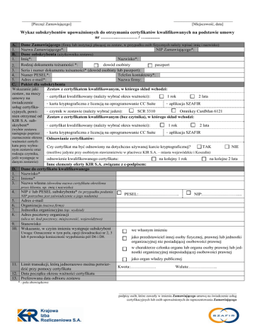 _______________________ _______________________ [Pieczęć Zamawiającego] [Miejscowość, data] Wykaz subskrybentów upoważnionych do otrzymania certyfikatów kwalifikowanych na podstawie umowy nr ………..…………. / …............ A. 1. B. 1. Dane Zamawiającego (firmy lub instytucji płacącej za zestaw, w przypadku osób fizycznych należy wpisać imię i nazwisko) Nazwa Zamawiającego*: NIP Zamawiającego*: Dane subskrybenta (użytkownika zestawu) Imię*: Nazwisko*: dowód osobisty paszport 2. Rodzaj dokumentu tożsamości *: 3. Seria i numer dokumentu tożsamości* (dowód osobisty lub paszport): 4. Numer PESEL*: Telefon kontaktowy*: 5. Adres e-mail*: Nazwa firmy: C. Pakiet dla subskrybenta Wskazanie jaki Zestaw z certyfikatem kwalifikowanym, w którego skład wchodzi: zestaw, na mocy - certyfikat kwalifikowany (należy wybrać okres ważności): 1 rok 2 lata umowy na świadczenie - karta kryptograficzna z licencją na oprogramowanie CC Suite - aplikacja SZAFIR usług certyfika- czytnik w zestawie (należy wybrać jeden): SCR 3310 Omnikey CardMan 6121 cyjnych, powinien otrzymać od Zestaw z certyfikatem kwalifikowanym (bez czytnika), w którego skład wchodzi: KIR S.A. subskrybent* - certyfikat kwalifikowany (należy wybrać okres ważności): 1 rok 2 lata (wybór zestawu następuje poprzez zaznaczenie okresu ważności certyfikatu przy wybranym zestawie oraz rodzaju czytnika, jeśli występuje w danym zestawie) D. 1. 2. 3. - karta kryptograficzna z licencją na oprogramowanie CC Suite - aplikacja SZAFIR Odnawianie certyfikatów: Czy certyfikat ma być odnowiony na dotychczas używanej karcie kryptograficznej? TAK NIE (możliwe jedynie przy osobistym stawiennictwie w placówce KIR S.A. – miasta wojewódzkie i Koszalin) odnowienie kwalifikowanego certyfikatu: Inne elementy oferty KIR S.A. związane z e-podpisem: Dane do certyfikatu kwalifikowanego Nazwisko* Imiona* Nazwa własna (dowolna nazwa certyfikatu określona na kolejny 1 rok na kolejne 2 lata przez klienta, np. imię i nazwisko) 4. NIP i/ lub PESEL subskrybenta* (w przypadku podania NIP potrzebne jest zaświadczenie o jego nadaniu) 5. 6. 7. 8. PESEL:……………………….. NIP:……………………..... Adres e-mail Organizacja (nazwa firmy) Jednostka organizacyjna (np. wydział) Adres pocztowy organizacji (ulica nr, kod pocztowy, miejscowość, województwo) 9. Stanowisko 10. Wskazanie, w czyim imieniu występuje subskrybent Uwaga: Oznaczenie w tym polu, opcji (kwadracika) nr 2, 3 lub 4 powoduje konieczność wypełnienia pól D6 i D8. we własnym imieniu jako przedstawiciel innej osoby fizycznej, prawnej lub jednostki organizacyjnej nie posiadającej osobowości prawnej w charakterze członka organu lub organu osoby prawnej lub jednostki organizacyjnej nieposiadającej osobowości prawnej jako organ władzy publicznej 11. Limit transakcji, którą jednorazowo można potwierdzić przy pomocy certyfikatu 12. Data początku okresu ważności certyfikatu 13. Preferowana data odbioru zestawu Kwota:……………… Waluta:……………….. * - pola obowiązkowe _______________________________________________________ podpisy osób, które zawarły w imieniu Zamawiającego umowę na świadczenie usług certyfikacyjnych lub osób upoważnionych do reprezentowania Zamawiającego