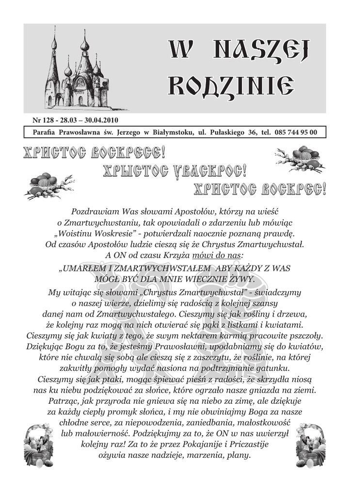 Nr 28.03 – 30.04.2010 Nr128 102;- 05.03. 15.04. 2006 Parafia Prawosławna św. Jerzego w Białymstoku, ul. Pułaskiego 36, tel. 085 744 95 00 ХРИСТОС ВОСКРЕСЕ! ХРЫСТОС УВАСКРОС! ХРИСТОС ВОСКРЕС! Pozdrawiam Was słowami Apostołów, którzy na wieść o Zmartwychwstaniu, tak opowiadali o zdarzeniu lub mówiąc „Woistinu Woskresie” - potwierdzali naocznie poznaną prawdę. Od czasów Apostołów ludzie cieszą się że Chrystus Zmartwychwstał. A ON od czasu Krzyża mówi do nas: „UMARŁEM I ZMARTWYCHWSTAŁEM ABY KAŻDY Z WAS MÓGŁ BYĆ DLA MNIE WIECZNIE ŻYWY. My witając się słowami „Chrystus Zmartwychwstał” - świadczymy o naszej wierze, dzielimy się radością z kolejnej szansy danej nam od Zmartwychwstałego. Cieszymy się jak rośliny i drzewa, że kolejny raz mogą na nich otwierać się pąki z listkami i kwiatami. Cieszymy się jak kwiaty z tego, że swym nektarem karmią pracowite pszczoły. Dziękując Bogu za to, że jesteśmy Prawosławni, upodabniamy się do kwiatów, które nie chwalą się sobą ale cieszą się z zaszczytu, że roślinie, na której zakwitły pomogły wydać nasiona na podtrzymanie gatunku. Cieszymy się jak ptaki, mogąc śpiewać pieśń z radości, że skrzydła niosą nas ku niebu podziękować za słońce, które ogrzało nasze gniazda na ziemi. Patrząc, jak przyroda nie gniewa się na niebo za zimę, ale dziękuje za każdy ciepły promyk słońca, i my nie obwiniajmy Boga za nasze chłodne serce, za niepowodzenia, zaniedbania, małostkowość lub małowierność. Podziękujmy za to, że ON w nas uwierzył kolejny raz! Za to że przez Pokajanije i Priczastije ożywia nasze nadzieje, marzenia, plany. W tym Dniu, w którym ożywa Ziemia, raduje się Niebo, nam nie wypada milczeć.- Korzystając z możliwości życzę każdej Rodzinie i każdemu z osobna, by Chrystus mógł wejść do naszych domów i serc. Aby mógł błogosławić Nas zdrowiem – abyśmy odczuli Jego obecność. Aby podał wszelkiego dobra pod dostatkiem, jak kiedyś podawał chleb uczniom. Słabych w wierze niech umocni jak apostoła Tomasza. Utrudzonym, zaniepokojonym niech Anioł odwali kamień z serca – jak kiedyś kamień z grobu niewiastom. A po zdrowych świętach niech każdemu z nas Bóg da zdrowie na pokonywanie trudności a siły – by Bożymi zostawać zawsze! WOISTINU WOSKRESIE CHRYSTOS!!! o. Grzegorz W NASZEJ PARAFII Oddając do druku Gazetkę nie jesteśmy pewni, czy dzwony dotrą do nas na Palmową Niedzielę, czy na początku Wielkiego Tygodnia. Wiadomo tylko, że już opuściły ludwisarnię i dotarły do miejsca, gdzie będą dopasowywane serca, tak by dzwony mogły służyć bardzo długo. Brak rysunków konstrukcyjnych dzwonnicy sprawił, że dzwony do czasu wybudowania dzwonnicy musimy tymczasowo zawiesić na metalowej konstrukcji, ustawionej na miejscu gdzie był ołtarz w starej cerkwi. W przyszłości, gdy dzwony będą już mogły być zawieszone na swoim miejscu, wykonana konstrukcja posłuży jako kapliczka, w której będą odbywały się nabożeństwa poświęcania wody. Trwają prace wyrównania terenu wokół cerkwi. Wierzymy że uporamy się z pracami na czas a procesje Wielkiego Piątku oraz Paschalne będą odbywać się wygodnie i bezpiecznie. Zlecono Panu inż. Bernackiemu wykonanie trzech kompletów drzwi wejściowych do górnej cerkwi, zgodnie ze szkicem dostarczonym przez architekta dr Jerzego Uścinowicza. W założeniu jest to konstrukcja, która w mia- rę posiadanych środków będzie uzupełniona o ikony lub symbole (wykonane w blasze na przykład metodą tłoczenia lub czekanką). Ważne, że koszty można będzie rozłożyć w czasie, na przykład na kilka lat. Wykonywane są również przęsła balustrad na pochylnię i schody. Były przypadki, że dzieci, nieświadome zagrożenia, skakały z wysokości dwu metrów! Odkładanie wykonania balustrad groziłoby odpowiedzialnością za ewentualny wypadek na placu budowy! Również przechodzenie z procesją nocą po niezabezpieczonym terenie stanowiłoby zagrożenie. Wzorem minionych lat w Wielki Poniedziałek w naszej cerkwi będzie Sakrament namaszczenia chorych, połączony z Sakramentem Pokajanija (spowiedzią) oraz Priczastijem podczas Świętej Liturgii Preżdieoswiaszczennych Darow. Spowiedź rozpoczniemy już o godz. 1300. O godz. 1400 rozpoczną się modlitwy Sakramentu Namaszczenia Chorych a o godz. 1600 – Liturgia i Priczastije. Jeżeli ktoś jest bardzo chory i nie może bez posiłku i wody pozostawać do późnych godzin popołudniowych – w oznaczonych godzinach może przystąpić do spowiedzi i Namaszczenia, natomiast do Priczastija, już na czczo, przystąpić w Wielki Wtorek rano. Spowiedź w przeddzień Priczastija jest nawet pożądana, gdyż pozwala na dłuższe dokładniejsze przemyślenia. Spowiedź zaczyna się przy anałojczyku, w obecności duchownego, a kończy się w momencie podejścia do Priczastija! Nie śpieszmy się! Dajmy szansę dla duszy na rozmowę z Bogiem-Stwórcą! Spowiedź to uświadomienie sobie tego, o czym Bóg WIE! To powiedzenie Bogu: „ja też widzę i wstydzę się moich błędów, słów..” Jeżeli tak powiemy wieczorem i z tym idziemy do Boga rano i jeszcze Mu dopowiemy zapomniane, to będzie więcej radości Bogu i nam! W Wielki Piątek od rana sprzątanie cerkwi i przygotowanie grobnicy. – W tym roku kwiaty go Płaszczanicy kupujemy jednakowe za ofiary złożone przez naszych dobrych Parafian. Jeżeli ktoś nie wiedząc o naszym zamiarze, przyniesie własną wiązankę, niech nie gniewa się za to, że prisłużniki postawią ją w innym miejscu przed którąś z ikon. Święcenie Pokarmów tradycyjnie będzie odbywać w przedsionku cerkwi, na przygotowanych stołach. Wierzymy, że wzorem lat ubiegłych zebranymi pisankami można będzie podzielić się dziećmi oraz z potrzebującymi. Wszyscy, którzy podczas Wielkiego Postu przystąpili przynajmniej do Sakramentów P