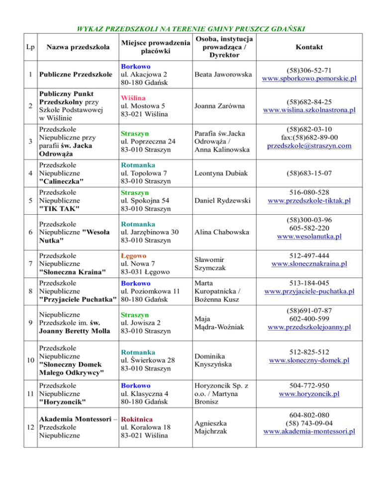 WYKAZ PRZEDSZKOLI NA TERENIE GMINY PRUSZCZ GDAŃSKI