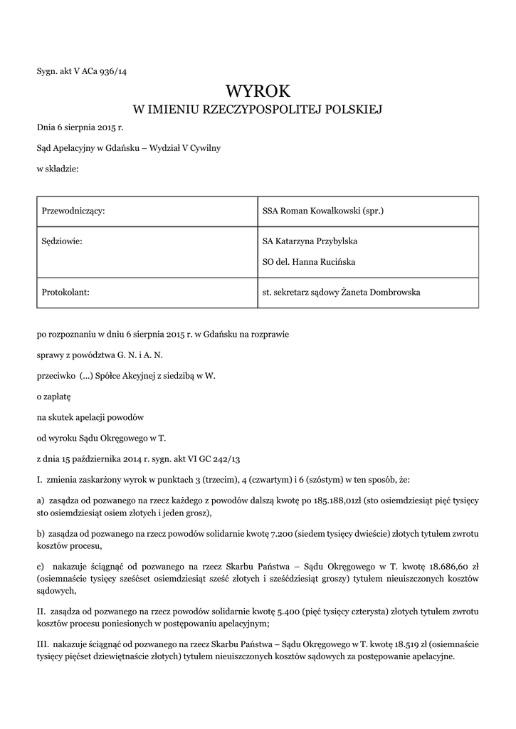 Sygn. akt V ACa 936/14 WYROK W IMIENIU RZECZYPOSPOLITEJ POLSKIEJ Dnia 6 sierpnia 2015 r. Sąd Apelacyjny w Gdańsku – Wydział V Cywilny w składzie: Przewodniczący: SSA Roman Kowalkowski (spr.) Sędziowie: SA Katarzyna Przybylska SO del. Hanna Rucińska Protokolant: st. sekretarz sądowy Żaneta Dombrowska po rozpoznaniu w dniu 6 sierpnia 2015 r. w Gdańsku na rozprawie sprawy z powództwa G. N. i A. N. przeciwko (...) Spółce Akcyjnej z siedzibą w W. o zapłatę na skutek apelacji powodów od wyroku Sądu Okręgowego w T. z dnia 15 października 2014 r. sygn. akt VI GC 242/13 I. zmienia zaskarżony wyrok w punktach 3 (trzecim), 4 (czwartym) i 6 (szóstym) w ten sposób, że: a) zasądza od pozwanego na rzecz każdego z powodów dalszą kwotę po 185.188,01zł (sto osiemdziesiąt pięć tysięcy sto osiemdziesiąt osiem złotych i jeden grosz), b) zasądza od pozwanego na rzecz powodów solidarnie kwotę 7.200 (siedem tysięcy dwieście) złotych tytułem zwrotu kosztów procesu, c) nakazuje ściągnąć od pozwanego na rzecz Skarbu Państwa – Sądu Okręgowego w T. kwotę 18.686,60 zł (osiemnaście tysięcy sześćset osiemdziesiąt sześć złotych i sześćdziesiąt groszy) tytułem nieuiszczonych kosztów sądowych, II. zasądza od pozwanego na rzecz powodów solidarnie kwotę 5.400 (pięć tysięcy czterysta) złotych tytułem zwrotu kosztów procesu poniesionych w postępowaniu apelacyjnym; III. nakazuje ściągnąć od pozwanego na rzecz Skarbu Państwa – Sądu Okręgowego w T. kwotę 18.519 zł (osiemnaście tysięcy pięćset dziewiętnaście złotych) tytułem nieuiszczonych kosztów sądowych za postępowanie apelacyjne. Na oryginale właściwe podpisy Sygn. akt V ACa 936/14 UZASADNIENIE Powodowie G. N. i A. N. wnieśli pozew przeciwko pozwanemu (...) S.A. w W. domagając się zasądzenia od pozwanego na rzecz każdego z powodów kwoty po 214.787,93zł. W uzasadnieniu powodowie wskazali, że w dniu 12 lutego 2010r. (...) spółka jawna, w której powodowie uczestniczyli jako wspólnicy, zawarła z pozwanym umowę ubezpieczenia budynków piekarni przy ul. (...) w C., m.in. od ognia i innych żywiołów na kwotę 300.000zł. Umowa ta obejmowała również maszyny i urządzenia znajdujące się w budynkach piekarni, które zostały ubezpieczone na kwotę 335.000,00zł. W czasie trwania ochrony ubezpieczeniowej – 3 lutego 2011r. w budynku piekarni wybuchł pożar, którego źródeł nie ustalono. Policja umorzyła postępowanie wobec niewykrycia sprawcy. Budynek uległ poważnemu uszkodzeniu. Część maszyn i urządzeń została całkowicie zniszczona. Pozwany uznając swoją odpowiedzialność wyliczył wartość szkody w budynku początkowo na kwotę 314.060,66 zł, a wartość urządzeń na kwotę 499.579,00 zł. Pozwany powołał się na niedoubezpieczenie poszczególnych składników mienia. Powodowie nie zgodzili się z tymi wartościami. Zdaniem powodów instytucja niedoubezpieczenia nie może w żadnym razie stanowić dodatkowej sankcji dla ubezpieczonego w sytuacji gdy wartość szkody przewyższa sumę ubezpieczenia. Niedoubezpieczenie czyli tzw. udział własny ubezpieczonego w szkodzie, może stanowić tylko i wyłącznie o tej części szkody, której wartość przewyższa określoną w umowie sumę ubezpieczenia. Powodowie wskazali też, iż w ogólnych warunkach ubezpieczenia wydanych przez pozwanego nie zawarto pojęcia szkody całkowitej. Pozwany nie wskazał, ani limitu wartości zniszczonego mienia, ani nie podał żadnych wskaźników umożliwiających sklasyfikowanie szkody jako zupełnej. Według powodów należne im odszkodowanie może być ograniczone jedynie górną granicą ustalonej wcześniej sumy ubezpieczenia. Powodowie otrzymali od pozwanego odszkodowanie w kwocie 205.424,14 zł. Pozwany (...) S.A. w W. w odpowiedzi na pozew wniósł o oddalenie powództwa i o zasądzenie kosztów procesu. W uzasadnieniu swego stanowiska pozwany przyznał, że ubezpieczał w/w budynek i środki obrotowe na podstawie umowy ubezpieczenia zawartej na okres od 13 lutego 2010r. do 12 lutego 2011 r. W wyniku dokonanych ustaleń odszkodowanie za spalony budynek zostało wyliczone na kwotę 66.427,99 zł na zasadzie proporcji z uwzględnieniem sumy ubezpieczenia budynku 300.000,00 zł oraz wartości odtworzeniowej 1.418.350,74 zł. Przy obliczaniu odszkodowania pozwany oparł się na postanowieniach umowy - § 54 ust.13. Równolegle pozwany prowadził likwidację szkody w zakresie uszkodzonych maszyn. Ich wartość oraz koszt naprawy zostały wyliczone przez rzeczoznawcę M. P.. W rezultacie pozwany wypłacił powodom odszkodowanie w łącznej kwocie 205.424,14 zł, w tym 66.427,99 zł za budynek i 128.996,15 zł za maszyny oraz 10.000,00 zł za środki obrotowe. Pozwany wskazał, iż podstawową kwestią sporną między stronami jest zastosowanie przez pozwanego zasady proporcji przy ustalaniu odszkodowania. Pozwany podkreślił, iż powodowie ubezpieczyli budynek i maszyny w wartości odtworzeniowej. Przy ubezpieczeniu na sumy stałe ubezpieczający określa sumę ubezpieczenia i powinna ona odpowiadać w tym przypadku wartości odtworzeniowej. W sytuacji gdy suma ubezpieczenia nie odpowiada wartości odtworzeniowej chociażby w przybliżeniu, w myśl ogólnych warunków ubezpieczeń zachodzi niedoubezpieczenie mienia w przypadku szkody częściowej i odszkodowanie ulega zmniejszeniu w takim stosunku w jakim pozostaje suma ubezpieczenia do wartości odtworzeniowej mienia w zależności od wartości mienia zadeklarowanej do ubezpieczenia. Pozwany nie zgodził się z twierdzeniami powodów, że miała miejsce szkoda całkowita i powodom należy się odszkodowanie do wysokości sumy ubezpieczenia. Pozwany wskazał też, iż wbrew zarzutom powodów, zapis ogólnych warunków bezpieczeń jest całkowicie czytelny, zwłaszcza dla osoby prowadzącej działalność gospodarczą w formie spółki. Sąd Okręgowy w T. wyrokiem z dnia 15 października 2014r. zasądził 