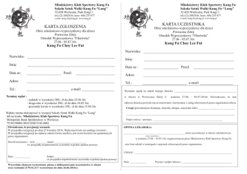 32-020 Wieliczka, Park Kingi 1 tel.(12) 2882416, kom. 606 235 877 e-mail: [email protected], www.lung.pl KARTA ZG£OSZENIA Obóz szkoleniowo-wypoczynkowy dla dzieci Piwniczna Zdrój Oœrodek Wypoczynkowy “Filarówka” 27.06 - 05.07.16r. Kung Fu Choy Lee Fut Nazwisko: _________________________________________________ Imiê: _________________________________________________ Data ur.: ___________________ Pesel: ______________________ Adres: _________________________________________________ Tel.: ________________________ e-mail: __________________ Terminy wp³at : - zadatek w wysokoœci 500,- z³ do dnia 25.04.16r. - druga rata w wysokoœci 500,- z³ do dnia 24.05.16r. - pozosta³a kwota w wysokoœci 350,- z³ do dnia 15.06.16r. Wp³aty mo¿na dokonywaæ w recepcji Szko³y Sztuk Walki Kung Fu “Lung” lub na konto: M³odzie¿owy Klub Sportowy Kung Fu Ma³opolski Bank Spó³dzielczy w Wieliczce 79 86190006 0010 0200 9146 0002 Oœwiadczam, ¿e przyjmujê warunek: W przypadku rezygnacji po dniu 25 kwietnia 2016r. Wp³acona kwota nie podlega zwrotowi. W przypadku rezygnacji po wp³acie ca³oœci kwoty mo¿liwy jest zwrot kosztów nie poniesionych przez organizatora. Dowód to¿samoœci : seria _________ numer _________________________ (w przypadku niepe³noletnoœci uczestnika wype³nia opiekun prawny) Data: _____________ Podpis ______________________________________ (w przypadku niepe³noletnoœci uczestnika wype³nia opiekun prawny) Wszystkim chêtnym wystawiamy pisma o dofinansowanie uczestnictwa w obozie oraz rachunki (UWAGA!!! wystawiane do dnia 26.06.2016r.) ----------------------------------------------------------------------------- M³odzie¿owy Klub Sportowy Kung Fu Szko³a Sztuk Walki Kung Fu “Lung” M³odzie¿owy Klub Sportowy Kung Fu Szko³a Sztuk Walki Kung Fu “Lung” 32-020 Wieliczka, Park Kingi 1 tel.(12) 2882416, kom. 606 235 877 e-mail: [email protected], www.lung.pl KARTA UCZESTNIKA Obóz szkoleniowo-wypoczynkowy dla dzieci Piwniczna Zdrój Oœrodek Wypoczynkowy “Filarówka” 27.06 - 05.07.16r. Kung Fu Choy Lee Fut Nazwisko: _________________________________________________ Imiê: _________________________________________________ Data ur.: ___________________ Pesel: Adres: _________________________________________________ Tel.: ________________________ e-mail: __________________ ______________________ Wyra¿am zgodê na udzia³ mojego dziecka _______________________________________________ w obozie w Piwnicznej Zdrój w terminie 27.06. - 05.07.2016r. Oœwiadczam, ¿e stan zdrowia dziecka pozwala mu na trenowanie i korzystanie z us³ug oferowanych przez organizatora obozu. Uwagi (powa¿niejsze kontuzje, choroby, alergie, za¿ywane leki) ___________________________ _______________________________________________________________________________ Podpis rodzica / opiekuna: _________________________________________________________ OPINIA LEKARSKA: _______________________________________________ mo¿e uczestniczyæ w obozie szkoleniowym ( imiê i nazwisko ). w terminie 27.06. - 05.07.16r. organizowanym przez M³odzie¿owy Klub Sportowy Kung Fu oraz braæ udzia³ w treningach i zajêciach oferowanych przez organizatora. UWAGI : ___________________________________________________________________________ Data: _____________ Pieczêæ i podpis lekarza : ______________________________________
