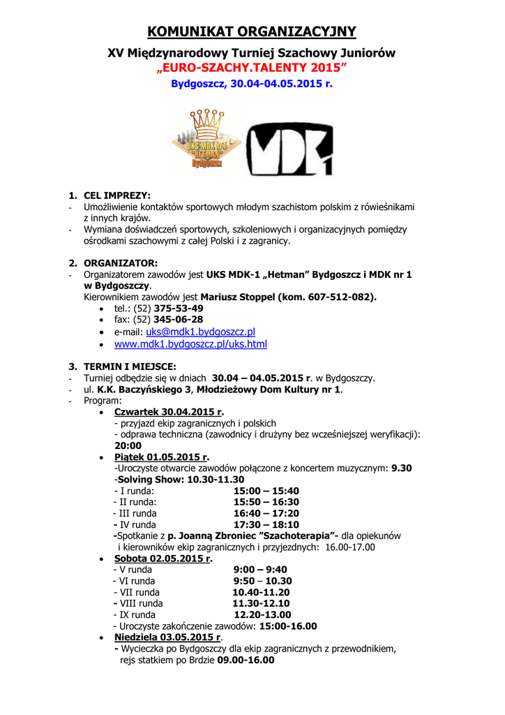 KOMUNIKAT ORGANIZACYJNY XV Międzynarodowy Turniej Szachowy Juniorów „EURO-SZACHY.TALENTY 2015” Bydgoszcz, 30.04-04.05.2015 r. 1. CEL IMPREZY: - Umożliwienie kontaktów sportowych młodym szachistom polskim z rówieśnikami z innych krajów. - Wymiana doświadczeń sportowych, szkoleniowych i organizacyjnych pomiędzy ośrodkami szachowymi z całej Polski i z zagranicy. 2. ORGANIZATOR: - Organizatorem zawodów jest UKS MDK-1 „Hetman” Bydgoszcz i MDK nr 1 w Bydgoszczy. Kierownikiem zawodów jest Mariusz Stoppel (kom. 607-512-082). tel.: (52) 375-53-49 fax: (52) 345-06-28 e-mail: [email protected] www.mdk1.bydgoszcz.pl/uks.html 3. - TERMIN I MIEJSCE: Turniej odbędzie się w dniach 30.04 – 04.05.2015 r. w Bydgoszczy. ul. K.K. Baczyńskiego 3, Młodzieżowy Dom Kultury nr 1. Program: Czwartek 30.04.2015 r. - przyjazd ekip zagranicznych i polskich - odprawa techniczna (zawodnicy i drużyny bez wcześniejszej weryfikacji): 20:00 Piątek 01.05.2015 r. -Uroczyste otwarcie zawodów połączone z koncertem muzycznym: 9.30 -Solving Show: 10.30-11.30 - I runda: 15:00 – 15:40 - II runda: 15:50 – 16:30 - III runda 16:40 – 17:20 - IV runda 17:30 – 18:10 -Spotkanie z p. Joanną Zbroniec ”Szachoterapia”- dla opiekunów i kierowników ekip zagranicznych i przyjezdnych: 16.00-17.00 Sobota 02.05.2015 r. - V runda 9:00 – 9:40 - VI runda 9:50 – 10.30 - VII runda 10.40-11.20 - VIII runda 11.30-12.10 - IX runda 12.20-13.00 - Uroczyste zakończenie zawodów: 15:00-16.00 Niedziela 03.05.2015 r. - Wycieczka po Bydgoszczy dla ekip zagranicznych z przewodnikiem, rejs statkiem po Brdzie 09.00-16.00 - Uroczysta kolacja podsumowująca turniej dla ekip zagranicznych: 20.00 Poniedziałek 04.05.2015 r. -Wyjazd ekip zagranicznych 9.00 4. UCZESTNICTWO: - W turnieju A i B mogą uczestniczyć 3-osobowe drużyny reprezentujące ośrodki szachowe. Drużyna składa się z jednego juniora rocznik 1997 lub młodszy, jednej juniorki rocznik 1997 lub młodsza oraz jednego dziecka rocznik 2002 lub młodszy (dziecko musi grać w turnieju B). Możliwy jest start dwu lub więcej drużyn z jednego ośrodka szachowego. - Oprócz zgłoszeń drużynowych będą również przyjmowane zgłoszenia indywidualne do poszczególnych grup wiekowych: Turniej A – juniorzy i juniorki do lat 18 Turniej B – dzieci do lat 12 - Wpisowe do zawodów wynosi 20 zł 5. SYSTEM ROZGRYWEK I TEMPO GRY: Zawody zostaną przeprowadzone systemem szwajcarskim w dwóch grupach (A i B) na dystansie 9 rund, a czas na rozegranie całej partii wynosi po 20 minut na zawodnika (zawodnicy niepełnosprawni i dysfunkcyjni: 20 minut+5 sec/ruch) - W Turnieju A nie będą kojarzeni zawodnicy należący do tej samej drużyny. 6. OCENA WYNIKÓW: - W zawodach prowadzi się punktację indywidualną i drużynową. - Miejsca w turniejach indywidualnych ustala się na podstawie ilości zdobytych punktów, a w razie ich równości o kolejności zajętych miejsc decydują kolejno: a) średni Buchholz b) pełny Buchholz c) ilość zwycięstw d) progres - Punktację drużynową prowadzi się na podstawie sumy zdobytych punktów trzech zawodników drużyny, a w razie ich równości decyduje większa liczba punktów z sumy rezultatów (progres). 7. SĘDZIOWANIE I ZGŁOSZENIA: - Sędzią głównym zawodów będzie Ulrich Jahr ([email protected]) – sędzia klasy międzynarodowej (IA). - Zgłoszenia do mistrzostw należy dokonać na serwisach turniejowych na www.chessarbiter.com lub wysłać na adres: [email protected] w nieprzekraczalnym terminie do 28 kwietnia 2015 roku. - W sprawach nieujętych regulaminem obowiązują aktualne przepisy FIDE. - Decyzje sędziego głównego są ostateczne. 8. NAGRODY: - Najlepsze zespoły w punktacji drużynowej otrzymają puchary ufundowane przez organizatorów. - Najlepsi zawodnicy z Turnieju A (10) i z Turnieju B (15) otrzymają atrakcyjne nagrody rzeczowe. - Prowadzona będzie oddzielna punktacja dla zawodników niepełnosprawnych i dysfunkcyjnych. 9. ZAKWATEROWANIE I OPŁATY: - Koszty pobytu i wpisowego drużyn zagranicznych pokrywają organizatorzy. - Polecane zakwaterowanie i wyżywienie: Hotel „AMELIA” ul. Energetyczna 2 85-885 Bydgoszcz www.hotel-amelia.pl - Wpisowe można przekazać na konto: Rada Rodziców przy Młodzieżowym Domu Kultury Nr 1 w Bydgoszczy BANK POCZTOWY S.A. I/O BYDGOSZCZ 81 1320 1117 2043 5343 2000 0001 lub opłacić na miejscu w dniu rozpoczęcia zawodów. 10. INNE: - Sprzęt do gry zapewnia organizator. - Do organizatora należy ostateczna interpretacja regulaminu turnieju, obsada sędziowska, dopuszczanie zawodników do zawodów i inny podział nagród w przypadku małej ilości zawodników. - Zawodnicy startują na koszt własny lub delegujących ich klubów. - Opiekę nad zawodnikami w czasie turnieju sprawują zgłaszające ich kluby lub opiekunowie. - Za zdolność lekarską do startu w zawodach oraz ubezpieczenie odpowiedzialny jest klub delegujący zawodnika do udziału w turnieju.