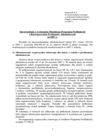 Załącznik nr 4 do sprawozdania rocznego z wykonania budŜetu Gminy śagań o statusie miejskim za 2007 r. Sprawozdanie z wykonania Miejskiego Programu Profilaktyki i Rozwiązywania Problemów Alkoholowych za 2007 r. Wydatki na przeciwdziałanie alkoholizmowi (dział 851, rozdz. 85154) w 2007 r. wyniosły 404.894,19 zł, co stanowi 96,96 % planu rocznego. Do waŜniejszych wydatków bieŜących zrealizowanych w 2007 r. naleŜą: 1) Sfinansowanie wypoczynku zimowego dla dzieci z rodzin z problemem alkoholowym. Zimowa akcja wypoczynkowa dla dzieci z rodzin zagroŜonych chorobą alkoholową trwała od 15 do 26 stycznia 2007 r. W ramach akcji na terenie Ŝagańskich szkół zorganizowane zostały półkolonie dla dzieci z rodzin ubogich, dotkniętych chorobą alkoholową. W półkoloniach organizowanych na bazie SP Nr 3,4,7 oraz Gimnazjum Nr 2 w śaganiu łącznie wzięło udział 119 dzieci, które codziennie od poniedziałku do piątku miały zapewnione pełne wyŜywienie i opiekę w godz. od 9.00 do 15.00. Dzieci brały udział w zajęciach organizowanych zgodnie z programami złoŜonymi wcześniej w siedzibie tut. Urzędu. W ramach tych zajęć organizowane były m.in. zabawy muzyczne, turnieje sportowe, konkursy, gry i zabawy planszowe. Prowadzone były takŜe zajęcia z elementami profilaktyki przeciwalkoholowej, higieny, bezpieczeństwa i kultury osobistej. W kaŜdej grupie półkolonijnej przeprowadzone zostały 4 godziny warsztatów socjoterapeutycznych. W ramach półkolonii dzieci wyjeŜdŜały na basen do śar. Na zakończenie ferii w sali Kryształowej śPK odbył się bal karnawałowy, w którym wzięło udział około 150 osób. Podczas balu organizowane były konkursy i zabawy, za udział w których dzieci otrzymały słodycze i nagrody. Ponadto dla uczestników półkolonii przedstawiony został spektakl Teatru Animacji z Jeleniej Góry Pt. „Mała Syrenka”. W szkołach, w których nie odbywały się półkolonie zimowe prowadzone były zajęcia rekreacyjno-sportowe i komputerowe w wymiarze po 2 godziny dziennie. Na organizację wypoczynku zimowego ze środków Programu Profilaktyki wydano 17.788 zł. 1 2) Programy profilaktyczne dla dzieci i młodzieŜy. Programy profilaktyczne realizowano w okresie od marca do czerwca 2007 r. W tym czasie sfinansowano realizację następujących programów: - Program „Jestem OK” dla IV i V klas szkół podstawowych, którym objęto 80 uczniów. Na ten cel wydatkowano kwotę 400 zł. - Program „Dotyk dobry i zły” zrealizowano w wymiarze 12 godzin dla 249 uczniów szkół podstawowych. Koszt realizacji – 300 zł. - Program „NOE” zrealizowany został w Gimnazjum Nr 1 i Gimnazjum Nr 2. Łącznie programem objęto 113 uczniów. Koszt realizacji programu – 1.500 zł. - Program „III Elementarz” dla szkół podstawowych, który prowadziło 6 realizatorów pod nadzorem instruktora. Łącznie programem objęto 118 uczniów, 84 rodziców i 120 pedagogów. Na realizację programu wydatkowano 4.000 zł. - Program „Nasze spotkania” zrealizowany został w szkołach średnich przez 6 realizatorów pod nadzorem rzecznika programu. Programem objęto 72 uczniów, wydatkowano kwotę 4.000 zł. - W ramach programów profilaktycznych dotyczących bezpieczeństwa dzieci i młodzieŜy zorganizowano zajęcia profilaktyczne w Publicznej Szkole Podstawowej nr 2 – na organizację zajęć wydatkowano 350 zł Łącznie na realizację programów profilaktycznych w 2007 r. wydatkowano kwotę 10.550 zł. 3) Sfinansowanie terapii systemowej oraz dyŜurów psychologa klinicznego. Od stycznia do grudnia 2007 r. 2 razy w tygodniu dyŜurował psycholog kliniczny prowadzący rozmowy indywidualne z osobami uzaleŜnionymi i współuzaleŜnionymi. Na dyŜury psychologa wydano kwotę 13.500 zł. Od stycznia finansowano teŜ usługi terapeutyczne świadczone przez N ZOZ Profil w śarach dla mieszkańców śagania. W ramach tych usług kaŜdego miesiąca średnio 30 osób skorzystało z terapii indywidualnej oraz terapii grupowej, średnio 2 osobom miesięcznie udzielano porady prawnej. Zajęcia terapeutyczne w ośrodku obejmowały udział w programach psychoterapii dla osób uzaleŜnionych, współuzaleŜnionych członków ich rodzin oraz Dorosłych i Dorastających Dzieci Alkoholików. W tym okresie w placówce prowadzono następujące grupy terapeutyczne: dwie grupy dla osób uzaleŜnionych od alkoholu w krótkim programie, dwie grupy długoterminowe, jedna grupa DDA oraz grupa „ŚcieŜki duchowej”. Ponadto placówka udzielała indywidualnych świadczeń zapobiegawczo-leczniczych osobom uzaleŜnionym, prowadziła działania konsultacyjno-edukacyjne dla członków rodzin oraz współpracowała z grupami samopomocowymi (Klub 2 Abstynenta w śaganiu, grupy AA oraz grupy Al.-Anon). Na tego rodzaju terapię wydatkowano 16.563 zł. 4) Działalność Miejskiej Alkoholowych. Komisji Rozwiązywania Problemów W 2007 r. do Komisji Rozwiązywania Problemów Alkoholowych wpłynęło 88 wniosków w sprawie skierowania na leczenie osób uzaleŜnionych od alkoholu. Komisja uczestniczyła w 9 posiedzeniach, przeprowadziła 144 rozmowy interwencyjno-motywujące w związku z naduŜywaniem alkoholu, na kwotę 2.620,80 zł. Wydano 23 opinie psychologa i psychiatry o stopniu uzaleŜnienia od alkoholu na kwotę 5.988 zł. Wobec 33 osób uzaleŜnionych od alkoholu komisja wystąpiła do sądu z wnioskiem o zobowiązanie do podjęcia leczenia odwykowego. Z tytułu opłat od wniosków poniesiono koszty w wysokości 680 zł. W ciągu roku członkowie Komisji przeprowadzili 34 kontrole w sklepach prowadzących sprzedaŜ napojów alkoholowych. i lokalach gastronomicznych. Kontrole przeprowadzone zostały w zakresie zgodności prowadzonej sprzedaŜy napojów alkoholowych z aktualnie waŜnym zezwoleniem oraz przestrzegania warunków ustawy o wychowaniu w trzeźwości i przeciwdziałaniu alkoholizmowi. Kontrole miały charakter profilaktyczny. Odbywały się przed większymi im