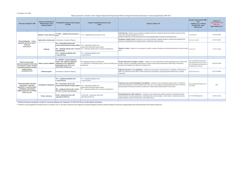 VI. Tabela 6. EU 2020 Matryca priorytetów, obszarów, celów i inicjatyw flagowych Strategii Europa 2020 oraz kategorii interwencji realizowanych w okresie programowania 2007-2013 Priorytety Strategii UE 2020 1 Obszary/cele Startegii UE 2020 stanowiące cel jej głównych działań 2 Badania i rozwój, innowacje Rozwój inteligentny - rozwój gospodarki opartej na wiedzy i innowacji smart growth Wskaźniki dla obszarów/celów Startegii UE 2020 Wstępne wskaźniki dla obszarów/celów Polski 3 4 3% PKB - wydatki Unii na inwestycje w 1,7% - wydatki Polski na inwestycje w B+R B+R Społeczeństwo informacyjne cel okreslony w Inicjatywie flagowej Edukacja Rozwój zrównoważony wspieranie gospodarki efektywniej Klimat, energia, mobilność korzystającej z zasobów, bardziej przyjaznej środowisku i bardziej konkurencyjnej; suistainable growth Konkurencyjność 10% - maksymalny odsetek osób przedwcześnie kończących naukę szkolną 4,5% - maksymalny odsetek osób przedwcześnie kończących naukę szkolną ; ; 40% - minimalny odsetek osób z wyższym 45% - minimalny odsetek osób z wyższym wykształceniem wykształceniem Zatrudnienie i umiejętności Walka z ubóstwem 5 7 87 914 043,00 Europejska Agenda Cyfrowa -Inicjatywa na rzecz upowszechnienia szybkiego Internetu i umożliwienia gospodarstwom domowym i przedsiębiorstwom czerpania korzyści z jednolitego rynku cyfrowego; 10,11,12,13,14,15 62 192 522,00 Młodzież w drodze - inicjatywa na rzecz poprawy wyników systemów kształcenia oraz ułatwiania młodzieży wejścia na rynek 72,73,75,77 pracy; cel „20/20/20” w zakresie klimatu i energii - 20% redukcja emisji gazów cieplrnianych, 20% udział RES w konsumpcjji energii, 20%wzrost efektywności energetycznej 19% redukcja emisji gazów cieplrnianych, Europa efektywnie korzystająca z zasobów – inicjatywa na rzecz uniezależnienia wzrostu gospodarczego od wykorzystania 15% udział RES w konsumpcjji energii, 13,6%wzrost efektywności zasobów, przejścia na gospodarkę niskoemisyjną, większego wykorzystania odnawialnych źródeł energii, modernizacji energetycznej transportu oraz propagowania efektywności energetycznej; 23 277 511,00 16,17,18,19,20,21,22,23,24,25, 26,27,28,29,30,31,32,33,34,35,3 6,37,38,39,40,41,42,43,44,45,46, 47,48,49,50,51,52,53,54 450 544 472,00 Polityka przemysłowa w erze globalizacji – inicjatywa na rzecz poprawy otoczenia biznesu, szczególnie w odniesieniu do MŚP, oraz wspierania rozwoju silnej i zrównoważonej bazy przemysłowej, przygotowanej do konkurowania na rynkach światowych; 3,4,5,6,7,8,9,14,15 262 122 899,00 Program na rzecz nowych umiejętności i zatrudnienia – inicjatywa na rzecz modernizacji rynków pracy i wzmocnienia pozycji obywateli poprzez rozwój kwalifikacji przez całe życie w celu zwiększenia współczynnika aktywności zawodowej i lepszego dopasowania popytu do podaży na rynku pracy, między innymi dzięki mobilności siły roboczej; 62,63,64,65,66,67,68,69,70.71,7 2,73,74,80 Europejski program walki z ubóstwem – inicjatywa na rzecz zapewnienia spójności społecznej i terytorialnej, tak aby korzyści płynące ze wzrostu gospodarczego i zatrudnienia były szeroko dostępne, a osoby ubogie i wykluczone społecznie mogły żyć godnie i aktywnie uczestniczyć w życiu społeczeństwa. 61,77,78,79,80,82,83,84 71% - wskaźnik zatrudnienia osób w wieku 20-64 lat 10% - maksymalny odsetek osób przedwcześnie kończących naukę szkolną 4,5% - maksymalny odsetek osób przedwcześnie kończących naukę szkolną ; ; 40% - minimalny odsetek osób w wieku 45% - minimalny odsetek osób z wyższym wykształceniem 30-34 lat z wyższym wykształceniem 20 mln - zmniejszenie liczby osób zagrożonych ubóstwem 6 Alokacja UE Programu RPO WiM 2007-2013 - ujęcie indykatywne** 1,2,3,4,7,9,74 71% - wskaźnik zatrudnienia osób w wieku 20-64 lat cel okreslony w Inicjatywie flagowej Kategorie interwencji PS 20072013 wpisujące się w realizację Strategii 2020 - ujęcie indykatywne* Unia Innowacji - inicjatywa na rzecz poprawy warunków ramowych i dostępu do finansowania badań i innowacji, tak by innowacyjne pomysły przeradzały się w nowe produkty i usługi, które z kolei przyczynią się do wzrostu gospodarczego i tworzenia nowych miejsc pracy; 75% - wskaźnik zatrudnienia osób w wieku 20-64 lat 75% - wskaźnik zatrudnienia osób w wieku 20-64 lat Rozwój sprzyjający włączeniu społecznemu - wspieranie gospodarki o wysokim poziomie zatrudnienia, zapewniającej spójność społeczną i terytorialną. inclusive growth Inicjatywy flagowe UE 1,5 mln-2mln - zmniejszenie liczby osób zagrożonych ubóstwem * Niektóre kategorie przypisane zostały do wiecej niż jednego celu. Kategorie 55-60,81,85-86 nie zostały nigdzie przypisane. ** Wartości w poszczególnych wierszach liczone są w oparciu o kol. 6. Nie należy sumować kwoty alokacji na poziomie programu, ponieważ niektóre kategorie interwencji realizują jednocześnie kilka priorytetów lub inicjatyw flagowych. 0,00 86 742 113,00