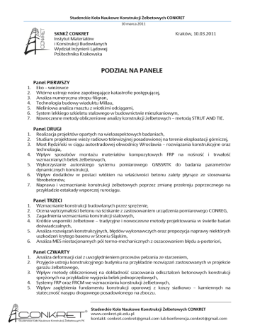 Studenckie Koło Naukowe Konstrukcji Żelbetowych CONKRET 10 marca 2011 SKNKŻ CONKRET Instytut Materiałów i Konstrukcji Budowlanych Wydział Inżynierii Lądowej Politechnika Krakowska Kraków, 10.03.2011 PODZIAŁ NA PANELE 1. 2. 3. 4. 5. 6. 7. Panel PIERWSZY Eko – wieżowce Wtórne ustroje nośne zapobiegające katastrofie postępującej, Analiza numeryczna stropu filigran, Technologia budowy wiaduktu Millau, Nieliniowa analiza masztu z wiotkimi odciągami, System lekkiego szkieletu stalowego w budownictwie mieszkaniowym, Nowoczesne metody obliczeniowe analizy konstrukcji żelbetowych – metodą STRUT AND TIE. Panel DRUGI 1. 2. 3. 4. 5. 6. 7. 1. 2. 3. 4. 5. 6. Realizacja projektów opartych na wieloaspektowych badaniach, Studium projektowe wieży radiowo telewizyjnej posadowionej na terenie eksploatacji górniczej, Most Rędziński w ciągu autostradowej obwodnicy Wrocławia – rozwiązania konstrukcyjne oraz technologia, Wpływ sposobów montażu materiałów kompozytowych FRP na nośność i trwałość wzmacnianych belek żelbetowych, Wykorzystanie autorskiego systemu pomiarowego GNSSRTK do badania parametrów dynamicznych konstrukcji, Wpływ dodatków w postaci włókien na właściwości betonu zalety płynące ze stosowania fibrobetonów, Naprawa i wzmacnianie konstrukcji żelbetowych poprzez zmianę przekroju poprzecznego na przykładzie estakady wsporczej rurociągu. Panel TRZECI Wzmacnianie konstrukcji budowlanych przez sprężenie, Ocena wytrzymałości betonu na ściskanie z zastosowaniem urządzenia pomiarowego CONREG, Zagadnienia wzmacniania konstrukcji stalowych, Krótkie wsporniki żelbetowe – tradycyjne i nowoczesne metody projektowania w świetle badań doświadczalnych, Analiza rozwiązań konstrukcyjnych, błędów wykonawczych oraz propozycja naprawy niektórych uszkodzeń krytego basenu w Stroniu Śląskim, Analiza MES niestacjonarnych pól termo-mechanicznych z oszacowaniem błędu a-posteriori, Panel CZWARTY 1. 2. 3. 4. 5. Analiza deformacji ciał z uwzględnieniem procesów pełzania ze starzeniem, Przyjęcie ustroju konstrukcyjnego budynku na przykładzie rozwiązań zastosowanych w projekcie garażu żelbetowego, Wpływ metody obliczeniowej na dokładność szacowania odkształceń betonowych konstrukcji sprężonych na przykładzie wygięcia belek jednoprzęsłowych, Systemy FRP oraz FRCM we wzmacnianiu konstrukcji żelbetowych, Wpływ zagłębienia fundamentu konstrukcji oporowej z koszy siatkowo – kamiennych na stateczność nasypu drogowego posadowionego na zboczu. Studenckie Koło Naukowe Konstrukcji Żelbetowych CONKRET www.conkret.pk.edu.pl kontakt: [email protected] lub [email protected] Studenckie Koło Naukowe Konstrukcji Żelbetowych CONKRET 10 marca 2011 1. 2. 3. 4. 5. Referaty w formie POSTERÓW Rewitalizacja Placu Zamkowego w Jezioranach Rozwiązania konstrukcyjne i materiałowe zabudowy Śródmieścia Jezioran w aspekcie jej rewaloryzacji, Problematyka rewaloryzacji zabudowy miejskiej na przykładzie Śródmieścia w Jezioranach, Działalność koła naukowego „KRESKA” w pracach nad projektem rewaloryzacji Jezioran, Stan zachowania wybranych Olsztyńskich zabytkowych budynków murowanych. Studenckie Koło Naukowe Konstrukcji Żelbetowych CONKRET www.conkret.pk.edu.pl kontakt: [email protected] lub [email protected]