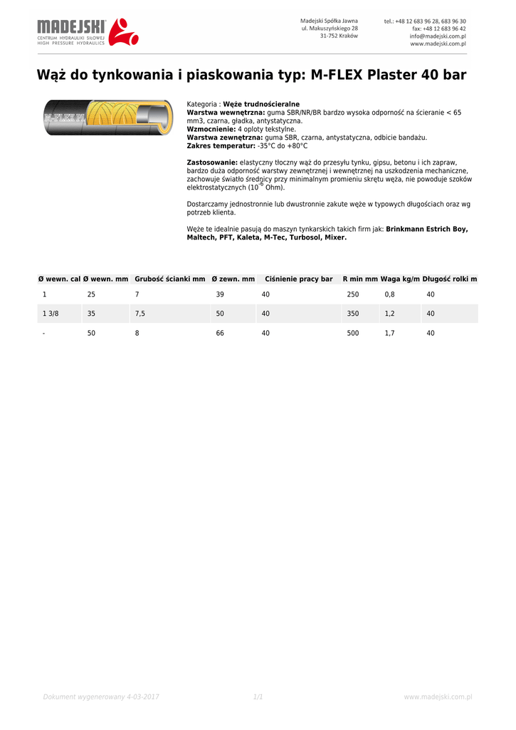 Wąż do tynkowania i piaskowania typ: M-FLEX Plaster 40 bar Kategoria : Węże trudnościeralne Warstwa wewnętrzna: guma SBR/NR/BR bardzo wysoka odporność na ścieranie < 65 mm3, czarna, gładka, antystatyczna. Wzmocnienie: 4 oploty tekstylne. Warstwa zewnętrzna: guma SBR, czarna, antystatyczna, odbicie bandażu. Zakres temperatur: -35°C do +80°C Zastosowanie: elastyczny tłoczny wąż do przesyłu tynku, gipsu, betonu i ich zapraw, bardzo duża odporność warstwy zewnętrznej i wewnętrznej na uszkodzenia mechaniczne, zachowuje światło średnicy przy minimalnym promieniu skrętu węża, nie powoduje szoków -6 elektrostatycznych (10 Ohm). Dostarczamy jednostronnie lub dwustronnie zakute węże w typowych długościach oraz wg potrzeb klienta. Węże te idealnie pasują do maszyn tynkarskich takich firm jak: Brinkmann Estrich Boy, Maltech, PFT, Kaleta, M-Tec, Turbosol, Mixer. Ø wewn. cal Ø wewn. mm Grubość ścianki mm Ø zewn. mm Ciśnienie pracy bar R min mm Waga kg/m Długość rolki m 1 25 7 39 40 250 0,8 40 1 3/8 35 7,5 50 40 350 1,2 40 - 50 8 66 40 500 1,7 40 Dokument wygenerowany 4-03-2017 1/1 www.madejski.com.pl