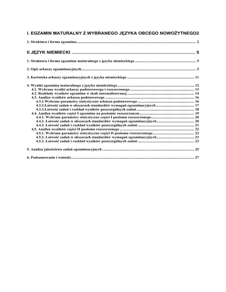 I. EGZAMIN MATURALNY Z WYBRANEGO JĘZYKA OBCEGO NOWOŻYTNEGO2 1. Struktura i forma egzaminu ............................................................................................................................. 2 II JĘZYK NIEMIECKI ................................................................................................. 5 1. Struktura i forma egzaminu maturalnego z języka niemieckiego ................................................................ 5 2. Opis arkuszy egzaminacyjnych ........................................................................................................................ 5 3. Kartoteka arkuszy egzaminacyjnych z języka niemieckiego ...................................................................... 11 4. Wyniki egzaminu maturalnego z języka niemieckiego ................................................................................ 12 4.1. Wybrane wyniki arkuszy podstawowego i rozszerzonego ................................................................... 13 4.2. Rozkłady wyników egzaminu w skali znormalizowanej ...................................................................... 14 4.3. Analiza wyników arkusza podstawowego ............................................................................................. 16 4.3.1.Wybrane parametry statystyczne arkusza podstawowego ........................................................... 16 4.3.2.Łatwość zadań w obszarach standardów wymagań egzaminacyjnych ........................................ 17 4.3.3.Łatwość zadań i rozkład wyników poszczególnych zadań ............................................................ 18 4.4. Analiza wyników części I egzaminu na poziomie rozszerzonym ......................................................... 19 4.4.1. Wybrane parametry statystyczne części I poziomu rozszerzonego ............................................. 20 4.4.2. Łatwość zadań w obszarach standardów wymagań egzaminacyjnych ....................................... 20 4.4.3. Łatwość zadań i rozkład wyników poszczególnych zadań ........................................................... 21 4.5. Analiza wyników części II poziomu rozszerzonego .............................................................................. 22 4.5.1. Wybrane parametry statystyczne części II poziomu rozszerzonego ........................................... 22 4.5.2. Łatwość zadań w obszarach standardów wymagań egzaminacyjnych ....................................... 23 4.5.3. Łatwość zadań i rozkład wyników poszczególnych zadań ........................................................... 23 5. Analiza jakościowa zadań egzaminacyjnych ................................................................................................ 25 6. Podsumowanie i wnioski ................................................................................................................................. 27 Okręgowa Komisja Egzaminacyjna w Gdańsku I. Egzamin maturalny z wybranego języka obcego nowożytnego 1. Struktura i forma egzaminu Struktura i forma części ustnej egzaminu z języka obcego nowożytnego W Tabeli 1. przedstawiona została struktura i forma części ustnej egzaminu maturalnego. Tabela. 1. Struktura i forma części ustnej egzaminu z języków obcych nowożytnych POZIOM PODSTAWOWY Czas: 10 minut Przygotowanie: 5 minut Zadanie 1. Trzy rozmowy sterowane: uzyskiwanie i udzielanie informacji relacjonowanie wydarzeń i negocjowanie. Zadanie 2. Opis ilustracji i odpowiedzi na dwa pytania. Punktacja treść 3 3 3 6 język POZIOM ROZSZERZONY Czas: 15 minut Przygotowanie: 15 minut Punktacja treść Zadanie 1. Rozmowa na podstawie materiału stymulującego. 5 Zadanie 2. Prezentacja tematu oraz dyskusja z egzaminującym na temat prezentowanych zagadnień. język 6 7 7 Zestawy zadań do części ustnej egzaminu maturalnego z języków obcych nowożytnych zostały przygotowane przez ekspertów okręgowych komisji egzaminacyjnych i rozesłane do szkół przed rozpoczęciem sesji egzaminacyjnej. Każda szkoła otrzymała odpowiednią liczbę zestawów zadań na poziom podstawowy i rozszerzony, a także dla absolwentów oddziałów dwujęzycznych, adekwatnie do liczby zdających. Egzamin na poziomie podstawowym trwał około 10 minut. Zdający miał na zapoznanie się z zestawem około 5 minut, które nie były wliczane do czasu trwania egzaminu. Zestaw egzaminacyjny dla zdających na poziomie podstawowym składał się z dwóch zadań. Zadanie pierwsze polegało na przeprowadzeniu trzech rozmów sterowanych. Sprawdzało umiejętności: uzyskiwanie i udzielanie informacji, relacjonowanie wydarzeń i negocjowanie. Zdający musiał wykazać się umiejętnością reagowania językowego w sytuacjach życia codziennego. Rozmowy prowadzone były zgodnie ze scenariuszem podanym w zadaniu w języku polskim. Zadanie drugie polegało na opisaniu zamieszczonej w zestawie ilustracji oraz udzieleniu odpowiedzi na dwa pytania zawarte wyłącznie w zestawie egzaminującego. Zadania w zestawach dla poziomu podstawowego obejmowały pełny zakres tematyczny przewidziany w standardach wymagań egzaminacyjnych2 i sprawdzały umiejętność tworzenia krótkiej wypowiedzi ustnej oraz reagowania językowego w zakresie mówienia, z uwzględnieniem wszystkich umiejętności szczegółowych opisanych w standardach III, IV dla poziomu podstawowego. Oceniane były umiejętności: przekazania informacji (9 punktów), opisania ilustracji (2 punkty), wyrażania opinii (4 punkty) oraz umiejętności językowe (5 punktów). Łącznie za dwa zadania na poziomie podstawowym zdający mógł uzyskać maksymalnie 20 punktów. 2 Standardy wymagań egzaminacyjnych zostały opublikowane w Informatorach przedmiotowych z języków obcych nowożytnych Egzamin maturalny z języka niemieckiego w województwie pomorskim, maj 2011 2 Sprawozdanie z egzaminu maturalnego przeprowadzonego w roku szkolnym 2007/2008 na tere