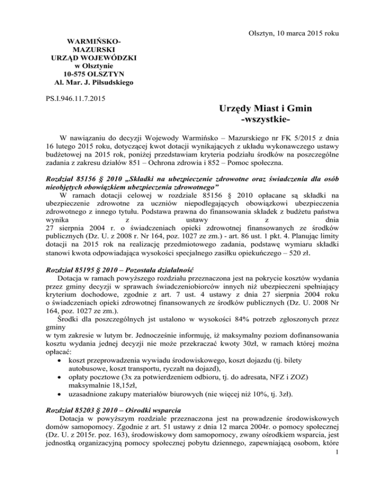 Olsztyn, 10 marca 2015 roku WARMIŃSKOMAZURSKI URZĄD WOJEWÓDZKI w Olsztynie 10-575 OLSZTYN Al. Mar. J. Piłsudskiego PS.I.946.11.7.2015 Urzędy Miast i Gmin -wszystkieW nawiązaniu do decyzji Wojewody Warmińsko – Mazurskiego nr FK 5/2015 z dnia 16 lutego 2015 roku, dotyczącej kwot dotacji wynikających z układu wykonawczego ustawy budżetowej na 2015 rok, poniżej przedstawiam kryteria podziału środków na poszczególne zadania z zakresu działów 851 – Ochrona zdrowia i 852 – Pomoc społeczna. Rozdział 85156 § 2010 „Składki na ubezpieczenie zdrowotne oraz świadczenia dla osób nieobjętych obowiązkiem ubezpieczenia zdrowotnego” W ramach dotacji celowej w rozdziale 85156 § 2010 opłacane są składki na ubezpieczenie zdrowotne za uczniów niepodlegających obowiązkowi ubezpieczenia zdrowotnego z innego tytułu. Podstawa prawna do finansowania składek z budżetu państwa wynika z ustawy z dnia 27 sierpnia 2004 r. o świadczeniach opieki zdrowotnej finansowanych ze środków publicznych (Dz. U. z 2008 r. Nr 164, poz. 1027 ze zm.) - art. 86 ust. 1 pkt. 4. Planując limity dotacji na 2015 rok na realizację przedmiotowego zadania, podstawę wymiaru składki stanowi kwota odpowiadająca wysokości specjalnego zasiłku opiekuńczego – 520 zł. Rozdział 85195 § 2010 – Pozostała działalność Dotacja w ramach powyższego rozdziału przeznaczona jest na pokrycie kosztów wydania przez gminy decyzji w sprawach świadczeniobiorców innych niż ubezpieczeni spełniający kryterium dochodowe, zgodnie z art. 7 ust. 4 ustawy z dnia 27 sierpnia 2004 roku o świadczeniach opieki zdrowotnej finansowanych ze środków publicznych (Dz. U. 2008 Nr 164, poz. 1027 ze zm.). Środki dla poszczególnych jst ustalono w wysokości 84% potrzeb zgłoszonych przez gminy w tym zakresie w lutym br. Jednocześnie informuję, iż maksymalny poziom dofinansowania kosztu wydania jednej decyzji nie może przekraczać kwoty 30zł, w ramach której można opłacać: koszt przeprowadzenia wywiadu środowiskowego, koszt dojazdu (tj. bilety autobusowe, koszt transportu, ryczałt na dojazd), opłaty pocztowe (3x za potwierdzeniem odbioru, tj. do adresata, NFZ i ZOZ) maksymalnie 18,15zł, uzasadnione zakupy materiałów biurowych (nie więcej niż 10%, tj. 3zł). Rozdział 85203 § 2010 – Ośrodki wsparcia Dotacja w powyższym rozdziale przeznaczona jest na prowadzenie środowiskowych domów samopomocy. Zgodnie z art. 51 ustawy z dnia 12 marca 2004r. o pomocy społecznej (Dz. U. z 2015r. poz. 163), środowiskowy dom samopomocy, zwany ośrodkiem wsparcia, jest jednostką organizacyjną pomocy społecznej pobytu dziennego, zapewniającą osobom, które 1 ze względu na wiek, chorobę lub niepełnosprawność wymagają częściowej opieki i pomocy w zaspokajaniu potrzeb życiowych. Prowadzenie środowiskowych domów samopomocy dla osób z zaburzeniami psychicznymi jest zadaniem z zakresu administracji rządowej zleconym gminie, w przypadku środowiskowych domów samopomocy o zasięgu lokalnym (gminnym) – zgodnie z art. 18 ustawy o pomocy społecznej. Dotacja w tym rozdziale zaplanowana w ustawie budżetowej na 2015 rok, przeznaczona jest na finansowanie działalności bieżącej 38 środowiskowych domów samopomocy oraz 3 filii o zasięgu gminnym, przeznaczonych dla 1.822 podopiecznych, w tym 29 miejsc całodobowej opieki. W ustawie budżetowej na rok 2015 ustalono, że miesięczna dotacja na 1 uczestnika gminnego środowiskowego domu samopomocy wyniesie ok. 994 zł za miejsca dzienne i całodobowe. W ośrodkach wsparcia, przeznaczonych dla osób z chorobą Alzheimera przyjęto, że dotacja na 1 uczestnika w 2015 r. wyniesie 1.200 zł za miejsce dzienne i całodobowe. Dotacja dla jednostek samorządu terytorialnego przy ustawie budżetowej na rok 2015, prowadzących środowiskowe domy samopomocy ustalona została jako iloczyn statutowej liczby miejsc w śds, kwoty dotacji na 1 miejsce i 12 miesięcy. Jednocześnie zaznaczam, iż w lutym br., Wojewoda Warmińsko – Mazurski, w drodze decyzji, zwiększył budżet w rozdziale 85203 – „Ośrodki wsparcia”, ustalając tym samym dotację na 1 uczestnika śds w 2015 r. na poziomie 1.000 zł za miejsce dzienne i całodobowe oraz 1.200 zł za miejsce dzienne i całodobowe w placówkach przeznaczonych dla osób z chorobą Alzheimera. Rozdział 85212 § 2010 – Świadczenia rodzinne, świadczenia z funduszu alimentacyjnego oraz składki na ubezpieczenie emerytalne i rentowe z ubezpieczenia społecznego W ramach rozdziału 85212 § 2010 wypłacane są przez gminy świadczenia rodzinne, świadczenia z funduszu alimentacyjnego oraz zasiłek dla opiekuna. Obowiązek wypłaty powyższych świadczeń wynika z ustawy z dnia 28 listopada 2003r. o świadczeniach rodzinnych (Dz. U. 2015 r., poz. 114), ustawy z dnia 7 września 2007 r. o pomocy osobom uprawnionym do alimentów (Dz. U. z 2012 r., poz. 1228 z późn. zm.) oraz ustawy z dnia 4 kwietnia 2014 r. o ustaleniu i wypłacie zasiłków dla opiekunów (Dz. U. z 2014 r., poz. 567). Dotacja na 2015 rok dla poszczególnych gmin została ustalona w oparciu o przewidywane potrzeby w zakresie dotacji na to zadanie na rok 2015, zgłoszone przez gminy w lutym br., które zabezpiecza w wysokości 97,55%. Rozdział 85213 – Składki na ubezpieczenie zdrowotne opłacane za osoby pobierające niektóre świadczenia z pomocy społecznej, niektóre świadczenia rodzinne oraz za osoby uczestniczące w zajęciach w centrum integracji społecznej § 2010 Składkę na ubezpieczenie zdrowotne w ramach powyższego paragrafu opłaca się za: osoby pobierające specjalny zasiłek opiekuńczy lub dodatek do zasiłku rodzinnego z tytułu samotnego wychowywania dziecka i utraty prawa do zasiłku dla bezrobotnych na skutek upływu ustawowego okresu jego pobierania, przyznane na podstawie przepisów o świadczeniach rodzinnych, niepodlegające obowiązkowi ubezpieczenia zdrowotnego z innego tytułu (art. 66 ust. 1 pkt.28), 2 osoby po