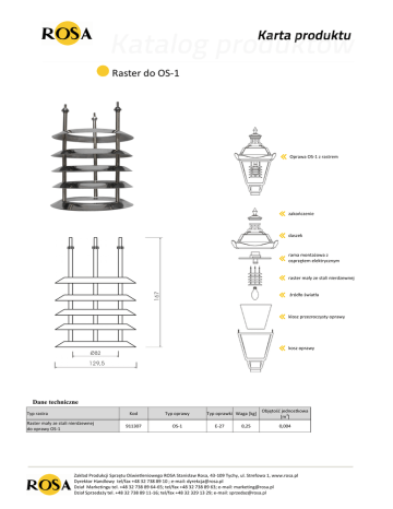 Raster do OS-1 Oprawa OS-1 z rastrem zakooczenie daszek rama montażowa z osprzętem elektrycznym raster mały ze stali nierdzewnej źródło światła klosz przezroczysty oprawy kosz oprawy Dane techniczne Typ rastra Raster mały ze stali nierdzewnej do oprawy OS-1 Kod Typ oprawy 911307 OS-1 Typ oprawki Waga [kg] E-27 0,25 Objętośd jednostkowa [m3] 0,004 Zakład Produkcji Sprzętu Oświetleniowego ROSA Stanisław Rosa, 43-109 Tychy, ul. Strefowa 1, www.rosa.pl Dyrektor Handlowy tel/fax +48 32 738 89 10 ; e-mail: [email protected] Dział Marketingu tel. +48 32 738 89 64-65; tel/fax +48 32 738 89 63; e-mail: [email protected] Dział Sprzedaży tel. +48 32 738 89 11-16; tel/fax +48 32 329 13 29; e-mail: [email protected]