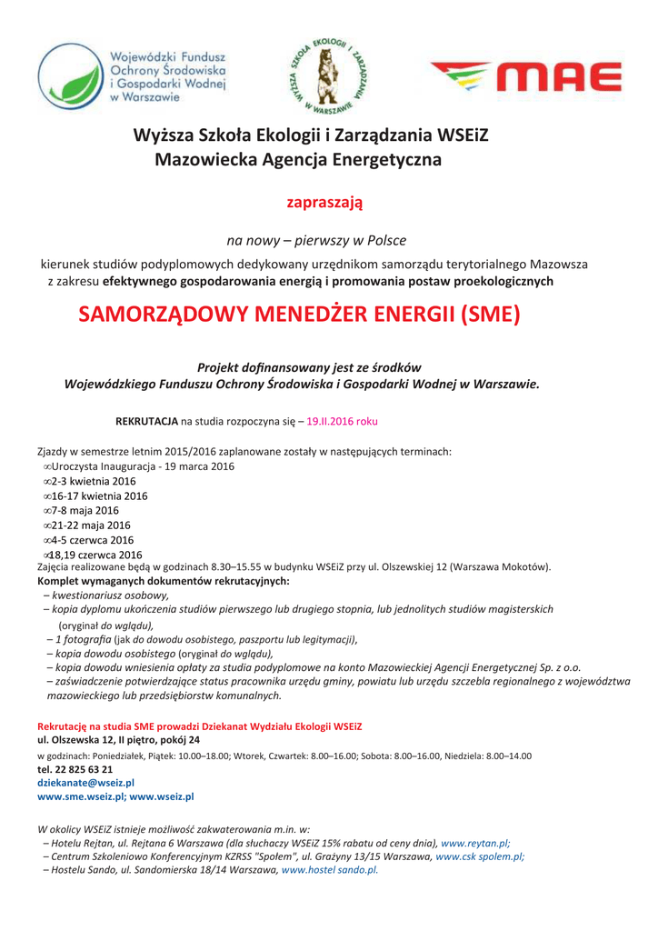 Wyższa Szkoła Ekologii i Zarządzania WSEiZ Mazowiecka Agencja Energetyczna zapraszają na nowy – pierwszy w Polsce kierunek studiów podyplomowych dedykowany urzędnikom samorządu terytorialnego Mazowsza z zakresu efektywnego gospodarowania energią i promowania postaw proekologicznych SAMORZĄDOWY MENEDŻER ENERGII (SME) Projekt dofinansowany jest ze środków Wojewódzkiego Funduszu Ochrony Środowiska i Gospodarki Wodnej w Warszawie. REKRUTACJA na studia rozpoczyna się – 19.II.2016 roku Zjazdy w semestrze letnim 2015/2016 zaplanowane zostały w następujących terminach: • Uroczysta Inauguracja - 19 marca 2016 • 2-3 kwietnia 2016 • 16-17 kwietnia 2016 • 7-8 maja 2016 • 21-22 maja 2016 • 4-5 czerwca 2016 •18,19 czerwca 2016 Zajęcia realizowane będą w godzinach 8.30–15.55 w budynku WSEiZ przy ul. Olszewskiej 12 (Warszawa Mokotów). Komplet wymaganych dokumentów rekrutacyjnych: – kwestionariusz osobowy, – kopia dyplomu ukończenia studiów pierwszego lub drugiego stopnia, lub jednolitych studiów magisterskich (oryginał do wglądu), – 1 fotografia (jak do dowodu osobistego, paszportu lub legitymacji), – kopia dowodu osobistego (oryginał do wglądu), – kopia dowodu wniesienia opłaty za studia podyplomowe na konto Mazowieckiej Agencji Energetycznej Sp. z o.o. – zaświadczenie potwierdzające status pracownika urzędu gminy, powiatu lub urzędu szczebla regionalnego z województwa mazowieckiego lub przedsiębiorstw komunalnych. Rekrutację na studia SME prowadzi Dziekanat Wydziału Ekologii WSEiZ ul. Olszewska 12, II piętro, pokój 24 w godzinach: Poniedziałek, Piątek: 10.00–18.00; Wtorek, Czwartek: 8.00–16.00; Sobota: 8.00–16.00, Niedziela: 8.00–14.00 tel. 22 825 63 21 [email protected] www.sme.wseiz.pl; www.wseiz.pl W okolicy WSEiZ istnieje możliwość zakwaterowania m.in. w: – Hotelu Rejtan, ul. Rejtana 6 Warszawa (dla słuchaczy WSEiZ 15% rabatu od ceny dnia), www.reytan.pl; – Centrum Szkoleniowo Konferencyjnym KZRSS "Społem", ul. Grażyny 13/15 Warszawa, www.csk spolem.pl; – Hostelu Sando, ul. Sandomierska 18/14 Warszawa, www.hostel sando.pl. PROGRAM STUDIÓW PODYPLOMOWYCH SAMORZĄDOWY MENEDŻER ENERGII NAZWA PRZEDMIOTU 1. 2. 3. 4. LICZBA GODZIN Prawne uwarunkowania wytwarzania, przesyłu, dystrybucji, magazynowania i obrotu energią Rynek energii Uwarunkowania środowiskowe energetyki Energetyka konwencjonalna 4.1. Energetyka wykorzystująca konwencjonalne stałe, płynne i gazowe paliwa kopalne 4.2. Energetyka jądrowa 4.3. Kogeneracja – łączenie procesów wytwarzania energii elektrycznej i cieplnej 4.4. Alternatywne surowce nieodnawialne 5. Odnawialne i niekonwencjonalne źródła energii 5.1. Energetyka wodna 5.2. Geotermia i pompy ciepła 5.3. Energetyka wiatrowa 5.4. Energetyka słoneczna 5.5. Produkcja energii z biogazu, biomasy i biopaliw ciekłych, osadów ściekowych 5.6. Systemy hybrydowe OZE i kogeneracyjne 6. Magazynowanie energii 6.1. Współczesne technologie magazynowania energii 6.2. Magazynowanie energii jako element integracji instalacji OZE z systemem elektroenergetycznym 7. Nowoczesne technologie przesyłu i dystrybucji energii 7.1. Inteligentny system pomiarowy – Smart Metering 7.2. Zarządzanie mocą bierną i alokacja zasobów energetycznych w czasie rzeczywistym 7.3. Inteligentna sieć elektroenergetyczna – Smart Grid 8. Energetyka rozproszona – lokalna, prosumencka 8.1. Prosumencka energetyka rozproszona a energetyka scentralizowana 8.2. Specyfika technologii energetycznych małej skali 8.3. Energetyka komunalna 8.4. Energetyka lokalna a ochrona środowiska 9. Bezpieczeństwo energetyczne 9.1. Bezpieczeństwo energetyczne jako strategiczny cel zrównoważonej polityki energetycznej na szczeblu krajowym, regionalnym i lokalnym 9.2. Dywersyfikacja dostaw paliw dla energetyki konwencjonalnej 9.3. Zwiększenie udziału OZE jako element zapewnienia bezpieczeństwa energetycznego 9.4. Magazynowanie energii a bezpieczeństwo energetyczne 9.5. Efektywność energetyczna a bezpieczeństwo energetyczne 10. Planowanie i zarządzanie energetyką w gminie 10.1. Ocena efektywności energetycznej audyt energetyczny, białe certyfikaty – system świadectw efektywności energetycznej, świadectwa energetyczne 10.2. Strategie i metody zwiększania efektywności energetycznej w gminie 10.3. Planowanie energetyczne w gminie z uwzględnieniem rozproszonych źródeł energii 10.4. Gminna strategia energetyczna a zhierarchizowane planowanie przestrzenne w gminie 10.5. Racjonalizacja zakupu i zużycia energii oraz poszanowanie energii w gminie 10.6. Strategie partnerstwa energetycznego 11. Finansowanie energetyki na szczeblu gminnym 11.1. Rozliczenia wydatków energetycznych w gminie – rozumienie faktur, rozliczenia rzeczywiste 11.2. Analiza finansowa i ekonomiczna przedsięwzięć energetycznych metodologia oceny ekonomicznej 11.3. Źródła finansowania wydatków energetycznych oraz finansowania przedsięwzięć energetycznych w gminie: środki własne, dotacje zwrotne i bezzwrotne, kredyty i pożyczki, gwarancje i zabezpieczenia bankowe 11.4. Pozyskiwanie środków finansowych na realizację przedsięwzięć energetycznych: procedury pozyskiwania środków ze zróżnicowanych źródeł, montaż finansowy, wkład własny w finansowaniu inwestycji 11.5. Programy i systemy finansowania gminnych przedsięwzięć energetycznych 11.6. Doradztwo w zakresie przedsięwzięć z zakresu energetyki i ochrony środowiska: energo i ekokonsulng 12. Kierunki rozwoju energetyki innowacyjność w energetyce 13. Seminarium dyplomowe 12 12 8 20 8 4 4 4 24 4 4 4 4 4 4 8 4 4 8 2 2 4 8 2 2 3 1 8 2 2 1 1 2 52 8 12 8 8 12 4 28 8 4 4 4 4 4 8 4