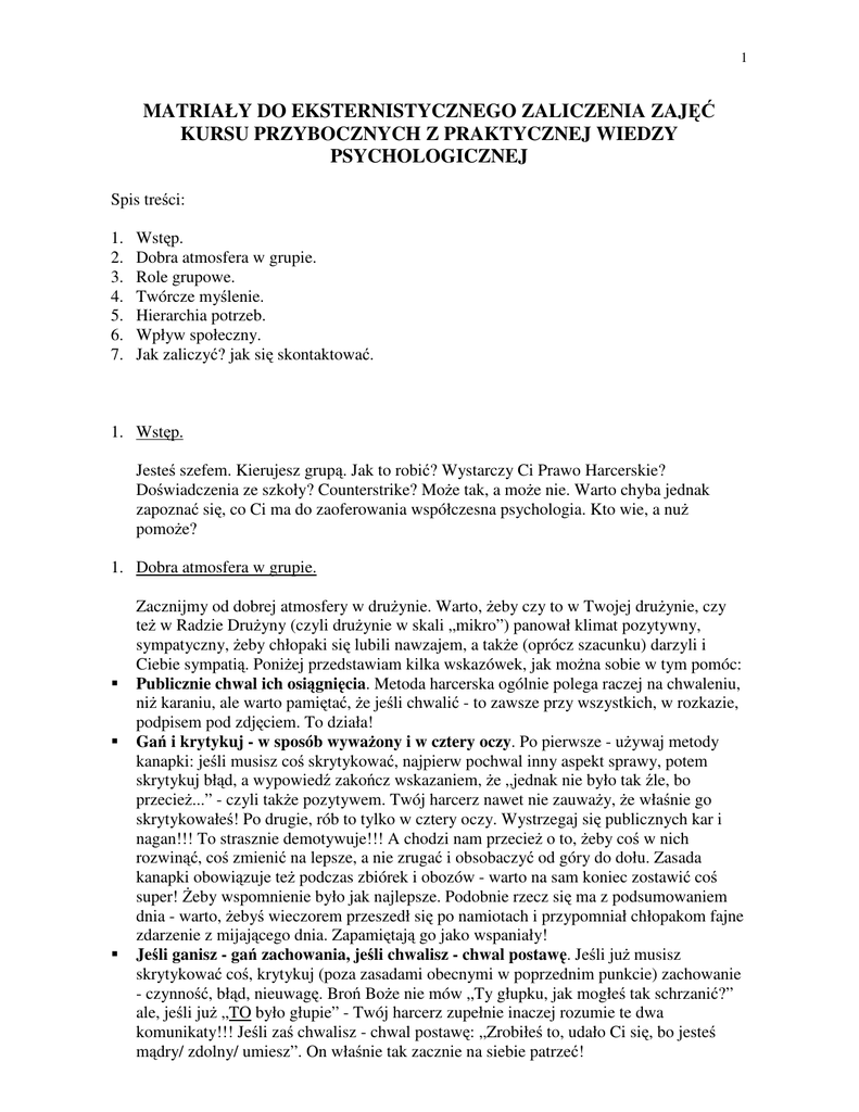 1 MATRIAŁY DO EKSTERNISTYCZNEGO ZALICZENIA ZAJĘĆ KURSU PRZYBOCZNYCH Z PRAKTYCZNEJ WIEDZY PSYCHOLOGICZNEJ Spis treści: 1. 2. 3. 4. 5. 6. 7. Wstęp. Dobra atmosfera w grupie. Role grupowe. Twórcze myślenie. Hierarchia potrzeb. Wpływ społeczny. Jak zaliczyć? jak się skontaktować. 1. Wstęp. Jesteś szefem. Kierujesz grupą. Jak to robić? Wystarczy Ci Prawo Harcerskie? Doświadczenia ze szkoły? Counterstrike? Może tak, a może nie. Warto chyba jednak zapoznać się, co Ci ma do zaoferowania współczesna psychologia. Kto wie, a nuż pomoże? 1. Dobra atmosfera w grupie. Zacznijmy od dobrej atmosfery w drużynie. Warto, żeby czy to w Twojej drużynie, czy też w Radzie Drużyny (czyli drużynie w skali „mikro”) panował klimat pozytywny, sympatyczny, żeby chłopaki się lubili nawzajem, a także (oprócz szacunku) darzyli i Ciebie sympatią. Poniżej przedstawiam kilka wskazówek, jak można sobie w tym pomóc: Publicznie chwal ich osiągnięcia. Metoda harcerska ogólnie polega raczej na chwaleniu, niż karaniu, ale warto pamiętać, że jeśli chwalić - to zawsze przy wszystkich, w rozkazie, podpisem pod zdjęciem. To działa! Gań i krytykuj - w sposób wyważony i w cztery oczy. Po pierwsze - używaj metody kanapki: jeśli musisz coś skrytykować, najpierw pochwal inny aspekt sprawy, potem skrytykuj błąd, a wypowiedź zakończ wskazaniem, że „jednak nie było tak źle, bo przecież...” - czyli także pozytywem. Twój harcerz nawet nie zauważy, że właśnie go skrytykowałeś! Po drugie, rób to tylko w cztery oczy. Wystrzegaj się publicznych kar i nagan!!! To strasznie demotywuje!!! A chodzi nam przecież o to, żeby coś w nich rozwinąć, coś zmienić na lepsze, a nie zrugać i obsobaczyć od góry do dołu. Zasada kanapki obowiązuje też podczas zbiórek i obozów - warto na sam koniec zostawić coś super! Żeby wspomnienie było jak najlepsze. Podobnie rzecz się ma z podsumowaniem dnia - warto, żebyś wieczorem przeszedł się po namiotach i przypomniał chłopakom fajne zdarzenie z mijającego dnia. Zapamiętają go jako wspaniały! Jeśli ganisz - gań zachowania, jeśli chwalisz - chwal postawę. Jeśli już musisz skrytykować coś, krytykuj (poza zasadami obecnymi w poprzednim punkcie) zachowanie - czynność, błąd, nieuwagę. Broń Boże nie mów „Ty głupku, jak mogłeś tak schrzanić?” ale, jeśli już „TO było głupie” - Twój harcerz zupełnie inaczej rozumie te dwa komunikaty!!! Jeśli zaś chwalisz - chwal postawę: „Zrobiłeś to, udało Ci się, bo jesteś mądry/ zdolny/ umiesz”. On właśnie tak zacznie na siebie patrzeć! 2 Pozwól mówić - słuchaj. Bardzo często chyba zdarza nam się „mędrkowanie” i prawienie wykładów. Czasami wystarczy wsłuchać się w to, czemu np. harcerz się spóźnił, a okaże się, że rzeczywiście ma problemy w domu, a nie tylko mu się nie chciało. Idealnie będzie, jeśli harcerze będą do Ciebie przychodzić i sami z siebie opowiadać Ci, co się u nich dzieje. Nie lekceważ tego! Jesteś dla nich wielkim autorytetem, a jednocześnie kumplem! Oceniaj uczciwie. Czasem warto powiedzieć, że coś jest nie tak, niźli tylko dostrzegać piękne i udane zjawiska. Nie działaj emocjonalnie. Jeśli ponoszą Ci emocje, bo ktoś Cię rzeczywiście wkurzył, przeproś na chwilę, odczekaj, policz do dziesięciu, weź dwa głębokie wdechy. Pamiętaj, że zawsze jest jakieś rozwiązanie, a tylko my go czasem, zaślepieni, nie widzimy. Przyznawaj się do błędów. To bardzo ważne. Będziesz wiarygodny, a jednocześnie nie stracisz okazji, by się czegoś od swoich harcerzy nauczyć. A wiesz, jacy będą szczęśliwi, gdy zobaczą, że mogą Ci coś pokazać? Spraw, by oni poczuli się ważni. Wyobraź sobie, że każdy Twój harcerz nosi na czole tabliczkę z napisem „Zauważ mnie! Jestem wyjątkowy!”. Wystarczą drobiazgi, by im to pokazać - sms z okazji urodzin czy trudnego egzaminu, spytanie, co tam się dzieje u niego oprócz standardowego telefonu z poleceniem, niech każdy z nich ma w harcerstwie dziedzinę, w której czuje się dobrze, czuje się „ekspertem”. Jeśli to nam się uda - mamy tych ludzi obok siebie na długie lata. A jak to zrobić? Patrz: pierwsze punkty! PS. Tak naprawdę, to każdy człowiek ma na czole taką tabliczkę... Bądź wzorem zachowania. Tak działamy, tak to działa - i tego się nie przeskoczy. Jeśli chcesz, by Twoi harcerze nie przeklinali, Ty sam nie możesz! Jeśli chcesz, by byli ekspertami z samarytanki, Ty sam musisz wiedzieć o pierwszej pomocy wszystko. Nie przestaną spóźniać się na zbiórki, jeśli i Ty się spóźniasz! Nie narzucaj swego stylu. To trudne. ale daje się zrobić. Doceniaj to, że inni - są inni. Z tego płynie siła drużyny, grupy. Twój sposób jest zapewne najlepszy... dla Ciebie, ale to nie znaczy, że dla nich też. Uwaga! Znajdź równowagę między tym a byciem wzorem osobowym! 2. Role grupowe. Różnie się dzieje, gdy zbiera się grupka ludzi. Jedni wybijają się na przód, inni chowają się w ich cieniu. Jak jest w Twojej drużynie? Kto jest kim? Warto poznać preferowane przez Twoich harcerzy role grupowe - by pomagać im w ich kształtowaniu i ewentualnym przezwyciężaniu. Każda rola ma swe plusy i minusy - uważaj na nie! ♦ SZEF - daje znaki, żeby się z nim zgadzać. Przewodzi. Dyryguje. Lśni. To on powinien być zastępowym. Gdy masz kilku takich w drużynie, od razu wiadomo, jak będzie wyglądać działanie zastępami, jednocześnie zaś - żeby dobrze działać Radą Drużyny musisz im stale pokazywać, że bycie w Radzie coś znaczy, ale jednocześnie że to Ty tu jesteś szefem, bo... umiesz więcej. Oni są apodyktyczni, ciężko ich do czegoś przekonać. Słuchaj ich, ale nie daj się za nos wodzić. Uwaga na niedostrzeżonych szefów! Rozwalają wszystko! ♦ EKSPERT - z nim się wszyscy konsultują. Bardzo potrzebny w grupie, niezbędny, gdy sytuacja jest nowa. Często jes