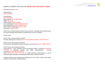 Rotenschwanz (Polska) sp. z o.o. Rynek Starego Miasta 10/7, 00-‐272 Warszawa tel/fax: +48 22 253 61 24, e-‐mail: [email protected] U UANEKS DO UMOWY POŻYCZKI NR ROK/M-C/NR_POZYCZKI/ID_USERA Data zawarcia aneksu: DATA Pożyczkodawca: IMIĘ I NAZWISKO Pożyczkobiorca: IMIĘ I NAZWISKO Data urodzenia: DATA URODZENIA PESEL: NR PESEL Dowód osobisty: SERIA I NUMER Adres zameldowania: ADRES ZAMELDOWANIA Adres zamieszkania: ADRES ZAMIESZKANIA Numer telefonu kontaktowego: NR TEL. KOM. Adres email: ADRES E-MAIL Strony Umowy Pożyczki zawarły aneks do umowy pożyczki, zmieniający termin spłaty pożyczki oraz kwotę należnego Pożyczkodawcy wynagrodzenia za okres jej udzielenia. Zmianie ulega: Punkt 2 umowy, którzy przyjmuje brzmienie: Pożyczka udzielona jest na okres od DATA URUCHOMIENIA do NOWY TERMIN SPŁATY. Punkt 4 umowy, który przyjmuje brzmienie: Pożyczkobiorca zobowiązuje się spłacić pożyczkę w terminie do dnia NOWY TERMIN SPŁATY. Punkt 5 umowy, który przyjmuje brzmienie: Pożyczkodawcy, z tytułu udzielenej pożyczki przysługują odsetki w wysokości WYSOKOŚĆ ODSETEK % udzielonej pożyczki oraz opłata przygotowawcza i prowizja w wysokości WYSOKOŚĆ KOSZTÓW zł. Kwota PIERWOTNY KOSZT POŻYCZKI zł została przekazana Pożyczkodawcy w ramach częściowej spłaty należnego mu wynagrodzenia opisanego w niniejszym punkcie. Niniejszy dokument został wygenerowany elektronicznie przez Serwis i stanowi zapis ustaleń pomiędzy Pożyczkobiorcą a Pożyczkodawcą.