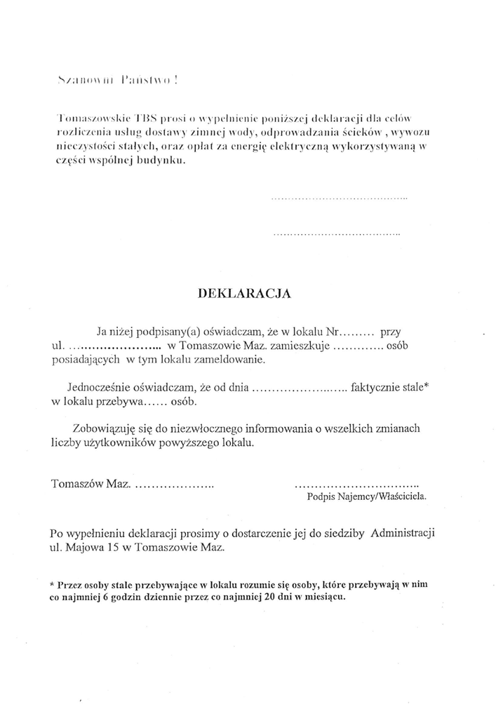 s / ; i i i i rarish\(II 1 ()mas/()A\ sl\it" I HS prosi o y|)cliiii'iiic' poiii/s/,cj (lolilai acji illa relów ro/Jic/ciiia iishig dosla^^ y /iiiiiicj wody, odprowadzania ś c i e k ó w , wyw ozu n i e c z y s t o ś c i sfalycli, oiaz ojilai za energię e l e k t r y c z n ą w y k o r z y s t y w a n ą w c z ę ś c i w s p ó l n e j budynku. DEKLARACJA Ja niżej podpisany(a) oświadczam, że w lokalu Nr ul. w Tomaszowie Maz. zamieszkuje posiadających w tym lokalu zameldowanie. Jednocześnie oświadczam, że od dnia w lokalu przebywa osób. przy osób faktycznie stale* Zobowiązuję się do niezwłocznego informowania o wszelkich zmianach liczby użytkowników powyższego lokalu. Tomaszów Maz Podpis Najemcy/Właściciela. Po wypełnieniu deklaracji prosimy o dostarczenie jej do siedziby ul. Majowa 15 w Tomaszowie Maz. Administracji * Przez osoby stale przebjwvające w lokalu rozumie się osoby, które przebywają w nim co najmniej 6 godzin dziennie przez eo najmniej 20 dni w miesiącu.