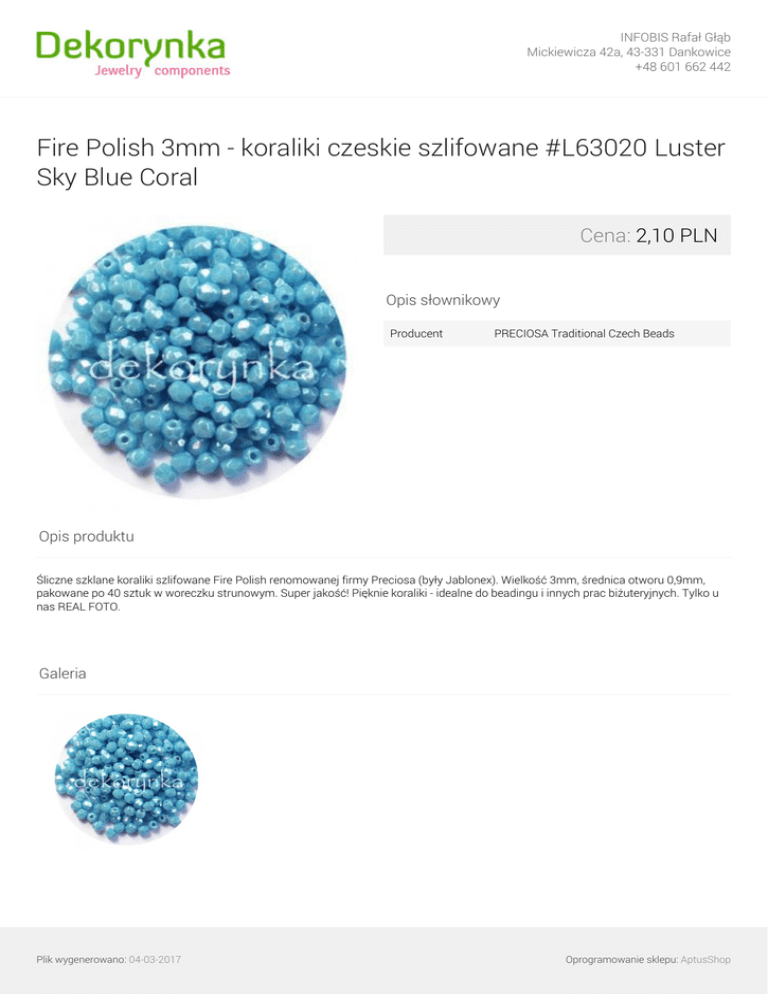 INFOBIS Rafał Głąb Mickiewicza 42a, 43-331 Dankowice +48 601 662 442 Fire Polish 3mm - koraliki czeskie szlifowane #L63020 Luster Sky Blue Coral Cena: 2,10 PLN Opis słownikowy Producent PRECIOSA Traditional Czech Beads Opis produktu Śliczne szklane koraliki szlifowane Fire Polish renomowanej firmy Preciosa (były Jablonex). Wielkość 3mm, średnica otworu 0,9mm, pakowane po 40 sztuk w woreczku strunowym. Super jakość! Pięknie koraliki - idealne do beadingu i innych prac biżuteryjnych. Tylko u nas REAL FOTO. Galeria Plik wygenerowano: 04-03-2017 Powered by TCPDF (www.tcpdf.org) Oprogramowanie sklepu: AptusShop