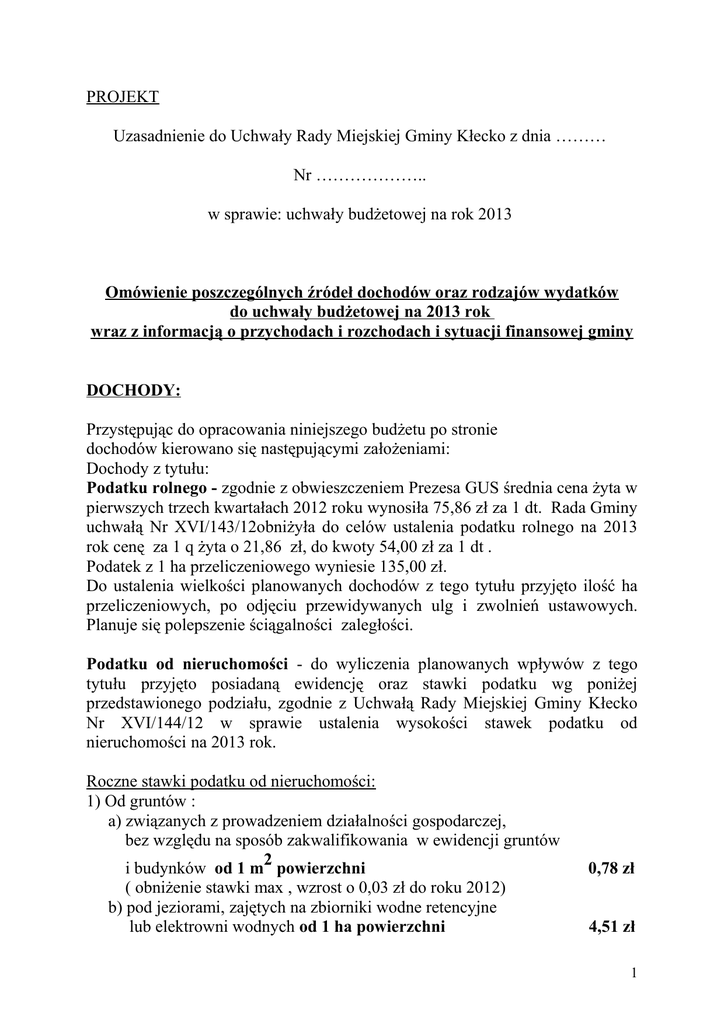 PROJEKT Uzasadnienie do Uchwały Rady Miejskiej Gminy Kłecko z dnia ……… Nr ……………….. w sprawie: uchwały budżetowej na rok 2013 Omówienie poszczególnych źródeł dochodów oraz rodzajów wydatków do uchwały budżetowej na 2013 rok wraz z informacją o przychodach i rozchodach i sytuacji finansowej gminy DOCHODY: Przystępując do opracowania niniejszego budżetu po stronie dochodów kierowano się następującymi założeniami: Dochody z tytułu: Podatku rolnego - zgodnie z obwieszczeniem Prezesa GUS średnia cena żyta w pierwszych trzech kwartałach 2012 roku wynosiła 75,86 zł za 1 dt. Rada Gminy uchwałą Nr XVI/143/12obniżyła do celów ustalenia podatku rolnego na 2013 rok cenę za 1 q żyta o 21,86 zł, do kwoty 54,00 zł za 1 dt . Podatek z 1 ha przeliczeniowego wyniesie 135,00 zł. Do ustalenia wielkości planowanych dochodów z tego tytułu przyjęto ilość ha przeliczeniowych, po odjęciu przewidywanych ulg i zwolnień ustawowych. Planuje się polepszenie ściągalności zaległości. Podatku od nieruchomości - do wyliczenia planowanych wpływów z tego tytułu przyjęto posiadaną ewidencję oraz stawki podatku wg poniżej przedstawionego podziału, zgodnie z Uchwałą Rady Miejskiej Gminy Kłecko Nr XVI/144/12 w sprawie ustalenia wysokości stawek podatku od nieruchomości na 2013 rok. Roczne stawki podatku od nieruchomości: 1) Od gruntów : a) związanych z prowadzeniem działalności gospodarczej, bez względu na sposób zakwalifikowania w ewidencji gruntów i budynków od 1 m2 powierzchni ( obniżenie stawki max , wzrost o 0,03 zł do roku 2012) b) pod jeziorami, zajętych na zbiorniki wodne retencyjne lub elektrowni wodnych od 1 ha powierzchni 0,78 zł 4,51 zł 1 ( stawka max , wzrost o 0,18 zł do roku 2012) c) zajętych pod budownictwo rekreacji indywidualnej i niezabudowanych przeznaczonych pod zabudowę rekreacji indywidualnej od 1 m2 powierzchni 0,45 zł (stawka max , wzrost stawki z roku 2012 o 0,02 zł) d) pozostałych, w tym zajętych na prowadzenie odpłatnej statutowej działalności pożytku publicznego przez organizacje pożytku publicznego od 1 m2 powierzchni 0,21 zł (obniżenie stawki max , wzrost stawki z roku 2012 o 0,01 zł) 2) Od budynków lub ich części: a) mieszkalnych od 1 m2 powierzchni użytkowej 0,66 zł (obniżenie stawki max, wzrost stawki z roku 2012 o 0,03 zł) b) związanych z prowadzeniem działalności gospodarczej oraz od budynków mieszkalnych lub ich części zajętych na prowadzenie działalności gospodarczej od 1 m2 powierzchni użytkowej 17,70 zł ( obniżenie stawki max, wzrost stawki z roku 2012 o 0,70 zł) c) zajętych na prowadzenie działalności gospodarczej w zakresie obrotu kwalifikowanym materiałem siewnym od 1 m2 powierzchni użytkowej 10,65 zł ( stawka maksymalna, wzrost o kwotę 2,15 zł) d) związanych z udzielaniem świadczeń zdrowotnych w rozumieniu przepisów o działalności leczniczej, zajętych przez podmioty udzielające tych świadczeń w zakresie udzielania świadczeń zdrowotnych od 1 m2 powierzchni użytkowej 4,63 zł (stawka max , wzrost stawki z roku 2012 o 0,18 zł) e) rekreacji indywidualnej od 1 m2 powierzchni użytkowej 7,66 zł (stawka max , wzrost stawki z roku 2012 o 0,30 zł) f) pozostałych, w tym zajętych na prowadzenie odpłatnej statutowej działalności pożytku publicznego przez organizacje pożytku publicznego od 1 m2powierzchni 4,50 zł (spełniające wymogi definicji budynku według prawa budowlanego) (obniżenie stawki max , wzrost stawki z roku 2012 o 0,20 zł). 2 3. Od budowli - ich wartości ( stawka max. - na poziomie roku 2012) 2% Podatku od środków transportu Do budżetu przyjęto kwotę wyliczoną na podstawie Uchwały Rady Miejskiej Gminy Kłecko Nr XVI/145/12 w sprawie określenia wysokości stawek podatku od środków transportowych oraz posiadanej ewidencji. Wzrost stawek tego podatku w porównaniu do stawek obowiązujących na terenie gminy w roku 2013 nastąpi przeciętnie o ok. 4 % z uwzględnieniem rodzaju środków transportu, dopuszczalną masę całkowitą. Opłata od posiadania psów na podstawie Uchwały Rady Miejskiej Gminy Kłecko Nr XI/69/07 z 2007 r., która wynosi 25,00 zł od jednego psa. Wielkość przewidywanego dochodu ustalono na podstawie posiadanej ewidencji. Na 2013 rok wysokość pozostawiono stawek na poziomie 2007-2012 roku. Podatku leśnego - plan dochodów ustalono na podstawie posiadanej ewidencji. W zakresie dochodów przekazywanych gminie przez Urząd Skarbowy: Podatku od spadków i darowizn, podatku opłacanego w formie karty podatkowej, podatek od czynności cywilnoprawnych przyjęto do budżetu wielkości dochodów zbliżone do przewidywanego wykonania w roku 2012. Opłaty skarbowej - plan przyjęto szacunkowo na poziomie przewidywanego wykonania roku 2012. Opłata za użytkowanie wieczyste zaplanowano na 2013 rok w oparciu o posiadaną ewidencję. Opłaty targowej, której dochody przyjęto w oparciu o Uchwałę Rady Miejskiej Gminy Kłecko z 2007 r. Nr XI/70/07. Stawka dzienna wynosi 25,00 zł . Czynszów dzierżawny od gruntów przyjęto na podstawie posiadanej ewidencji gruntów przy zastosowaniu ceny żyta za 1 dt 75,86 zł. Dochodów majątkowych ze sprzedaży mienia komunalnego - planuje się sprzedaż nieruchomości za około 400 000,00 zł. Planowana jest sprzedaż: mieszkań oraz nieruchomości. Planowane dochody z mienia komunalnego: 020/02001/0750 700/70005/0470 700/70005/0750 750/75023/0750 801/80101/0750 1 000,00 zł 4 600,00 zł 75 000,00 zł 5 000,00 zł 35 000,00 zł 3 801/80110/0750 921/92109/0750 razem: 1 500,00 zł 4 000,00 zł 126 100,00 zł Pozostałe dochody z najmu mieszkań komunalnych są przychodem Zakładu Gospodarki Komunalnej, który administruje tym mieniem (zgodnie z ustaleniami określonymi w statucie zakładu). Udziały w podatkach: •dochodowym od osób fizycznych - wg pisma Ministra Finansów Nr ST3/4820/9/2012 ustalono dochód gminy z tego tytułu na kwotę 2 286 953,00 z