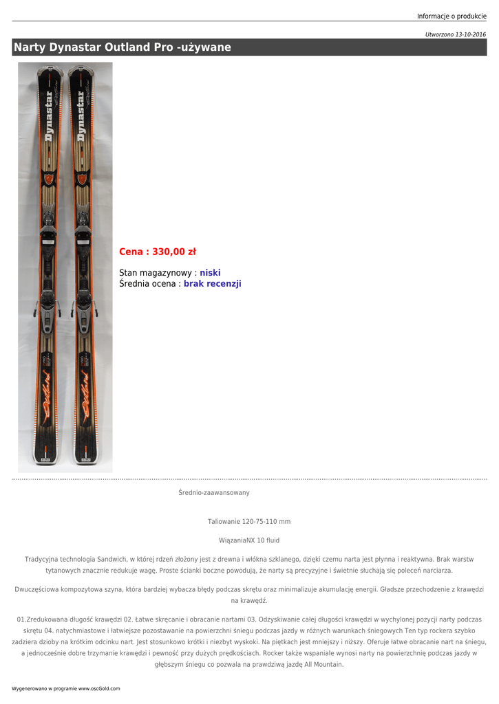 Informacje o produkcie Utworzono 13-10-2016 Narty Dynastar Outland Pro -używane Cena : 330,00 zł Stan magazynowy : niski Średnia ocena : brak recenzji Średnio-zaawansowany Taliowanie 120-75-110 mm WiązaniaNX 10 fluid Tradycyjna technologia Sandwich, w której rdzeń złożony jest z drewna i włókna szklanego, dzięki czemu narta jest płynna i reaktywna. Brak warstw tytanowych znacznie redukuje wagę. Proste ścianki boczne powodują, że narty są precyzyjne i świetnie słuchają się poleceń narciarza. Dwuczęściowa kompozytowa szyna, która bardziej wybacza błędy podczas skrętu oraz minimalizuje akumulację energii. Gładsze przechodzenie z krawędzi na krawędź. 01.Zredukowana długość krawędzi 02. Łatwe skręcanie i obracanie nartami 03. Odzyskiwanie całej długości krawędzi w wychylonej pozycji narty podczas skrętu 04. natychmiastowe i łatwiejsze pozostawanie na powierzchni śniegu podczas jazdy w różnych warunkach śniegowych Ten typ rockera szybko zadziera dzioby na krótkim odcinku nart. Jest stosunkowo krótki i niezbyt wyskoki. Na piętkach jest mniejszy i niższy. Oferuje łatwe obracanie nart na śniegu, a jednocześnie dobre trzymanie krawędzi i pewność przy dużych prędkościach. Rocker także wspaniale wynosi narty na powierzchnię podczas jazdy w głębszym śniegu co pozwala na prawdziwą jazdę All Mountain. Wygenerowano w programie www.oscGold.com Dostępne opcje Narty Dynastar Outland Pro -używane Rozmiar (cm): 156, 166.