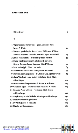 SPIS TREŚCI Od wydawcy 5 I 1 Wprowadzenie historyczne - prof. Ambroise Paré, James P. White 11 2 Początki ginekologii - Robert Latou Dickinson, William Smelile, Benjamin Osiander, Eduard Caspar von Siebold 3 James Marion Sims i pierwsza operacja przetoki 25 39 4 Burza wokół pierwszych bezbolesnych porodów - Sims w Europie. James Simpson, Alfred Velpeau 51 5 Baśń o silnej płci. Sims i poczęcie 63 6 Na zewnątrz czekali kaci - dr Ephraim McDowell 77 7 Pierwsza operacja jajnika - dr Charles Clay, Spencer Wells 89 8 „Papa” Koeberlé i jego zacięty wróg Jules-Émile Péan, Alfred Hegar 103 9 Historia cesarskiego cięcia - dr Sutton w Alabamie 115 10 Cesarskie cięcie - Gustav Adolph Michaelis w Kilonii 125 11 Edoardo Porro w Pawii - Ferdinand Adolf Kehrer w Heidelbergu 135 12 Antykoncepcja - dr Wilhelm Mensinga we Flensburgu 147 13 Przeciwko kontroli płodności 157 14 Dr Aletta Jacobs w Holandii 169 15 Pigułka antykoncepcyjna 181 II 1 6 Dr George Papanicolaou - człowiek, któremu miliony kobiet zawdzięczają życie 195 17 Badanie cytologiczne służące wczesnemu wykrywaniu raka 207 18 Dr Johann Sauter z Konstancji 217 19 Dr Wilhelm Alexander Freund - niepokorny z Wrocławia 229 2 0 Dr Friedrich Schauta i dr Ernst Wertheim - dwaj rywale 243 21 Współzawodnictwo dwóch metod operacyjnych raka przez pochwę i przez brzuch 25 5 22 Pros. Albert Döderlein i rad 267 23 Radem w raka macicy 277 24 Pros. Bernhard i promieniowanie rentgenowskie 287 25 Pros. Walter Stoeckel - „Stal czy promień” 301 26 Dr Aleck Bourne i przypadek Milly Brown 315 27 Ustawy antyaborcyjne na całym świecie 327 28 Uniewinnienie dra Boume’a 339 29 Ma nie boleó - „bezbolesny poród” 357 30 Dr Dick-Read - triumf, który przyszedł za późno 371