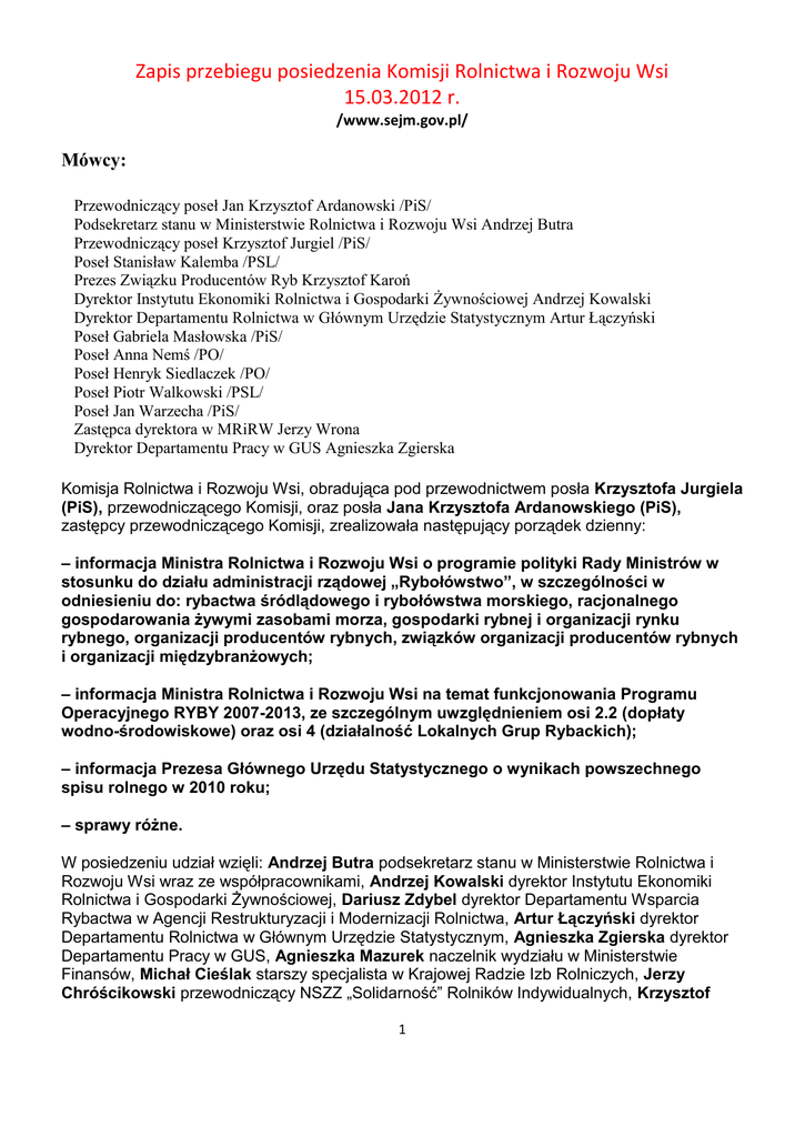 Zapis przebiegu posiedzenia Komisji Rolnictwa i Rozwoju Wsi 15.03.2012 r. /www.sejm.gov.pl/ Mówcy: Przewodniczący poseł Jan Krzysztof Ardanowski /PiS/ Podsekretarz stanu w Ministerstwie Rolnictwa i Rozwoju Wsi Andrzej Butra Przewodniczący poseł Krzysztof Jurgiel /PiS/ Poseł Stanisław Kalemba /PSL/ Prezes Związku Producentów Ryb Krzysztof Karoń Dyrektor Instytutu Ekonomiki Rolnictwa i Gospodarki Żywnościowej Andrzej Kowalski Dyrektor Departamentu Rolnictwa w Głównym Urzędzie Statystycznym Artur Łączyński Poseł Gabriela Masłowska /PiS/ Poseł Anna Nemś /PO/ Poseł Henryk Siedlaczek /PO/ Poseł Piotr Walkowski /PSL/ Poseł Jan Warzecha /PiS/ Zastępca dyrektora w MRiRW Jerzy Wrona Dyrektor Departamentu Pracy w GUS Agnieszka Zgierska Komisja Rolnictwa i Rozwoju Wsi, obradująca pod przewodnictwem posła Krzysztofa Jurgiela (PiS), przewodniczącego Komisji, oraz posła Jana Krzysztofa Ardanowskiego (PiS), zastępcy przewodniczącego Komisji, zrealizowała następujący porządek dzienny: – informacja Ministra Rolnictwa i Rozwoju Wsi o programie polityki Rady Ministrów w stosunku do działu administracji rządowej „Rybołówstwo”, w szczególności w odniesieniu do: rybactwa śródlądowego i rybołówstwa morskiego, racjonalnego gospodarowania żywymi zasobami morza, gospodarki rybnej i organizacji rynku rybnego, organizacji producentów rybnych, związków organizacji producentów rybnych i organizacji międzybranżowych; – informacja Ministra Rolnictwa i Rozwoju Wsi na temat funkcjonowania Programu Operacyjnego RYBY 2007-2013, ze szczególnym uwzględnieniem osi 2.2 (dopłaty wodno-środowiskowe) oraz osi 4 (działalność Lokalnych Grup Rybackich); – informacja Prezesa Głównego Urzędu Statystycznego o wynikach powszechnego spisu rolnego w 2010 roku; – sprawy różne. W posiedzeniu udział wzięli: Andrzej Butra podsekretarz stanu w Ministerstwie Rolnictwa i Rozwoju Wsi wraz ze współpracownikami, Andrzej Kowalski dyrektor Instytutu Ekonomiki Rolnictwa i Gospodarki Żywnościowej, Dariusz Zdybel dyrektor Departamentu Wsparcia Rybactwa w Agencji Restrukturyzacji i Modernizacji Rolnictwa, Artur Łączyński dyrektor Departamentu Rolnictwa w Głównym Urzędzie Statystycznym, Agnieszka Zgierska dyrektor Departamentu Pracy w GUS, Agnieszka Mazurek naczelnik wydziału w Ministerstwie Finansów, Michał Cieślak starszy specjalista w Krajowej Radzie Izb Rolniczych, Jerzy Chróścikowski przewodniczący NSZZ „Solidarność” Rolników Indywidualnych, Krzysztof 1 Karoń prezes Związku Producentów Ryb, Marek Trzcieliński wiceprezes ZPR, Edyta Kozdroń specjalista w Europejskim Funduszu Rozwoju Wsi Polskiej, Stanisław Wittek wiceprezes Federacji Związków Pracodawców-Dzierżawców i Właścicieli Rolnych, Jacek Staciwa członek Zarządu Krajowego Związku Rewizyjnego Rolniczych Spółdzielni Produkcyjnych, Mariusz Gołębiowski zastępca przewodniczącego Związku Zawodowego Rolników „Ojczyzna” oraz Grzegorz Brzostek doradca ekonomiczny w Najwyższej Izby Kontroli. W posiedzeniu udział wzięli pracownicy Kancelarii Sejmu: Włodzimierz Wieczorkowski, Magdalena Kowalska i Andrzej Wolin – z sekretariatu Komisji w Biurze Komisji Sejmowych. Przewodniczący poseł Krzysztof Jurgiel (PiS): Otwieram posiedzenie Komisji Rolnictwa i Rozwoju Wsi. Witam przybyłych gości, resort rolnictwa i rozwoju wsi, a także przedstawicieli stowarzyszeń i organizacji, zainteresowanych dzisiejszymi obradami Komisji. Porządek dzisiejszego spotkania jest następujący: informacja Ministra Rolnictwa i Rozwoju Wsi o programie polityki Rady Ministrów w stosunku do działu administracji rządowej „Rybołówstwo”, w szczególności w odniesieniu do rybactwa śródlądowego i rybołówstwa morskiego, racjonalnego gospodarowania żywymi zasobami morza, gospodarki rybnej i organizacji rynku rybnego, organizacji producentów rybnych, związków organizacji producentów rybnych i organizacji międzybranżowych; informacja Ministra Rolnictwa i Rozwoju Wsi na temat funkcjonowania Programu Operacyjnego RYBY 2007-2013, ze szczególnym uwzględnieniem osi 2.2 (dopłaty wodno-środowiskowe) oraz osi 4 (działalność Lokalnych Grup Rybackich); trzeci punkt – informacja prezesa Głównego Urzędu Statystycznego o wynikach powszechnego spisu rolnego w 2010 roku. Czy są jakieś uwagi do porządku dziennego? Proponuję dopisać sprawy różne. Może coś wyniknie w trakcie posiedzenia. Chciałem na wstępie poinformować, że prezydium postanowiło na jutro, piątek, zwołać posiedzenie Komisji o godzinie 12.00 w celu rozpatrzenia informacji na temat stanu prywatyzacji Krajowej Spółki Cukrowej. Wszyscy już dostaliście zaproszenia. Dzieją się tam sprawy, z którymi powinniśmy się zapoznać i ewentualnie podjąć opinię w tym obszarze. Otrzymaliśmy informacje od plantatorów, którzy wczoraj byli na spotkaniu z prezydium i przedłożyli odpowiednie pismo, i na tej podstawie postanowiliśmy zająć się sprawą, żeby nie popełnić grzechu zaniechania. Salę możemy dziś zajmować do godziny 11.45, tak że mamy sporo czasu. Proponuję, aby dwa pierwsze punkty zreferował pan minister Butra. Prośba, żeby przedstawić te główne sprawy, które resort uznaje za najważniejsze i najpilniejsze, o których powinna wiedzieć Komisja. Poza tym są one przedstawione w informacji. Papier wszystko przyjmuje, ale czasami można więcej dopowiedzieć. Bardzo proszę, panie ministrze. Podsekretarz stanu w Ministerstwie Rolnictwa i Rozwoju Wsi Andrzej Butra: Panie przewodniczący, Wysoka Komisjo. Program polityki Rady Ministrów w stosunku do działu administracji rządowej – Rybołówstwo, w szczególności w odniesieniu do rybactwa śródlądowego i rybołówstwa morskiego, obejmuje następujące zagadnienia: zapewnienie sprawnej realizacji, we współpracy z wyznaczonymi instytucjami pośredniczącymi, Programu operacyjnego Ryby 2007-2013 w celu wykorzystania alokacji środków f