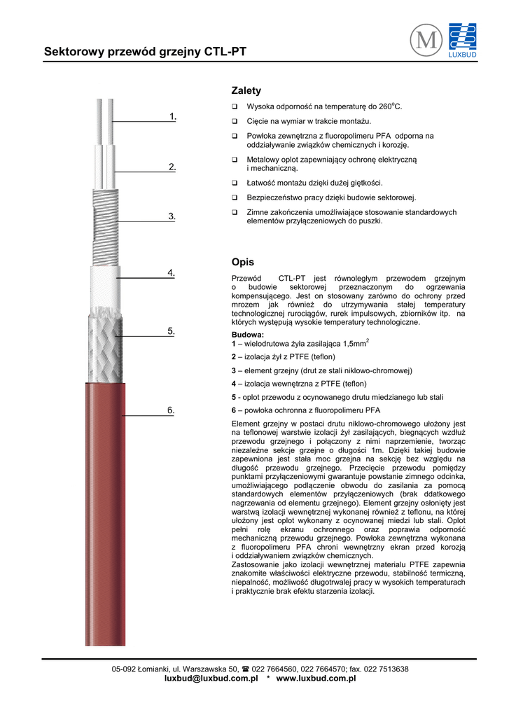 Sektorowy przewód grzejny CTL-PT Zalety o Wysoka odporność na temperaturę do 260 C. Cięcie na wymiar w trakcie montażu. Powłoka zewnętrzna z fluoropolimeru PFA odporna na oddziaływanie związków chemicznych i korozję. Metalowy oplot zapewniający ochronę elektryczną i mechaniczną. Łatwość montażu dzięki dużej giętkości. Bezpieczeństwo pracy dzięki budowie sektorowej. Zimne zakończenia umożliwiające stosowanie standardowych elementów przyłączeniowych do puszki. Opis Przewód CTL-PT jest równoległym przewodem grzejnym o budowie sektorowej przeznaczonym do ogrzewania kompensującego. Jest on stosowany zarówno do ochrony przed mrozem jak również do utrzymywania stałej temperatury technologicznej rurociągów, rurek impulsowych, zbiorników itp. na których występują wysokie temperatury technologiczne. Budowa: 2 1 – wielodrutowa żyła zasilająca 1,5mm 2 – izolacja żył z PTFE (teflon) 3 – element grzejny (drut ze stali niklowo-chromowej) 4 – izolacja wewnętrzna z PTFE (teflon) 5 - oplot przewodu z ocynowanego drutu miedzianego lub stali 6 – powłoka ochronna z fluoropolimeru PFA Element grzejny w postaci drutu niklowo-chromowego ułożony jest na teflonowej warstwie izolacji żył zasilających, biegnących wzdłuż przewodu grzejnego i połączony z nimi naprzemienie, tworząc niezależne sekcje grzejne o długości 1m. Dzięki takiej budowie zapewniona jest stała moc grzejna na sekcję bez względu na długość przewodu grzejnego. Przecięcie przewodu pomiędzy punktami przyłączeniowymi gwarantuje powstanie zimnego odcinka, umożliwiającego podlączenie obwodu do zasilania za pomocą standardowych elementów przyłączeniowych (brak ddatkowego nagrzewania od elementu grzejnego). Element grzejny osłonięty jest warstwą izolacji wewnętrznej wykonanej również z teflonu, na której ułożony jest oplot wykonany z ocynowanej miedzi lub stali. Oplot pełni rolę ekranu ochronnego oraz poprawia odporność mechaniczną przewodu grzejnego. Powłoka zewnętrzna wykonana z fluoropolimeru PFA chroni wewnętrzny ekran przed korozją i oddziaływaniem związków chemicznych. Zastosowanie jako izolacji wewnętrznej materialu PTFE zapewnia znakomite właściwości elektryczne przewodu, stabilność termiczną, niepalność, możliwość długotrwalej pracy w wysokich temperaturach i praktycznie brak efektu starzenia izolacji. 05-092 Łomianki, ul. Warszawska 50, 022 7664560, 022 7664570; fax. 022 7513638 [email protected] * www.luxbud.com.pl Sektorowy przewód grzejny CTL-PT Dane techniczne Moc grzejna 1m sekcji : CTL-PT 33 CTL-PT 45 33W/m 45W/m Napięcie znamionowe : 230V Max. temperatura pracy : o o +180 C (przewód pod napięciem) +150 C Max. temperatura wytrzymywana : o +260 C (napięcie wyłączone) Max. długość obwodu : 90m 75m Zabezpieczenie nadmiarowe : charakterystyka „B” ; max. 16A Przekrój żył zasilających : 1,5mm Izolacja żył : 2 PTFA (Teflon) Powłoka zewnętrzna : PFA Min. promień gięcia : 20mm Min. temp. montażu : -55 C o Wymiary : 8 x 6mm Długość sekcji grzejnej : 1m Zgodność z Dyrektywą : LVD 2006/95/EC wg IEC / EN 62395 C h -k a m o c y g r z e jn e j n a p ię c ie 2 3 0 V [W /m ] 50 CTL 45 40 CTL 33 30 20 10 0 -6 0 -4 0 -2 0 0 20 40 60 80 10 0 12 0 14 0 16 0 18 0 20 0 22 0 24 0 05-092 Łomianki, ul. Warszawska 50, 022 7664560, 022 7664570; fax. 022 7513638 [email protected] * www.luxbud.com.pl o 26 0 [ C ]