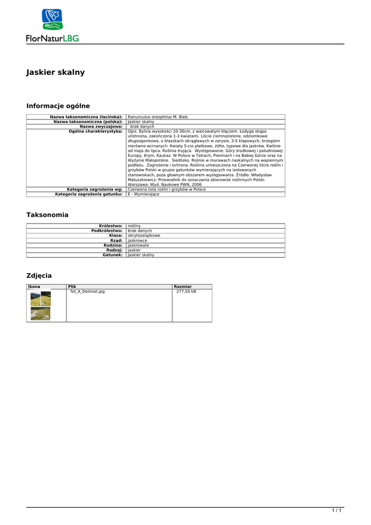 Jaskier skalny Informacje ogólne Nazwa taksonomiczna (łacińska): Nazwa taksonomiczna (polska): Nazwa zwyczajowa: Ogólna charakterystyka: Kategoria zagrożenia wg: Kategoria zagrożenia gatunku: Ranunculus oreophilus M. Bieb. Jaskier skalny brak danych Opis. Bylina wysokości 10-30cm, z walcowatym kłączem. Łodyga skąpo ulistniona, zakończona 1-3 kwiatami. Liście ciemnozielone, odziomkowe długoogonkowe, o blaszkach okrągławych w zarysie, 3-5 klapowych, brzegiem nierówno wcinanych. Kwiaty 5-cio płatkowe, żółte, typowe dla jaskrów. Kwitnie od maja do lipca. Roślina trująca. Występowanie. Góry środkowej i południowej Europy, Krym, Kaukaz. W Polsce w Tatrach, Pieninach i na Babiej Górze oraz na Wyżynie Małopolskie. Siedlisko. Rośnie w murawach naskalnych na wapiennym podłożu. Zagrożenie i ochrona. Roślina umieszczona na Czerwonej liście roślin i grzybów Polski w grupie gatunków wymierających na izolowanych stanowiskach, poza głownym obszarem występowania. Źródło: Władysław Matuszkiewicz: Przewodnik do oznaczania zbiorowisk roślinnych Polski. Warszawa: Wyd. Naukowe PWN, 2006 Czerwona lista roślin i grzybów w Polsce E - Wymierające Taksonomia Królestwo: Podkrólestwo: Klasa: Rząd: Rodzina: Rodzaj: Gatunek: rośliny brak danych okrytozalążkowe jaskrowce jaskrowate jaskier Jaskier skalny Zdjęcia Ikona Plik fot_A_Delimat.jpg Rozmiar 277,50 kB 1/1 Powered by TCPDF (www.tcpdf.org)