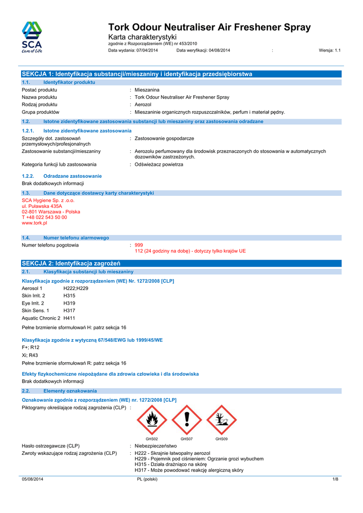 Tork Odour Neutraliser Air Freshener Spray Karta charakterystyki zgodnie z Rozporządzeniem (WE) nr 453/2010 Data wydania: 07/04/2014 Data weryfikacji: 04/08/2014 : Wersja: 1.1 SEKCJA 1: Identyfikacja substancji/mieszaniny i identyfikacja przedsiębiorstwa 1.1. Identyfikator produktu Postać produktu : Mieszanina Nazwa produktu : Tork Odour Neutraliser Air Freshener Spray Rodzaj produktu : Aerozol Grupa produktów : Mieszaninie organicznych rozpuszczalników, perfum i materiał pędny. 1.2. Istotne zidentyfikowane zastosowania substancji lub mieszaniny oraz zastosowania odradzane 1.2.1. Istotne zidentyfikowane zastosowania Szczegóły dot. zastosowań przemysłowych/profesjonalnych : Zastosowanie gospodarcze Zastosowanie substancji/mieszaniny : Aerozolu perfumowany dla środowisk przeznaczonych do stosowania w automatycznych dozowników zastrzeżonych. Kategoria funkcji lub zastosowania : Odświeżacz powietrza 1.2.2. Odradzane zastosowanie Brak dodatkowych informacji 1.3. Dane dotyczące dostawcy karty charakterystyki SCA Hygiene Sp. z .o.o. ul. Puławska 435A 02-801 Warszawa - Polska T +48 022 543 50 00 www.tork.pl 1.4. Numer telefonu alarmowego Numer telefonu pogotowia : 999 112 (24 godziny na dobę) - dotyczy tylko krajów UE SEKCJA 2: Identyfikacja zagrożeń 2.1. Klasyfikacja substancji lub mieszaniny Klasyfikacja zgodnie z rozporządzeniem (WE) Nr. 1272/2008 [CLP]# Aerosol 1 H222;H229 Skin Irrit. 2 H315 Eye Irrit. 2 H319 Skin Sens. 1 H317 Aquatic Chronic 2 H411 Pełne brzmienie sformułowań H: patrz sekcja 16 Klasyfikacja zgodnie z wytyczną 67/548/EWG lub 1999/45/WE F+; R12 Xi; R43 Pełne brzmienie sformułowań R: patrz sekcja 16 Efekty fizykochemiczne niepożądane dla zdrowia człowieka i dla środowiska Brak dodatkowych informacji 2.2. Elementy oznakowania Oznakowanie zgodnie z rozporządzeniem (WE) nr. 1272/2008 [CLP] Piktogramy określające rodzaj zagrożenia (CLP) : GHS02 GHS07 GHS09 Hasło ostrzegawcze (CLP) : Niebezpieczeństwo Zwroty wskazujące rodzaj zagrożenia (CLP) : H222 - Skrajnie łatwopalny aerozol H229 - Pojemnik pod ciśnieniem: Ogrzanie grozi wybuchem H315 - Działa drażniąco na skórę H317 - Może powodować reakcję alergiczną skóry 05/08/2014 PL (polski) 1/8 Tork Odour Neutraliser Air Freshener Spray Karta charakterystyki zgodnie z Rozporządzeniem (WE) nr 453/2010 H319 - Działa drażniąco na oczy H411 - Działa toksycznie na organizmy wodne, powodując długotrwałe skutki Zwroty wskazujące środki ostrożności (CLP) : P210 - Przechowywać z dala od źródeł ciepła, gorących powierzchni, źródeł iskrzenia, otwartego ognia i innych źródeł zapłonu. Nie palić P251 - Nie przekłuwać ani nie spalać, nawet po zużyciu P261 - Unikać wdychania rozpylonej cieczy, gazu, par P264 - Dokładnie umyć skóra po użyciu P272 - Zanieczyszczonej odzieży ochronnej nie wynosić poza miejsce pracy P273 - Unikać uwolnienia do środowiska Dodatkowe zwroty : Pojemnik znajduje się pod ciśnieniem. Chronić przed promieniami słonecznymi i temperaturą powyżej 50 °C. Również po użyciu nie otwierać gwałtownie lub spalać. Nie spryskiwać żarzących się przedmiotów i płomienia. 2.3. Inne zagrożenia Brak dodatkowych informacji SEKCJA 3: Skład/informacja o składnikach 3.1. Substancja Nie dotyczy 3.2. Mieszanina Nazwa Identyfikator produktu % Klasyfikacja zgodnie z dyrektywą 67/548/EEC Izobutan (Numer CAS) 75-28-5 (Numer WE) 200-857-2 (Numer indeksowy) 601-004-00-0 (REACH-nr) 01-2119485395-27 40 - 50 F+; R12 Ethanol # (Numer CAS) 64-17-5 (Numer WE) 200-578-6 (Numer indeksowy) 603-002-00-5 (REACH-nr) 01-2119457610-43 10 - 20 F; R11 Propan (Numer CAS) 74-98-6 (Numer WE) 200-827-9 (Numer indeksowy) 601-003-00-5 (REACH-nr) 01-2119486944-21 10 - 20 F+; R12 Citral # (Numer CAS) 5392-40-5 (Numer WE) 226-394-6 (Numer indeksowy) 605-019-00-3 (REACH-nr) 01-2119462829-23 1 - 10 Xi; R38 Xi; R43 Isopropanol (Propan-2-ol) # (Numer CAS) 67-63-0 (Numer WE) 200-661-7 (Numer indeksowy) 603-117-00-0 (REACH-nr) 01-211947558-25 1 - 10 F; R11 Xi; R36 R67 D-Limonene # (Numer CAS) 5989-27-5 (Numer WE) 227-813-5 (Numer indeksowy) 601-029-00-7 1 - 10 R10 Xi; R38 Xi; R43 N; R50/53 2-metylopentano-2,4-diol, glikol heksylenowy (Numer CAS) 107-41-5 (Numer WE) 203-489-0 (Numer indeksowy) 603-053-00-3 0 - 0,5 Xi; R36/38 Nazwa Identyfikator produktu Specyficzne stezenia graniczne 2-metylopentano-2,4-diol, glikol heksylenowy (Numer CAS) 107-41-5 (Numer WE) 203-489-0 (Numer indeksowy) 603-053-00-3 (C >= 10) Xi;R36/38 Nazwa Identyfikator produktu % Klasyfikacja zgodnie z rozporządzeniem (WE) Nr. 1272/2008 [CLP] Izobutan (Numer CAS) 75-28-5 (Numer WE) 200-857-2 (Numer indeksowy) 601-004-00-0 (REACH-nr) 01-2119485395-27 40 - 50 Flam. Gas 1, H220 Press. Gas Ethanol # (Numer CAS) 64-17-5 (Numer WE) 200-578-6 (Numer indeksowy) 603-002-00-5 (REACH-nr) 01-2119457610-43 10 - 20 Flam. Liq. 2, H225 Propan (Numer CAS) 74-98-6 (Numer WE) 200-827-9 (Numer indeksowy) 601-003-00-5 (REACH-nr) 01-2119486944-21 10 - 20 Flam. Gas 1, H220 Press. Gas Citral # (Numer CAS) 5392-40-5 (Numer WE) 226-394-6 (Numer indeksowy) 605-019-00-3 (REACH-nr) 01-2119462829-23 1 - 10 Skin Irrit. 2, H315 Skin Sens. 1, H317 05/08/2014 PL (polski) 2/8 Tork Odour Neutraliser Air Freshener Spray Karta charakterystyki zgodnie z Rozporządzeniem (WE) nr 453/2010 Nazwa Identyfikator produktu % Klasyfikacja zgodnie z rozporządzeniem (WE) Nr. 1272/2008 [CLP] Isopropanol (Propan-2-ol) # (Numer CAS) 67-63-0 (Numer WE) 200-661-7 (Numer indeksowy) 603-117-00-0 (REACH-nr) 01-211947558-25 1 - 10 Flam. Liq. 2, H225 Eye Irrit. 2, H319 STOT SE 3, H336 D-Limonene # (Numer CAS) 5989-27-5 (Numer WE) 227-813-5 (Numer indeksowy) 601-029-00-7 1 - 10 Flam. Liq. 3, H226 Skin Irrit. 2, H315 Skin Sens. 1, H317 Aquatic Acute 1, H400 Aquatic Chronic 1, H410 2-metylopentano-2,4-diol, glikol heksylenowy (Numer CAS) 107-41-5 (Numer WE) 203-489-0 (Numer indeksowy) 603-053-00-3 0 - 0,5 Eye Irrit. 2, H319 Skin Irrit. 2, H315 Brzmienie sformułowań R