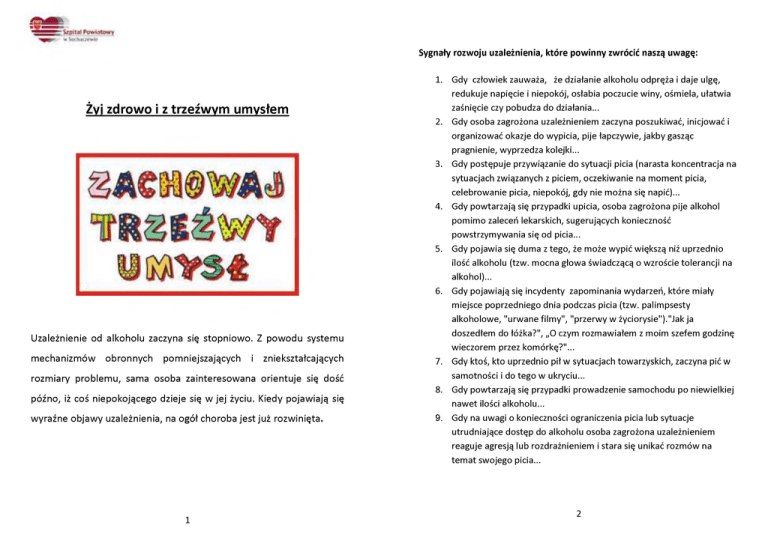 Sygnały rozwoju uzależnienia, które powinny zwrócić naszą uwagę: 1. Gdy człowiek zauważa, że działanie alkoholu odpręża i daje ulgę, redukuje napięcie i niepokój, osłabia poczucie winy, ośmiela, ułatwia Żyj zdrowo i z trzeźwym umysłem zaśnięcie czy pobudza do działania... 2. Gdy osoba zagrożona uzależnieniem zaczyna poszukiwać, inicjować i organizować okazje do wypicia, pije łapczywie, jakby gasząc pragnienie, wyprzedza kolejki... 3. Gdy postępuje przywiązanie do sytuacji picia (narasta koncentracja na sytuacjach związanych z piciem, oczekiwanie na moment picia, celebrowanie picia, niepokój, gdy nie można się napić)... 4. Gdy powtarzają się przypadki upicia, osoba zagrożona pije alkohol pomimo zaleceń lekarskich, sugerujących konieczność powstrzymywania się od picia... 5. Gdy pojawia się duma z tego, że może wypić większą niż uprzednio ilość alkoholu (tzw. mocna głowa świadczącą o wzroście tolerancji na alkohol)... 6. Gdy pojawiają się incydenty zapominania wydarzeń, które miały miejsce poprzedniego dnia podczas picia (tzw. palimpsesty alkoholowe, "urwane filmy", "przerwy w życiorysie")."Jak ja doszedłem do łóżka?", „O czym rozmawiałem z moim szefem godzinę Uzależnienie od alkoholu zaczyna się stopniowo. Z powodu systemu mechanizmów obronnych pomniejszających i zniekształcających wieczorem przez komórkę?"... 7. samotności i do tego w ukryciu... rozmiary problemu, sama osoba zainteresowana orientuje się dość późno, iż coś niepokojącego dzieje się w jej życiu. Kiedy pojawiają się wyraźne objawy uzależnienia, na ogół choroba jest już rozwinięta. Gdy ktoś, kto uprzednio pił w sytuacjach towarzyskich, zaczyna pić w 8. Gdy powtarzają się przypadki prowadzenie samochodu po niewielkiej nawet ilości alkoholu... 9. Gdy na uwagi o konieczności ograniczenia picia lub sytuacje utrudniające dostęp do alkoholu osoba zagrożona uzależnieniem reaguje agresją lub rozdrażnieniem i stara się unikać rozmów na temat swojego picia... 1 2 10. Gdy zaczynają się powtarzać wewnętrzne, nieudane próby ograniczenia picia lub przysięgi abstynencji po to, aby udowodnić sobie posiadanie Konsekwencje nadużywania alkoholu: Skutki zdrowotne ^ kontroli nad piciem alkoholu... nerwowość, poirytowanie, koszmary, halucynacje, konwulsje. 11. Gdy powtarza się regularne wypijanie dużych dawek alkoholu zwiększa się ilość i częstotliwość spożywania alkoholu, np. jednorazowo powyżej Oznaki głodu: drżenie, nudności, wymioty, bóle żołądka, pocenie się, ^ Upośledzenie systemu trawiennego: podrażnienie przewodu 100 gramów etanolu lub regularne codziennie spożywanie powyżej 20 pokarmowego, zapalenie trzustki, krwawienie układu pokarmowego, gramów etanolu... upośledzenie wątroby i zniszczenie komórek wątrobowych. 12. Gdy dzień zaczyna się od picia alkoholu (np. poranne piwo)... 13. Gdy używanie alkoholu staje się sposobem ^ usuwania przykrych skutków poprzedniego picia (klinowanie)... 14. Gdy rosną negatywne konsekwencje nadużywania alkoholu, a mimo to picie jest nadal kontynuowane... Upośledzenie układu krążenia: nadciśnienie tętnicze, niewydolność serca. ^ Nowotwory: ust, gardła, przełyku, wątroby. ^ Częste infekcje: żółtaczka wirusowa, suchoty. ^ Zaburzenia psychiczne i neurologiczne: agresywność, drażliwość, zły nastrój, osłabienie woli i panowania nad sobą, bezsenność, niepokój, stany depresyjne z ryzykiem samobójstwa, utrata pamięci, osłabienie uwagi, MOŻE TO OZNACZAĆ, ŻE JESTEŚ UZALEŻNIONY - NIE CZEKAJ, IDŹ DO SPECJALISTY, PAMIĘTAJ UZALEŻNIENIE TO NIE KATAR SAMO NIE PRZEJDZIE!!! stany szaleństwa, ryzyko hospitalizacji psychiatrycznym, zapalenie wielonerwowe nóg w szpitalu ryzyko paraliżu, zapalenie nerwu wzrokowego ryzyko utraty wzroku. Skutki społeczne ^ Rezygnacja z kontroli nad swoim życiem codziennym: zaniedbania w wychowaniu i edukacji dzieci, zadłużenie i bieda ^ Utrata wszelkich więzi społecznych, co może prowadzić do marginalizacji: ^ Zerwanie więzi rodzinnych: separacja, rozwód, utrata kontaktu i więzi z dziećmi. ^ Sprawy sądowe: prowadzenie przemoc pojazdów w małżeństwie, w stanie porzucenie nietrzeźwości, utarczki w miejscach publicznych. Skutki zawodowe ^ 3 Nieobecność w pracy, nieregularność, spóźnianie się. ^ Wypadki w pracy: ^ Trudności w wypełnianiu obowiązków zawodowych ^ Dymisja, sankcje dyscyplinarna, zwolnienie dyscyplinarne. 4 rodziny, i bójki