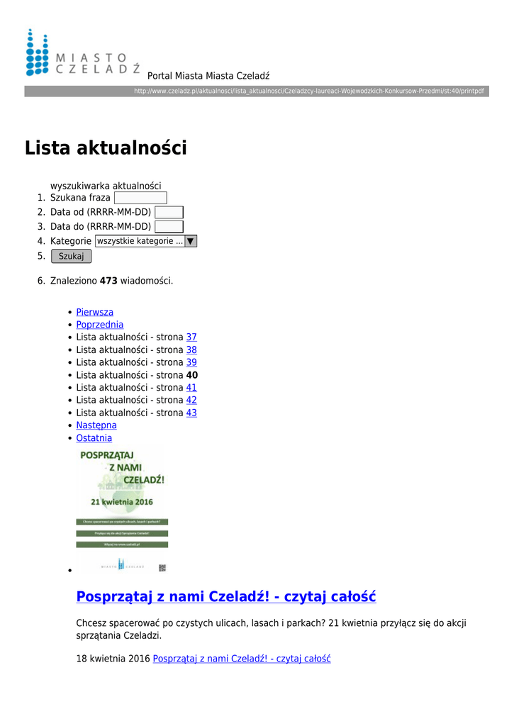 Portal Miasta Miasta Czeladź http://www.czeladz.pl/aktualnosci/lista_aktualnosci/Czeladzcy-laureaci-Wojewodzkich-Konkursow-Przedmi/st:40/printpdf Lista aktualności wyszukiwarka aktualności 1. Szukana fraza 2. Data od (RRRR-MM-DD) 3. Data do (RRRR-MM-DD) 4. Kategorie wszystkie kategorie ... ▼ 5. Szukaj 6. Znaleziono 473 wiadomości. Pierwsza Poprzednia Lista aktualności - strona 37 Lista aktualności - strona 38 Lista aktualności - strona 39 Lista aktualności - strona 40 Lista aktualności - strona 41 Lista aktualności - strona 42 Lista aktualności - strona 43 Następna Ostatnia Posprzątaj z nami Czeladź! - czytaj całość Chcesz spacerować po czystych ulicach, lasach i parkach? 21 kwietnia przyłącz się do akcji sprzątania Czeladzi. 18 kwietnia 2016 Posprzątaj z nami Czeladź! - czytaj całość Debata Społeczna w GSW "Elektrownia" - czytaj całość Komendant Komisariatu Policji w Czeladzi zaprasza mieszkańców na debatę społeczną. 15 kwietnia 2016 Debata Społeczna w GSW "Elektrownia" - czytaj całość Wygramy siłownię zewnętrzną? - czytaj całość Wszystko zależy od aktywności mieszkańców w głosowaniu internetowym. Czeladź bierze udział w konkursie Nestle Porusza Polskę. 15 kwietnia 2016 Wygramy siłownię zewnętrzną? - czytaj całość Stowarzyszenie Rodziców Uczniów Gimnazjum nr 3 im. Polskiej Macierzy Polskiej w Czeladzi - czytaj całość Nazwa zadania: Przeżyj to sam – niezapomniana wycieczka sposobem na zmianę światopoglądu w drodze ku dorosłości. 15 kwietnia 2016 Stowarzyszenie Rodziców Uczniów Gimnazjum nr 3 im. Polskiej Macierzy Polskiej w Czeladzi - czytaj całość Tereny Zagłębia Dąbrowskiego w średniowieczu - czytaj całość 13 kwietnia Muzeum Saturn gościło dr hab. Bożenę Czwojdrak, wybitną mediewistkę, adiunkta w Zakładzie Historii Średniowiecznej Uniwersytetu Śląskiego. 14 kwietnia 2016 Tereny Zagłębia Dąbrowskiego w średniowieczu - czytaj całość Zbiórka odpadów wielkogabarytowych - czytaj całość W dniach od 18 do 29 kwietnia br. odbywać się będzie zbiórka odpadów wielkogabarytowych oraz zużytego sprzętu elektrycznego i elektronicznego tzw. elektrośmieci. 14 kwietnia 2016 Zbiórka odpadów wielkogabarytowych - czytaj całość Od przedszkola do seniora - czytaj całość Zapraszamy wszystkich seniorów i przedszkolaków, a w szczególności dziadków z wnukami do udziału w imprezie sportowej. 14 kwietnia 2016 Od przedszkola do seniora - czytaj całość Niedzielny Teatrzyk dla Najmłodszych - czytaj całość Miasto Czeladź wraz z Spółdzielczym Domem Kultury „Odeon” serdecznie zapraszają wszystkie dzieciaki na spektakl teatralny pt. „Królestwo Wesołuszka”, w ramach cyklu Niedzielny Teatrzyk dla Najmłodszych. 14 kwietnia 2016 Niedzielny Teatrzyk dla Najmłodszych - czytaj całość Obchody Dnia Pamięci Ofiar Zbrodni Katyńskiej - czytaj całość W środę, 13 kwietnia mieszkańcy Czeladzi – jak co roku – uczcili Dzień Pamięci Ofiar Zbrodni Katyńskiej. Kwiaty złożono przed pomnikami, upamiętniającym zamordowanych. 13 kwietnia 2016 Obchody Dnia Pamięci Ofiar Zbrodni Katyńskiej - czytaj całość Chińczycy zainteresowani inwestowaniem w Czeladzi czytaj całość Już po raz drugi, w ciągu ostatnich kilku miesięcy, Czeladź odwiedziła delegacja chińskich biznesmenów. 12 kwietnia 2016 Chińczycy zainteresowani inwestowaniem w Czeladzi - czytaj całość Pierwsza Poprzednia Lista aktualności - strona 37 Lista aktualności - strona 38 Lista aktualności - strona 39 Lista aktualności - strona 40 Lista aktualności - strona 41 Lista aktualności - strona 42 Lista aktualności - strona 43 Następna Ostatnia