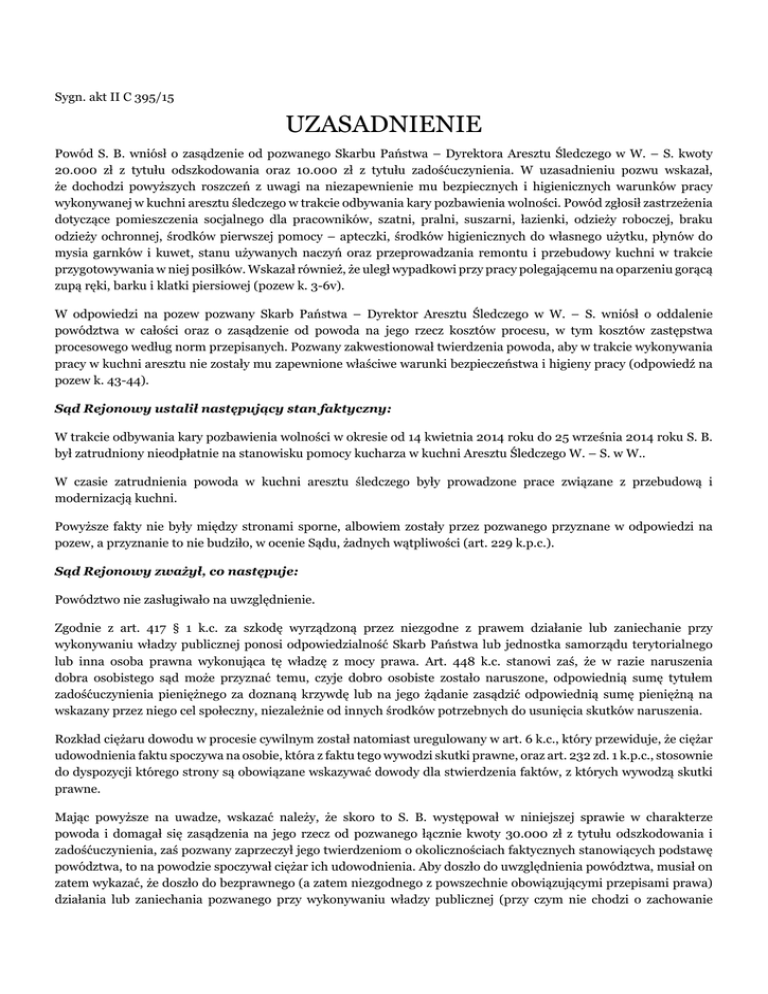 Sygn. akt II C 395/15 UZASADNIENIE Powód S. B. wniósł o zasądzenie od pozwanego Skarbu Państwa – Dyrektora Aresztu Śledczego w W. – S. kwoty 20.000 zł z tytułu odszkodowania oraz 10.000 zł z tytułu zadośćuczynienia. W uzasadnieniu pozwu wskazał, że dochodzi powyższych roszczeń z uwagi na niezapewnienie mu bezpiecznych i higienicznych warunków pracy wykonywanej w kuchni aresztu śledczego w trakcie odbywania kary pozbawienia wolności. Powód zgłosił zastrzeżenia dotyczące pomieszczenia socjalnego dla pracowników, szatni, pralni, suszarni, łazienki, odzieży roboczej, braku odzieży ochronnej, środków pierwszej pomocy – apteczki, środków higienicznych do własnego użytku, płynów do mysia garnków i kuwet, stanu używanych naczyń oraz przeprowadzania remontu i przebudowy kuchni w trakcie przygotowywania w niej posiłków. Wskazał również, że uległ wypadkowi przy pracy polegającemu na oparzeniu gorącą zupą ręki, barku i klatki piersiowej (pozew k. 3-6v). W odpowiedzi na pozew pozwany Skarb Państwa – Dyrektor Aresztu Śledczego w W. – S. wniósł o oddalenie powództwa w całości oraz o zasądzenie od powoda na jego rzecz kosztów procesu, w tym kosztów zastępstwa procesowego według norm przepisanych. Pozwany zakwestionował twierdzenia powoda, aby w trakcie wykonywania pracy w kuchni aresztu nie zostały mu zapewnione właściwe warunki bezpieczeństwa i higieny pracy (odpowiedź na pozew k. 43-44). Sąd Rejonowy ustalił następujący stan faktyczny: W trakcie odbywania kary pozbawienia wolności w okresie od 14 kwietnia 2014 roku do 25 września 2014 roku S. B. był zatrudniony nieodpłatnie na stanowisku pomocy kucharza w kuchni Aresztu Śledczego W. – S. w W.. W czasie zatrudnienia powoda w kuchni aresztu śledczego były prowadzone prace związane z przebudową i modernizacją kuchni. Powyższe fakty nie były między stronami sporne, albowiem zostały przez pozwanego przyznane w odpowiedzi na pozew, a przyznanie to nie budziło, w ocenie Sądu, żadnych wątpliwości (art. 229 k.p.c.). Sąd Rejonowy zważył, co następuje: Powództwo nie zasługiwało na uwzględnienie. Zgodnie z art. 417 § 1 k.c. za szkodę wyrządzoną przez niezgodne z prawem działanie lub zaniechanie przy wykonywaniu władzy publicznej ponosi odpowiedzialność Skarb Państwa lub jednostka samorządu terytorialnego lub inna osoba prawna wykonująca tę władzę z mocy prawa. Art. 448 k.c. stanowi zaś, że w razie naruszenia dobra osobistego sąd może przyznać temu, czyje dobro osobiste zostało naruszone, odpowiednią sumę tytułem zadośćuczynienia pieniężnego za doznaną krzywdę lub na jego żądanie zasądzić odpowiednią sumę pieniężną na wskazany przez niego cel społeczny, niezależnie od innych środków potrzebnych do usunięcia skutków naruszenia. Rozkład ciężaru dowodu w procesie cywilnym został natomiast uregulowany w art. 6 k.c., który przewiduje, że ciężar udowodnienia faktu spoczywa na osobie, która z faktu tego wywodzi skutki prawne, oraz art. 232 zd. 1 k.p.c., stosownie do dyspozycji którego strony są obowiązane wskazywać dowody dla stwierdzenia faktów, z których wywodzą skutki prawne. Mając powyższe na uwadze, wskazać należy, że skoro to S. B. występował w niniejszej sprawie w charakterze powoda i domagał się zasądzenia na jego rzecz od pozwanego łącznie kwoty 30.000 zł z tytułu odszkodowania i zadośćuczynienia, zaś pozwany zaprzeczył jego twierdzeniom o okolicznościach faktycznych stanowiących podstawę powództwa, to na powodzie spoczywał ciężar ich udowodnienia. Aby doszło do uwzględnienia powództwa, musiał on zatem wykazać, że doszło do bezprawnego (a zatem niezgodnego z powszechnie obowiązującymi przepisami prawa) działania lub zaniechania pozwanego przy wykonywaniu władzy publicznej (przy czym nie chodzi o zachowanie konkretnego funkcjonariusza, lecz o niezgodne z prawem działaniem danej struktury organizacyjnej, która wykonuje władzę publiczną), że poniósł szkodę i krzywdę, w jakiej wysokości, oraz że wystąpił między nimi adekwatny związek przyczynowy. Jednakże powód powyższych przesłanek odpowiedzialności pozwanego nie tylko nie wykazał, lecz w ogóle nie złożył ku temu zmierzających wniosków dowodowych. Sporządzone przezeń pisma procesowe z dnia 20 sierpnia 2015 roku (k. 49) oraz z dnia 16 września 2015 roku (k. 54-57v) zawierające wnioski o dopuszczenie dowodów z zeznań świadka W. S. oraz kserokopii książki zdrowia osadzonego zostały bowiem na podstawie art. 130 § 2 k.p.c. zwrócone z uwagi na nieuzupełnienie ich braków formalnych po uprzednim wezwaniu do ich uzupełnienia w trybie § 1 powyższego przepisu (k. 51, 64, 73v). Jedynie ubocznie wskazać należy, że przedmiotowe wnioski zmierzały do wykazania jedynie niektórych okoliczności wskazanych w uzasadnieniu pozwu. Mając na uwadze powyższe, Sąd oddalił powództwo w całości jako nieudowodnione ani co do zasady, ani co do wysokości. O kosztach procesu Sąd orzekł na podstawie art. 98 § 1 k.p.c. w zw. z art. 99 k.p.c., zgodnie z zasadą odpowiedzialności za wynik procesu, i z uwagi na fakt, że powód sprawę niniejszą przegrał, zasądził od niego na rzecz pozwanego kwotę 2.400 zł tytułem zwrotu kosztów zastępstwa procesowego, której wysokość wynika z § 6 pkt 5 rozporządzenia Ministra Sprawiedliwości z dnia 28 września 2002 roku w sprawie opłat za czynności radców prawnych oraz ponoszenia przez Skarb Państwa kosztów pomocy prawnej udzielonej przez radcę prawnego ustanowionego z urzędu (tekst jednolity: Dz. U. z 2013 roku poz. 490 z późn. zm), które zgodnie z dyspozycją przepisu przejściowego § 21 rozporządzenia Ministra Sprawiedliwości z dnia 22 października 2015 roku w sprawie opłat za czynności radców prawnych (Dz.U. poz. 1804) znajduje zastosowanie do spraw wszczętych i niezakończonych przed dniem wejścia w życie nowego 