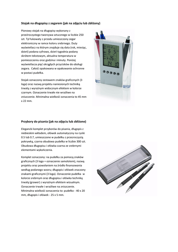 Stojak na długopisy z zegarem (jak na zdjęciu lub zbliżony) Pionowy stojak na długopisy wykonany z przeźroczystego tworzywa sztucznego w liczbie 250 szt. Tył łukowaty z przodu umieszczony zegar elektroniczny w ramce koloru srebrnego. Duży wyświetlacz na którym znajduje się data (rok, miesiąc, dzień) podana cyfrowo, dzień tygodnia podany skrótem tekstowym, aktualna temperatura w pomieszczeniu oraz godzina i minuty. Poniżej wyświetlacza pięć okrągłych przycisków do obsługi zegara. Całość opakowana w opakowanie ochronne w postaci pudełka. Stojak oznaczony zestawem znaków graficznych (3 loga) oraz nazwą projektu naniesionych techniką trwałą z wyraźnym widocznym efektem w kolorze czarnym. Oznaczenie trwałe nie wrażliwe na zniszczenie. Minimalna wielkość oznaczenia to 45 mm x 22 mm. Przybory do pisania (jak na zdjęciu lub zbliżone) Elegancki komplet przyborów do pisania, długopis z niebieskim wkładem, ołówek automatyczny na rysiki 0.5 lub 0.7, umieszczone w pudełku z przezroczystą pokrywką, czarna obudowa pudełka w liczbie 300 szt. Obudowa długopisu i ołówka czarna ze srebrnymi elementami wykończenia. Komplet oznaczony: na pudełku za pomocą znaków graficznych (3 loga + oznaczenie samolotem), nazwą projektu oraz powołaniem na źródło finansowania według podanego wzoru; długopis i ołówek znaczony znakami graficznymi (3 loga). Oznaczenie pudełka w kolorze srebrnym oraz długopisu i ołówka techniką trwałą (grawer) z wyraźnym efektem wizualnym. Oznaczenie trwałe i wrażliwe na zniszczenie. Minimalna wielkość oznaczenia to: pudełko - 40 x 20 mm, długopis i ołówek - 25 x 5 mm. Teczka wielofunkcyjna (jak na zdjęciu lub zbliżona) Teczka wielofunkcyjna w kolorze czarnym o wymiarach 390mm x 290 mm x 60mm wykonana z materiału wodoodpornego w liczbie 250 szt. Zamknięcie głównej przestrzeni na zamek błyskawiczny. Teczka posiada regulowany pasek na ramię oraz uszy do noszenia w dłoni. Frontowa ściana teczki posiada przeszycia białą nicią tworzące małe kieszenie na przybory do pisania oraz notatnik i telefon komórkowy. Teczka oznaczona znakami graficznymi według przesłanego wzoru zawierającego min. 3 znaki graficzne projektu, emblemat samolotu, nazwę projektu oraz odwołanie do źródła finansowania. Oznaczenie powinno być umieszczone w prawym dolnym rogu teczki. Oznaczenie wykonane techniką trwałą z wyraźnym efektem wizualnym w kolorze srebrnym.
