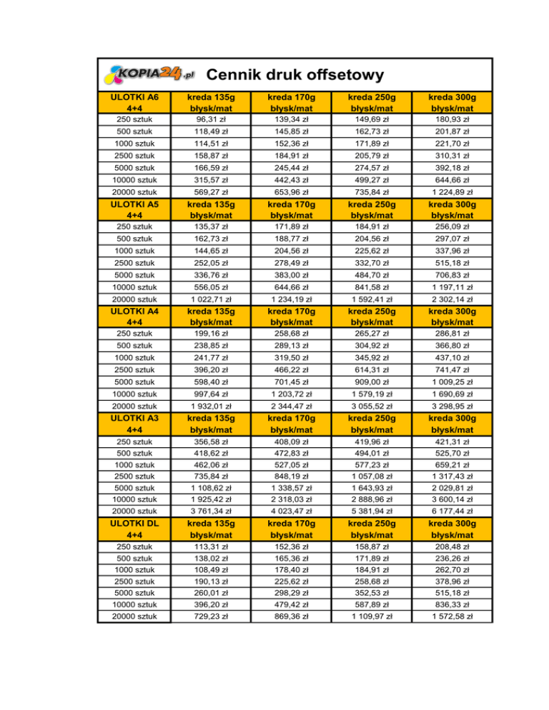 Cennik druk offsetowy ULOTKI A6 4+4 kreda 135g błysk/mat kreda 170g błysk/mat kreda 250g błysk/mat kreda 300g błysk/mat 250 sztuk 96,31 zł 139,34 zł 149,69 zł 180,93 zł 500 sztuk 118,49 zł 145,85 zł 162,73 zł 201,87 zł 1000 sztuk 114,51 zł 152,36 zł 171,89 zł 221,70 zł 2500 sztuk 158,87 zł 184,91 zł 205,79 zł 310,31 zł 5000 sztuk 166,59 zł 245,44 zł 274,57 zł 392,18 zł 10000 sztuk 315,57 zł 442,43 zł 499,27 zł 644,66 zł 20000 sztuk 569,27 zł 653,96 zł 735,84 zł 1 224,89 zł ULOTKI A5 4+4 kreda 135g błysk/mat kreda 170g błysk/mat kreda 250g błysk/mat kreda 300g błysk/mat 250 sztuk 135,37 zł 171,89 zł 184,91 zł 256,09 zł 500 sztuk 162,73 zł 188,77 zł 204,56 zł 297,07 zł 1000 sztuk 144,65 zł 204,56 zł 225,62 zł 337,96 zł 2500 sztuk 252,05 zł 278,49 zł 332,70 zł 515,18 zł 5000 sztuk 336,76 zł 383,00 zł 484,70 zł 706,83 zł 10000 sztuk 556,05 zł 644,66 zł 841,58 zł 1 197,11 zł 20000 sztuk 1 022,71 zł 1 234,19 zł 1 592,41 zł 2 302,14 zł ULOTKI A4 4+4 kreda 135g błysk/mat kreda 170g błysk/mat kreda 250g błysk/mat kreda 300g błysk/mat 250 sztuk 199,16 zł 258,68 zł 265,27 zł 286,81 zł 500 sztuk 238,85 zł 289,13 zł 304,92 zł 366,80 zł 1000 sztuk 241,77 zł 319,50 zł 345,92 zł 437,10 zł 2500 sztuk 396,20 zł 466,22 zł 614,31 zł 741,47 zł 5000 sztuk 598,40 zł 701,45 zł 909,00 zł 1 009,25 zł 10000 sztuk 997,64 zł 1 203,72 zł 1 579,19 zł 1 690,69 zł 20000 sztuk 1 932,01 zł 2 344,47 zł 3 055,52 zł 3 298,95 zł ULOTKI A3 4+4 kreda 135g błysk/mat kreda 170g błysk/mat kreda 250g błysk/mat kreda 300g błysk/mat 250 sztuk 356,58 zł 408,09 zł 419,96 zł 421,31 zł 500 sztuk 418,62 zł 472,83 zł 494,01 zł 525,70 zł 1000 sztuk 462,06 zł 527,05 zł 577,23 zł 659,21 zł 2500 sztuk 735,84 zł 848,19 zł 1 057,08 zł 1 317,43 zł 5000 sztuk 1 108,62 zł 1 338,57 zł 1 643,93 zł 2 029,81 zł 10000 sztuk 1 925,42 zł 2 318,03 zł 2 888,96 zł 3 600,14 zł 20000 sztuk 3 761,34 zł 4 023,47 zł 5 381,94 zł 6 177,44 zł ULOTKI DL 4+4 kreda 135g błysk/mat kreda 170g błysk/mat kreda 250g błysk/mat kreda 300g błysk/mat 250 sztuk 113,31 zł 152,36 zł 158,87 zł 208,48 zł 500 sztuk 138,02 zł 165,36 zł 171,89 zł 236,26 zł 1000 sztuk 108,49 zł 178,40 zł 184,91 zł 262,70 zł 2500 sztuk 190,13 zł 225,62 zł 258,68 zł 378,96 zł 5000 sztuk 260,01 zł 298,29 zł 352,53 zł 515,18 zł 10000 sztuk 396,20 zł 479,42 zł 587,89 zł 836,33 zł 20000 sztuk 729,23 zł 869,36 zł 1 109,97 zł 1 572,58 zł