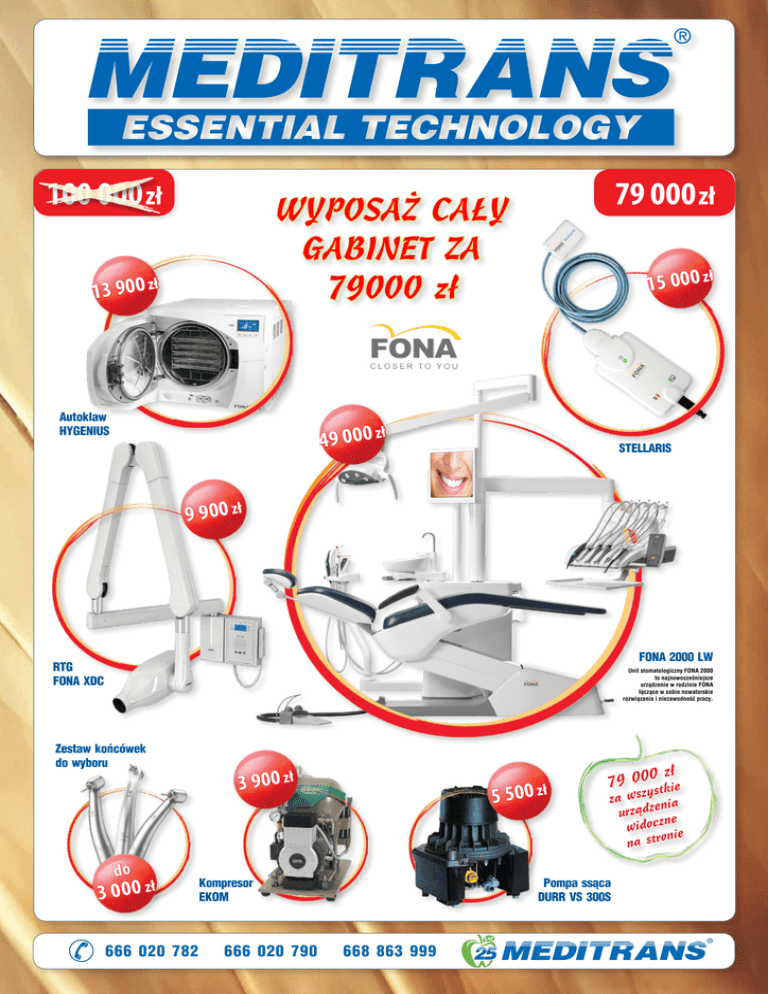 100 000 zł 79 000 zł WYPOSAŻ CAŁY GABINET ZA 79000 zł 1 3 9 0 0 zł Autoklaw HYGENIUS 1 5 0 0 0 zł 4 9 0 0 0 zł STELLARIS 9 9 0 0 zł FONA 2000 LW RTG FONA XDC Unit stomatologiczny FONA 2000 to najnowocześniejsze urządzenie w rodzinie FONA łączące w sobie nowatorskie rozwiązania i niezawodność pracy. Zestaw końcówek do wyboru do 3 0 0 0 zł 666 020 782 3 9 0 0 zł 5 5 0 0 zł Kompresor EKOM 666 020 79031 800 668 863 99944 886 41 34 41 34 0 zł 0 0 9 7 ie szystk za w enia urządz e n widocz e oni na str Pompa ssąca DURR VS 300S LAT NAJEFEKTYWNIEJSZA PANORAMA 2D NA ŚWIECIE FONA ART PLUS RENTGEN PANORAMICZNY FONA ART PLUS REWOLUCYJNA TECHNOLOGIA W RADIOGRAFII PANORAMICZNEJ FONA ART PLUS CEPH - ZAWSZE UDANE ZDJĘCIA - KOMFORTOWE UŻYTKOWANIE - DOSKONAŁA JAKOŚĆ OBRAZU - MINIMALNE WYMAGANIA PRZESTRZENNE - CZUJNIK CdTe-CMOS z bezpośrednią konwersją promieniowania bez warstwy scyntylacyjnej. Opatentowane zastosowanie technologii detektora CdTe powoduje uzyskanie ponad 4200 obrazów o różnej ostrości podczas jednej ekspozycji panoramicznej. Dzięki zastosowaniu narzędzia automatycznej ostrości oprogramowanie automatycznie przechodzi do najbardziej ostrej warstwy, dzięki czemu koryguje obszary z niewyraźnym obrazem bez konieczności wykonania dodatkowych ekspozycji. Technologia ART PLUS Standardowa technologia 2D CdTe-CMOS Sensor CCD/CMOS Sensor Promieniowanie RTG Warstwa CdTe (przemiana bezpośrednia na sygnał elektryczny) Obwód elektryczny od 1780 zł miesięcznie Ostre Zdjęcie Promieniowanie RTG Warstwa scyntylacyjna (konwersja promieni X na światło) Warstwa optyczna (orientuje rozproszone światło) Obwód elektryczny Zdjęcie 99 000 zł od 1930 zł miesięcznie 109 000 zł 25 000 zł Wymienny przewód od 460 zł miesięcznie …zapewnia ciągłość pracy nawet w razie uszkodzenia mechanicznego - tak często eliminującego inne systemy Nr1 wymiana przewodu pozwoli ci na kontynuowanie pracy w ciągu kilku minut. a n samodzielnie. Szybka RTG FONA XDC + STELLARIS Ś w iec Fona XDC to innowacyjny rentgen stomatologiczny spełniający najbardziej rygorystyczne wymagania zarówno czujników cyfrowych jak i błon RTG. Skomputeryzowana jednostka wyposażona w płaską klawiaturę i cyfrowy wyświetlacz, zapewniająca pełną kontrolę nad generowanym promieniowaniem. Z ogniskiem 0,4 x 0,4 mm, czytelnym panelem oraz doskonałą konstrukcją ramion nożycowych tworzy doskonały produkt spozycjonowany w absolutnej czołówce rentgenów punktowych dostępnych na rynku. W zestawie z rewelacyjnym czujnikiem Fona Stellaris. Najnowsza Matryca Schick 2 LAT i e Bardzo łatwa wymiana …z łatwością wykonasz ją ol hn o ia g Tec z dalszej eksploatacji. 666 666 020 020 782 782666 666 020 020 790 790668 668 863 863 999 999 rtg , na co dzien. Który system lepiej sprawdzi się w Twoim gabinecie: sensor wewnątrzustny, czy skaner płytek fosforowych? Procedury lecznicze współcześnie przeprowadzane w gabinetach stomatologicznych wymagają od lekarza dentysty wykonywania badań diagnostycznych, w tym zdjęć RTG. Zdjęcia radiologiczne wykonujemy przed przystąpieniem do leczenia endodontycznego, przygotowując się do ekstrakcji zęba, czy po prostu próbując zlokalizować przyczynę bólu. Zdjęcia punktowe są także wykonywane w trakcie prowadzenia leczenia (weryfikacja cofania się zmian OKW), oraz nierzadko po jego zakończeniu. Zdjęcie zębowe – niezbędne przed i w trakcie leczenia Aby umożliwić pacjentom przeprowadzanie diagnostyki radiologicznej – wewnątrzustnej, nasz gabinet musi być odpowiednio wyposażony. Pierwszym urządzeniem koniecznym do posiadania jest punktowy aparat RTG. Aparat RTG emituje promieniowanie prześwietlające wybrane przez nas struktury anatomiczne jamy ustnej pacjenta. Z kolei elementem przechwytującym w systemie cyfrowej radiologii może być sensor wewnątrzustny, bądź płytka fosforowa. Sensor wewnątrzustny – dla kogo? W przypadku pierwszego rozwiązania przykładem może być nowoczesny i niezwykle ergonomiczny sensor wewnątrzustny Gendex GXS-700. Kształt zbliżony do kropli wody umożliwia jego łatwe pozycjonowanie w jamie ustnej, a jakość zdjęć dzięki niemu pozyskiwanych jest bezkonkurencyjna. Pozwala ona z łatwością dostrzec ubeleczkowanie kości. Kontrola zmian OKW cofających się po prawidłowo przeprowadzonym leczeniu endodontycznym nie nastręcza dzięki temu żadnych problemów. Wyraźnie widać tu zarys ozębnej, a także światło nawet bardzo wąskich kanałów korzeniowych. Rozdzielczość rzeczywista wspomnianego sensora to aż 22 pl/mm co bezpośrednio przekłada się na jakość pozyskiwanych obrazów. Do wyboru mamy dwie różne wielkości czujnika. Pozwala to na jego odpowiedni dobór w zależności od rodzaju zdjęć najczęściej wykonywanych w gabinecie. Można też się zaopatrzyć w oba warianty i tym samym osiągnąć pełnię uniwersalności tego systemu. Dużą jego zaletą jest fakt, że zdjęcie RTG pojawia się na ekranie komputera w chwili wykonania ekspozycji aparatem RTG. Jest to możliwe dzięki bezpośredniemu podłączeniu sensora za pomocą kabla USB do komputera. W związku z tym najwygodniej jest, gdy czujnik wewnątrzustny pracuje na stałe w danym pomieszczeniu. Jego przenoszenie wiąże się z przepinaniem pomiędzy poszczególnymi komputerami, a to na dłuższą metę może okazać się uciążliwe. Oczywiście przy pomocy sensora wewnątrzustnego badanie może być przeprowadzone zgodnie z zasadą izometrii Cieszyńskiego, bądź z wykorzystaniem zestawu pozycjonerów w technice kąta prostego. Skaner płytek – idealny do klinik wielofotelowych Doskonałym rozwiązaniem dla gabinetów korzystających dotychczas z analogowych systemów radiologii wewnątrzustnej (aparat punktowy RTG + klisze oraz mokry system wywoływania zdjęć) jest skaner płytek fosforowych. Jako przykład może posłużyć urządzenie Gendex GXPS-500. Jest ono wyposażone w zestaw płytek fosfor