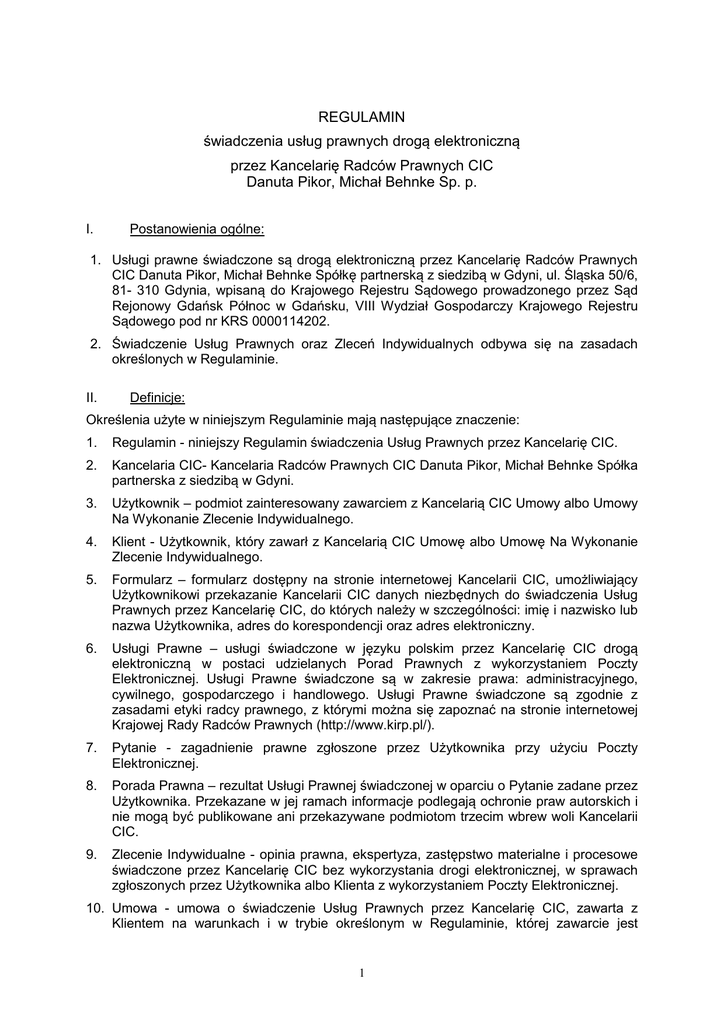 REGULAMIN świadczenia usług prawnych drogą elektroniczną przez Kancelarię Radców Prawnych CIC Danuta Pikor, Michał Behnke Sp. p. I. Postanowienia ogólne: 1. Usługi prawne świadczone są drogą elektroniczną przez Kancelarię Radców Prawnych CIC Danuta Pikor, Michał Behnke Spółkę partnerską z siedzibą w Gdyni, ul. Śląska 50/6, 81- 310 Gdynia, wpisaną do Krajowego Rejestru Sądowego prowadzonego przez Sąd Rejonowy Gdańsk Północ w Gdańsku, VIII Wydział Gospodarczy Krajowego Rejestru Sądowego pod nr KRS 0000114202. 2. Świadczenie Usług Prawnych oraz Zleceń Indywidualnych odbywa się na zasadach określonych w Regulaminie. II. Definicje: Określenia użyte w niniejszym Regulaminie mają następujące znaczenie: 1. Regulamin - niniejszy Regulamin świadczenia Usług Prawnych przez Kancelarię CIC. 2. Kancelaria CIC- Kancelaria Radców Prawnych CIC Danuta Pikor, Michał Behnke Spółka partnerska z siedzibą w Gdyni. 3. Użytkownik – podmiot zainteresowany zawarciem z Kancelarią CIC Umowy albo Umowy Na Wykonanie Zlecenie Indywidualnego. 4. Klient - Użytkownik, który zawarł z Kancelarią CIC Umowę albo Umowę Na Wykonanie Zlecenie Indywidualnego. 5. Formularz – formularz dostępny na stronie internetowej Kancelarii CIC, umożliwiający Użytkownikowi przekazanie Kancelarii CIC danych niezbędnych do świadczenia Usług Prawnych przez Kancelarię CIC, do których należy w szczególności: imię i nazwisko lub nazwa Użytkownika, adres do korespondencji oraz adres elektroniczny. 6. Usługi Prawne – usługi świadczone w języku polskim przez Kancelarię CIC drogą elektroniczną w postaci udzielanych Porad Prawnych z wykorzystaniem Poczty Elektronicznej. Usługi Prawne świadczone są w zakresie prawa: administracyjnego, cywilnego, gospodarczego i handlowego. Usługi Prawne świadczone są zgodnie z zasadami etyki radcy prawnego, z którymi można się zapoznać na stronie internetowej Krajowej Rady Radców Prawnych (http://www.kirp.pl/). 7. Pytanie - zagadnienie prawne zgłoszone przez Użytkownika przy użyciu Poczty Elektronicznej. 8. Porada Prawna – rezultat Usługi Prawnej świadczonej w oparciu o Pytanie zadane przez Użytkownika. Przekazane w jej ramach informacje podlegają ochronie praw autorskich i nie mogą być publikowane ani przekazywane podmiotom trzecim wbrew woli Kancelarii CIC. 9. Zlecenie Indywidualne - opinia prawna, ekspertyza, zastępstwo materialne i procesowe świadczone przez Kancelarię CIC bez wykorzystania drogi elektronicznej, w sprawach zgłoszonych przez Użytkownika albo Klienta z wykorzystaniem Poczty Elektronicznej. 10. Umowa - umowa o świadczenie Usług Prawnych przez Kancelarię CIC, zawarta z Klientem na warunkach i w trybie określonym w Regulaminie, której zawarcie jest 1 równoważne z uzyskaniem przez Użytkownika indywidualnego upoważnienia do dostępu do Usług Prawnych świadczonych przez Kancelarię CIC. 11. Umowa Na Wykonanie Zlecenie Indywidualnego – umowa, której przedmiot odpowiada zakresowi Zlecenia Indywidualnego. 12. Baza Danych Użytkowników - zbiór danych dotyczących Użytkowników. 13. Baza Danych - zbiór Pytań oraz Porad Prawnych stanowiący własność Kancelarii CIC. 14. Informacje Poufne - informacje z Bazy Danych Użytkowników oraz z Bazy Danych. 15. Poczta Elektroniczna – adres poczty elektonicznej [email protected] . 16. Dni Robocze - dni od poniedziałku do piątku z wyłączeniem dni ustawowo wolnych od pracy. III. Korzystanie z Usług Prawnych 1. Z Usług Prawnych może korzystać Użytkownik, który zgodnie z Regulaminem zawarł Umowę z Kancelarią CIC. 2. Umowa zostaje zawarta po wyczerpaniu następującej procedury: a) Użytkownik zadaje Pytanie dotyczące możliwości udzielenia Porady Prawnej poprzez prawidłowe wypełnienie całości Formularza; b) Kancelaria CIC, po uzyskaniu Pytania oraz ewentualnych informacji uzupełniających, przesyła wycenę udzielenia Porady Prawnej albo proponuje udzielenie odpowiedzi na Pytanie Użytkownika w formie Zlecenia Indywidualnego. Oferta złożona przez Kancelarię CIC przestaje wiązać Kancelarię CIC po upływie 3 Dni Roboczych; c) Użytkownik akceptuje ofertę złożoną przez Kancelarię CIC poprzez udzielenie w formie elektronicznej jednoznacznej pozytywnej odpowiedzi na uzyskaną ofertę oraz uiszczenie opłaty za Poradę Prawną. Wprowadzenie jakichkolwiek zmian w treści oferty złożonej przez Kancelarię CIC poczytuje się odmowę jej przyjęcia. 3. Umowa zostaje zawarta w momencie przekazania Użytkownikowi przez Kancelarię CIC potwierdzenia otrzymania przez Kancelarię CIC oświadczenia Użytkownika o zaakceptowaniu oferty złożonej przez Kancelarię CIC, jednakże nie wcześniej niż w momencie uznania rachunku bankowego Kancelarii CIC całością opłaty za Usługę Prawną. 4. W przypadku niewyczerpania procedury opisanej w ust. 2, a w szczególności nieudzielenia jednoznacznej pozytywnej odpowiedzi, nieuiszczenia opłaty za Poradę Prawną albo uzyskania przez Użytkownika oferty wykonania Zlecenia Indywidualnego umowa nie zostaje zawarta. 5. Uiszczenie opłaty, od którego uzależnione jest zawarcie Umowy winno nastąpić przelewem bankowym na rachunek bankowy Kancelarii CIC przesłany Użytkownikowi wraz z wyceną wykonania zlecanej usługi. 6. Użytkownika obowiązuje zakaz dostarczania treści o charakterze bezprawnym, zgodnie z art. 8 ust. 3 pkt 2b ustawy z dnia 18 lipca 2002 r. o świadczeniu usług drogą elektroniczną (Dz. U. 2002.144.1204 z późn. zm.). 7. Zawierając Umowę Użytkownik potwierdza, że zapoznał się z Regulaminem oraz, że akceptuje postanowienia w nim zawarte. 8. Użytkownik wyraża zgodę na rozpoczęcie świadczenia Usług przed upływem dziesięciodniowego terminu od zawarcia Umowy. Użytkownikowi nie przysługuje prawo 2 do odstąpienia od Umowy na podstawie art. 10 ustawy z dnia 2 marca 2000 r. o ochronie niektórych praw konsumentów oaz o odpowiedzialności za szkodę wyrząd