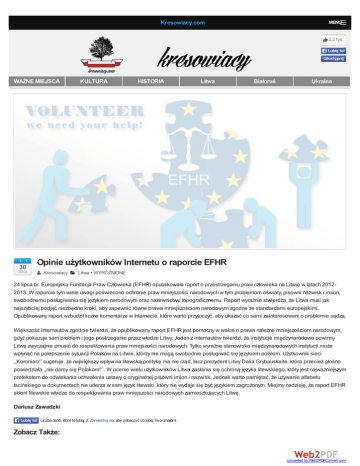 Kresowiacy.com MENU 2,2 tys. Lubię to! Udostępnij WAŻNE MIEJSCA L I P 30 2014 KULTURA HISTORIA Litwa Białoruś Ukraina Opinie użytkowników Internetu o raporcie EFHR Kresowiacy Litwa • WYRÓŻNIONE 24 lipca br. Europejska Fundacja Praw Człowieka (EFHR) opublikowała raport o przestrzeganiu praw człowieka na Litwie w latach 20122013. W raporcie tym wiele uwagi poświecono ochronie praw mniejszości narodowych w tym problemom oświaty, pisowni nazwisk i imion, swobodnemu posługiwaniu się językiem narodowym oraz nazewnictwu topograficznemu. Raport wyraźnie stwierdza, że Litwa musi jak najszybciej podjąć niezbędne kroki, aby zapewnić równe prawa mniejszościom narodowym zgodne ze standardami europejskimi. Opublikowany raport wzbudził liczne komentarze w Internecie, które warto przytoczyć, aby ukazać co sami zainteresowani o problemie sądzą. Większość internautów zgodnie twierdzi, że opublikowany raport EFHR jest pomocny w walce o prawa należne mniejszościom narodowym, gdyż pokazuje sam problem i jego postrzeganie przez władze Litwy. Jeden z internautów twierdzi, że instytucje międzynarodowe powinny Litwę zwyczajnie zmusić do respektowania praw mniejszości narodowych. Tylko wyraźne stanowisko międzynarodowych instytucji może wpłynąć na polepszenie sytuacji Polaków na Litwie, którzy nie mogą swobodnie posługiwać się językiem polskim. Użytkownik sieci ,,Koroniarz’’ sugeruje, że największy wpływ na litewską politykę ma nie rząd, lecz prezydent Litwy Dalia Grybauskaite, która przecież głośno powiedziała ,,nie damy się Polakom!’’. W ocenie wielu użytkowników Litwa zasłania się ochroną języka litewskiego, który jest najważniejszym pretekstem do odwlekania uchwalenia ustawy o oryginalnej pisowni imion i nazwisk. Jednak warto pamiętać, że używanie alfabetu łacińskiego w dokumentach nie uderza w sam język litewski, który nie wydaje się być językiem zagrożonym. Miejmy nadzieję, że raport EFHR skłoni litewskie władze do respektowania praw mniejszości narodowych zamieszkujących Litwę. Dariusz Zawadzki Lubię to! Liczba osób, które to lubią: 3. Zarejestruj się, aby zobaczyć co lubią Twoi znajomi. Zobacz Także: converted by Web2PDFConvert.com Kościół św. Jutro Litwa Krzyża i klasztor wybierze Bonifratrów w prezydenta Wilnie – miejsce o bogatej historii Pałac Hasbacha w Białymstoku Kościół św. Anny w Wilnie – niepowtarzalne arcydzieło Świat Internetu komentuje Litwę TK: zapisy o billingach i podsłuchach – częściowo niekonstytucyjne Dodaj komentarz... Skomentuj, korzystając z... Wtyczka społecznościowa Facebooka Wyszukaj Kampania wrześniowa Bitwa pod Kałuszynem – pyrrusowe zwycięstwo Eskadra Kościuszkowska, czyli amerykańscy lotnicy w polskim wojsku 7 września 1939 skapitulowało Westerplatte Statystyka sił niemieckich w kampanii wrześniowej Mit PRL o bohaterskiej obronie Wizny w 1939r. Bitwa pod Wizną – polskie Termopile converted by Web2PDFConvert.com Zbrodnia wołyńska Protokół rozprawy sądowej sprawców rzezi ludności polskiej na Wołyniu z 1951 r. W dniach 27-28 września 1951r. odbyła się rozprawa sądowa przed Wojskowym Trybunałem Przykarpackiego Okręgu Wojsk w Łucku. Była to szczególna rozprawa sądowa, ponieważ sądzono na niej sprawców ludobójstwa ludności polskiej na Wołyniu. Nie byli to jednak znaczący przywódcy UPA, lecz … read more Zbrodnia wołyńska w świetle zeznań dowódcy czoty w UPA z 1944 r. Po zakończeniu II wojny światowej na terenach ZSRR przystąpiono do walki z Ukraińską Powstańczą Armią jako elementem wrogim wobec władzy sowieckiej na terenie Ukrainy. Dzięki temu wielu zbrodniarzy wojennych stanęło przed sowieckim wymiarem sprawiedliwości. W publikacji Instytutu Pamięci Narodowej ,,Polska … czytaj więcej Dziś jest: 10 września 2014r. 10 września 9 września 8 września 7 września 6 września Radiowa Odyseja Kresowa Odyseja w Nysie Józefa Szczelina Teresa Sajan Święte miejsca na Kresach „Święte Miejsca na Kresach… nie tylko dla Polaków” – Antoni Soduła [odcinek 38] converted by Web2PDFConvert.com „Święte Miejsca na Kresach… nie tylko dla Polaków” – Antoni Soduła [odcinek 37] Znajdź nas na Facebooku Kresowiacy Lubię to! 2 265 kresowiacy.com portal informujący o ważnych wydarzeniach z życia Polaków i Polonii, wspierający ich w walce o utrzymanie polskości na obczyźnie Uczelnie odpowiadają Akademia Muzyczna im. Grażyny i Kiejstuta Bacewiczów w Łodzi odpowiada na pytania Uniwersytet Rzeszowski PWSZ Suwałki Akademia Sztuk Pięknych w Krakowie Uniwersytet Ekonomiczny w Katowicach Najnowsze Archiwum Henryk Rzewuski - nieoceniony gawędziarz Tadeusz Mirowski, ps. Oracz Kanały w Powstaniu Warszawskim - koszmarna droga do wolności 10 września 9 września Co się stało ze skarbem Funduszu Obrony Narodowej ? Naumowicze - miejsce kaźni na Grodzieńszczyźnie Bitwa pod Kałuszynem – pyrrusowe zwycięstwo Protokół rozprawy sądowej sprawców rzezi ludności polskiej na Wołyniu z 1951 r. Dzień Dobry Bieszczady! Kolejny gatunek z atlasu bieszczadzkich ptaków - dzięcioł duży, osobnik młodociany © 2014 Kresowiacy.com Xin Magazine Theme converted by Web2PDFConvert.com