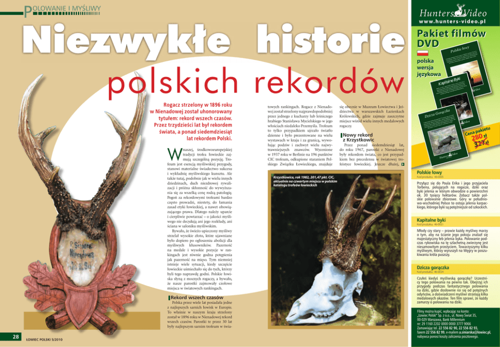 P OLOWANIE I MYŚLIWY Niezwykłe historie w w w. h u n t e r s - v i d e o. p l Pakiet filmów DVD ie łow Polsk y w w pise prezenta owa zgo i. liczne, , wynajm ażona i środkam rodzaj nie pub e wyr daż arza zostani prawnymrzeżone odtw nie, odsprze ymi ile nie zast powiela ronione o owane różn ie prawa jest zab egzekw ® Wszytk być mogą Video A/S Ls Hunters PA version yki ŁOWIEC POLSKI 5/2010 alne B 28 się obecnie w Muzeum Łowiectwa i Jeździectwa w warszawskich Łazienkach yki Królewskich, gdzie zajmuje zaszczytne alne B Kapit miejsce wśród wielu innych medalowych rogaczy. ta Kapi Kapit Polska przez wiele lat posiadała jedne z najlepszych sarnich łowisk w Europie. To właśnie w naszym kraju strzelony został w 1896 roku w Nienadowej rekord wszech czasów. Parostki te przez 30 lat były najlepszym sarnim trofeum w świa- ie nsorzy : Polsk ński, n, spo Tytuł hiszpa bór sce yjski, era: wy i, ros Zawi rski i, fińsk węgie n. i: polsk , turecki, 49 mi Język ski Czas: i, cze -10 włosk 1006 t. nr: DVD5 Ar at: Form 4:3 razu: at ob Form All 6 rup 632 Møld · DK-9 deo.com jen 70 huntersvi om Herredsve info@ deo.c Email: .huntersvi www a Dzicz czka Gorą Węgry zyli na Na wyrusmarzenia.dnych z ania e je którzy polow ych, ełnić sw rożach, y tego cznego po myśliw aby sp ych po . estnic , grupieg Travels o potężn gramów y ? Ucz zas fantasty odyńców n prywat rączkę zyszym Huntin na byki 20 kilo dc ych bom eo A/S. nie oso Vid Towar ą Diana eźć moż nawet do ską go zygody po od potężn okazów. Te wyłącz w Hunters mi i jestyśliw wane h pr m wcó się h z firmrzech znal ażących yc i autorski owych, sprzeda sprzeda yś ic ro i. ami dom ow być ed e yj e ik al praw ki ach niu jrz wanych niona łe D moż Węg pszych, w ska Obe słowni kilka med aniu na dz To DV z autoryzo jest chro zu o wśwarunkuzyk. C do prze dy inny e nia tylk ącznie po ta jle nika w zi Każ nym arza noś na noch. nadawanie, wył wrski artość polo liwe i, gd do odtw zelają zN owy rekord z Krzystkowic ączka a Gor z Rekord wszech czasów Krzystkowice, rok 1982, 201,47 pkt. CIC, aktualnie na czwartym miejscu w polskim katalogu trofeów łowieckich yki lne B ych na y na polując hni ok. m, ab rbena, w ierzc zy o ty nia byka. iela To zie o pow we. Góry y mar zyjac le ro od o jego pr nym obw anie zbio o, któreg myśliw czny łeb je rzynę jest ika i leś low ie każdy taty órzy ackieg rp Polsk się do Poula Erki jelenia wże polskie poen ka prawie ł się majes lachetną zw liwym, kt ia prywat . ry – A/S z sta osobomVideo myś alaz a na tą sz az by bacz tak ostoja jel y u zn cz ącznie y. lk ters jest ju wył i ki Przyłące, dziki or cz Hun dy y ko wane wcówłoautorskimi owych, e, to ów. Zo a pusz kowisk sprzeda sprzeda M szym go po ami ach dom e być rogacz cy hektar dniej Polsc ich. wanych niona prawwaria unk niuzyeskajeniu podczas ry . Towarzy iwaniu król D moż ho się To DV z autoryzo jest chro tylko wśc inny ienie, prze nie po Każdy nia szkock nika ciem 30 ty iowo-wsc anawa szuk nym w ży od po ść noś odtwarza liwe wyłącz rskich. lo ze arto ze w do nad pr Po Zaw ry czona nie,m jest moż praw auto eriału, hnia połudn potężniejs przezna arzanie iadacza na nim mat owszec owityanie zyli na Węg pos odtw go są tuny rozpam redagow zakazy inne zgody zawarte ni, es Te us byki , zwias cji mnej klubach nie oraz da.yr łowy y ie łow Dzicz W naszej, środkowoeuropejskiej tradycji trofea łowieckie zajmują szczególną pozycję. Trofeum jest esencją myśliwskiej przygody, stanowi materialne świadectwo sukcesu i wykładnię myśliwskiego kunsztu. Ale także tutaj, podobnie jak w wielu innych dziedzinach, duch niezdrowej rywalizacji i próżna skłonność do wywyższania się za wszelką cenę rodzą patologię. Pogoń za rekordowymi trofeami bardzo często prowadzi, niestety, do łamania zasad etyki łowieckiej, a nawet obowiązującego prawa. Dlatego należy uparcie i cierpliwie powtarzać – o jakości myśliwego nie decydują ani jego rozkłady, ani ściana w saloniku myśliwskim. Bywało, że świeżo upieczony myśliwy strzelał wysokie złoto, które ujawniane było dopiero po ogłoszeniu abolicji dla myśliwych kłusowników. Pazerność na medale i wysokie pozycje w rankingach jest równie godna potępienia jak pazerność na mięso. Tym niemniej istnieje wiele sytuacji, kiedy szczęście łowieckie uśmiechało się do tych, którzy byli tego naprawdę godni. Polskie łowiska słyną z mocnych rogaczy, a bywało, że nasze parostki zajmowały czołowe miejsca w światowych rankingach. towych rankingach. Rogacz z Nienadowej został strzelony najprawdopodobniej przez jednego z kucharzy lub leśniczego hrabiego Stanisława Mycielskiego w jego włościach niedaleko Przemyśla. Trofeum to tylko przypadkiem ujrzało światło dzienne i było prezentowane na wielu wystawach w kraju i za granicą, wywołując podziw i zachwyt wielu najwytrawniejszych znawców. Wycenione w 1937 roku w Berlinie na 196 punktów CIC trofeum, odkupione staraniem Polskiego Związku Łowieckiego, znajduje a Eriy Poul kamer zymie byki ktyw br jącego na ol z obie poprze podchodu emocjonu iki. ów w się do rny i dz anie z ch ło polski cz polow e. Przyłącz niele, sa akuj ba Zasm sena. Zo a i rogacz jelenie, da ni ad ka M kiego jele rowego na io karpac wania zb polo polska wersja językowa polskich rekordów Rogacz strzelony w 1896 roku w Nienadowej został uhonorowany tytułem: rekord wszech czasów. Przez trzydzieści lat był rekordem świata, a ponad siedemdziesiąt lat rekordem Polski. y ie łow Polsk Przez ponad siedemdziesiąt lat, czka a Gorą do roku 1967, parostki z Nienadowej Dzicz były rekordem świata, co jest przypadkiem bez precedensu w światowej trofeistyce łowieckiej. Jeszcze dłużej, : Sten Photo o dzik na pe i str marzy ia na yśliw lowan iadczeni m że każdy za i, a dośw lm spraw fi Zaw czona nie, jest moż praw auto eriału, przezna arzanie iadacza na nim mat owszechnia 