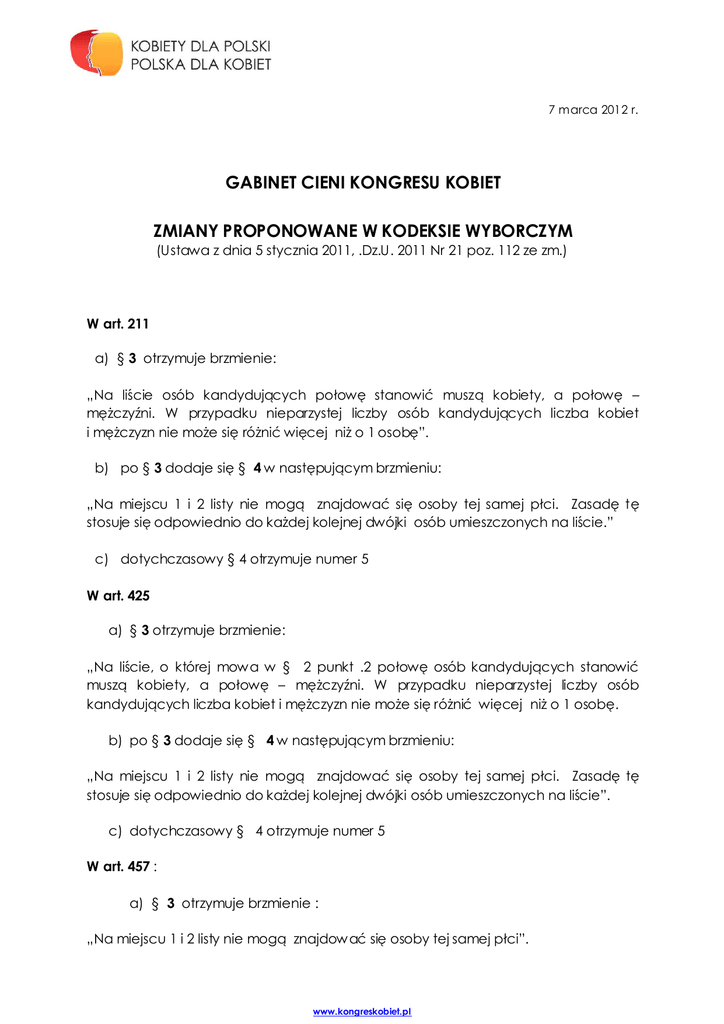 7 marca 2012 r. GABINET CIENI KONGRESU KOBIET ZMIANY PROPONOWANE W KODEKSIE WYBORCZYM (Ustawa z dnia 5 stycznia 2011, .Dz.U. 2011 Nr 21 poz. 112 ze zm.) W art. 211 a) § 3 otrzymuje brzmienie: „Na liście osób kandydujących połowę stanowić muszą kobiety, a połowę – mężczyźni. W przypadku nieparzystej liczby osób kandydujących liczba kobiet i mężczyzn nie może się różnić więcej niż o 1 osobę”. b) po § 3 dodaje się § 4 w następującym brzmieniu: „Na miejscu 1 i 2 listy nie mogą znajdować się osoby tej samej płci. Zasadę tę stosuje się odpowiednio do każdej kolejnej dwójki osób umieszczonych na liście.” c) dotychczasowy § 4 otrzymuje numer 5 W art. 425 a) § 3 otrzymuje brzmienie: „Na liście, o której mow a w § 2 punkt .2 połowę osób kandydujących stanowić muszą kobiety, a połowę – mężczyźni. W przypadku nieparzystej liczby osób kandydujących liczba kobiet i mężczyzn nie może się różnić więcej niż o 1 osobę. b) po § 3 dodaje się § 4 w następującym brzmieniu: „Na miejscu 1 i 2 listy nie mogą znajdować się osoby tej samej płci. Zasadę tę stosuje się odpowiednio do każdej kolejnej dwójki osób umieszczonych na liście”. c) dotychczasowy § 4 otrzymuje numer 5 W art. 457 : a) § 3 otrzymuje brzmienie : „Na miejscu 1 i 2 listy nie mogą znajdow ać się osoby tej samej płci”. www.kongreskobiet.pl b) dotychczasowy § 3 otrzymuje numer 4 UWAGA: Zmiana terminologii jest celowa. Zastosowano formę bezosobową (osoba kandydująca), gdyż używ anie wyrazu kandydat w stosunku do kobiet jest nieuzasadnione w sytuacji gdy w języku polskim w ystępuje żeńska odmiana tego wyrazu – kandydatka. Proponuje się ujednolicenie terminologii w całym akcie praw nym w g przedstawionej propozycji. UZASADNIENIE Konstytucja Rzeczypospolitej Polskiej w art. 33 ustanaw ia zasadę rów ności mężczyzn i kobiet we wszystkich dziedzinach życia, a także prawo kobiet do równego z mężczyznami zajmow ania stanowisk, pełnienia funkcji oraz uzyskiwania godności publicznych. Do stanowisk takich należą stanowiska mandatariuszy narodu i w spólnot terytorialnych w organach władzy publicznej tj. w Sejmie, w Senacie, w radach gmin, miast, pow iatów , w sejmikach w ojewództw a także w Parlamencie Europejskim. Mimo że kobiety stanowią trwałą większość zarówno wśród ogółu obyw ateli Rzeczypospolitej Polskiej, jak i, z reguły, poszczególnych wspólnot terytorialnych, ich udział w składzie pochodzących z w yborów powszechnych organów władzy publicznej jest zdecydowanie mniejszościowy. Pierwsza zmiana praw a wyborczego, która miała na celu realizację i rozw inięcie postanowienia art. 33 Konstytucji RP, dokonana przez ustawę z dnia 5 stycznia 2011 wprowadziła 35 % kwoty dla obu płci na listach wyborczych. Doświadczenie pierwszych wyborów parlamentarnych po wprowadzeniu 35% kwot kobiet i mężczyzn na listach w yborczych wskazuje, że doprowadziło to do znacznego zw iększenia obecności kobiet na tych listach. Ogółem, w wyborach parlamentarnych z 2007 roku kobiety na listach osób kandydujących stanowiły 21%, a w wyborach w 2011 roku kobiety stanowiły na listach ogółem 44%. Odsetek, jaki stanowiły kobiety umieszczone na listach wyborczych w zrósł w ięc ponad dwukrotnie. Wbrew obawom wyrażanym podczas debat, także prowadzonych w Sejmie przez posłanki i posłów poprzedniej kadencji, że kobiety niechętnie kandydują do organów władzy, okazało się, że żadna partia nie miała kłopotu ze znalezieniem odpowiedniej liczby kompetentnych kandydatek do Sejmu. W konsekwencji wszystkie partie z naddatkiem w ypełniły ustawowy wymóg (35%). Fakt ten stanowi poważny argument przemaw iający za pow rotem do projektu zgłaszanego przez komitet obywatelski, a w ięc do wprow adzenia parytetu płci, przewidującego rów ny udział kandydatek i kandydatów na listach wyborczych. www.kongreskobiet.pl Wprowadzenie parytetów z pewnością przyspieszy proces zwiększania liczby kobiet na listach wyborczych. Po w prowadzeniu systemu kwotowego w yraźnie w zrósł nie tylko udział kobiet wśród osób kandydujących, ale też i odsetek w yborców głosujących na kobiety. Odsetek wyborców głosujących na kobiety wzrósł z 19% ( 2007 rok) do 29% (2011 rok), a więc o 10%. (M. Fuszara: Kobiety w wyborach parlamentarnych. I SP Warszaw a 2012, raport niepublikowany). Pomimo jednak tego, że zmiana praw a przyczyniła się bez w ątpienia do podniesienia stopnia świadomości społecznej co do potrzeby zw iększenia udziału kobiet we władzach publicznych, wzrost ilości kobiet kandydujących oraz osób głosujących na kobiety nie przekładał się wprost w wyborach 2011 r. na ilość kobiet wybranych, przede wszystkim ze względu na niekorzystny dla kobiet sposób układania list wyborczych. Wprowadzenie 35% kwoty doprowadziło wprawdzie do najw yższego w historii Polski udziału kobiet w Sejmie (24%), ale nadal jest to udział dalece odbiegający od zasady rów nej reprezentacji pod w zględem płci. Zadecydował o tym sposób konstruow ania przez partie polityczne list wyborczych, wyraźnie faworyzujący mężczyzn. Wzrost liczby kobiet kandydatek na listach wyborczych dał się obserwować przede wszystkim na miejscach nie dających praktycznie szans na wybór. Średnie miejsca, jakie zajmow ały kobiety kandydatki na listach były nawet w 2007 roku nieco bliższe początku listy (11,3) niż w 2011 roku (12,5). (M. Fuszara Kobiety w wyborach parlamentarnych. I SP Warszawa 2012, raport niepublikowany). Z tego względu w projekcie proponuje się zarówno powrót do 50% parytetu kobiet i mężczyzn na listach w yborczych jak i wprowadzenie zasady, że w każdej dwójce osób kandydujących na listach powinna być zarówno kobieta jak i mężczyzna. W w ielu partiach, w prowadzających niewielką liczbę osób do Sejmu kluczowe znaczenie ma pierwsze miejsce na lisie. Spraw iedliwa była