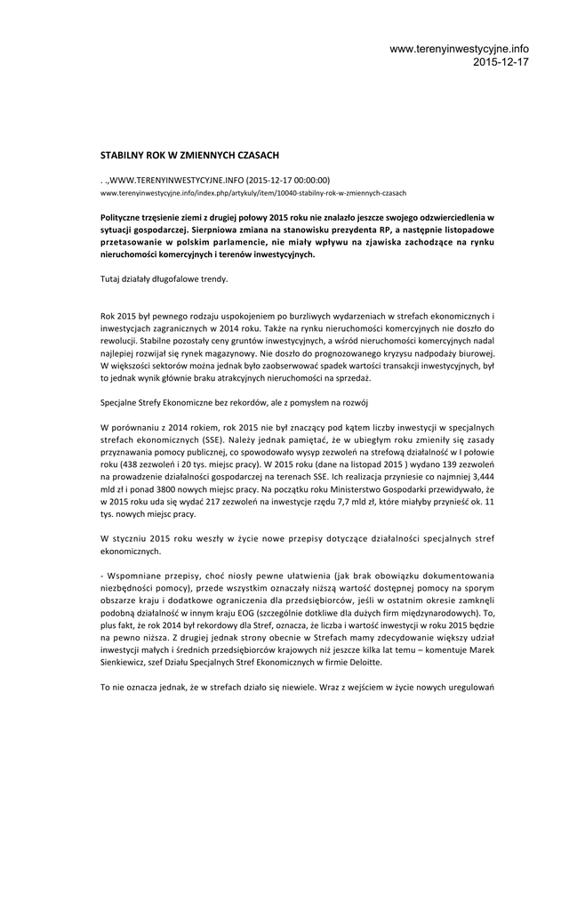 www.terenyinwestycyjne.info 2015-12-17 STABILNY ROK W ZMIENNYCH CZASACH . .,WWW.TERENYINWESTYCYJNE.INFO (2015-12-17 00:00:00) www.terenyinwestycyjne.info/index.php/artykuly/item/10040-stabilny-rok-w-zmiennych-czasach Polityczne trzęsienie ziemi z drugiej połowy 2015 roku nie znalazło jeszcze swojego odzwierciedlenia w sytuacji gospodarczej. Sierpniowa zmiana na stanowisku prezydenta RP, a następnie listopadowe przetasowanie w polskim parlamencie, nie miały wpływu na zjawiska zachodzące na rynku nieruchomości komercyjnych i terenów inwestycyjnych. Tutaj działały długofalowe trendy. Rok 2015 był pewnego rodzaju uspokojeniem po burzliwych wydarzeniach w strefach ekonomicznych i inwestycjach zagranicznych w 2014 roku. Także na rynku nieruchomości komercyjnych nie doszło do rewolucji. Stabilne pozostały ceny gruntów inwestycyjnych, a wśród nieruchomości komercyjnych nadal najlepiej rozwijał się rynek magazynowy. Nie doszło do prognozowanego kryzysu nadpodaży biurowej. W większości sektorów można jednak było zaobserwować spadek wartości transakcji inwestycyjnych, był to jednak wynik głównie braku atrakcyjnych nieruchomości na sprzedaż. Specjalne Strefy Ekonomiczne bez rekordów, ale z pomysłem na rozwój W porównaniu z 2014 rokiem, rok 2015 nie był znaczący pod kątem liczby inwestycji w specjalnych strefach ekonomicznych (SSE). Należy jednak pamiętać, że w ubiegłym roku zmieniły się zasady przyznawania pomocy publicznej, co spowodowało wysyp zezwoleń na strefową działalność w I połowie roku (438 zezwoleń i 20 tys. miejsc pracy). W 2015 roku (dane na listopad 2015 ) wydano 139 zezwoleń na prowadzenie działalności gospodarczej na terenach SSE. Ich realizacja przyniesie co najmniej 3,444 mld zł i ponad 3800 nowych miejsc pracy. Na początku roku Ministerstwo Gospodarki przewidywało, że w 2015 roku uda się wydać 217 zezwoleń na inwestycje rzędu 7,7 mld zł, które miałyby przynieść ok. 11 tys. nowych miejsc pracy. W styczniu 2015 roku weszły w życie nowe przepisy dotyczące działalności specjalnych stref ekonomicznych. - Wspomniane przepisy, choć niosły pewne ułatwienia (jak brak obowiązku dokumentowania niezbędności pomocy), przede wszystkim oznaczały niższą wartość dostępnej pomocy na sporym obszarze kraju i dodatkowe ograniczenia dla przedsiębiorców, jeśli w ostatnim okresie zamknęli podobną działalność w innym kraju EOG (szczególnie dotkliwe dla dużych firm międzynarodowych). To, plus fakt, że rok 2014 był rekordowy dla Stref, oznacza, że liczba i wartość inwestycji w roku 2015 będzie na pewno niższa. Z drugiej jednak strony obecnie w Strefach mamy zdecydowanie większy udział inwestycji małych i średnich przedsiębiorców krajowych niż jeszcze kilka lat temu – komentuje Marek Sienkiewicz, szef Działu Specjalnych Stref Ekonomicznych w firmie Deloitte. To nie oznacza jednak, że w strefach działo się niewiele. Wraz z wejściem w życie nowych uregulowań www.terenyinwestycyjne.info 2015-12-17 dotyczących działalności stref można było zaobserwować wzmożone działania dotyczące przede wszystkim powstania nowych klastrów oraz wsparcia szkolnictwa zawodowego. Powstały liczne klastry np. Invest in Edu Wałbrzyskiej SEE, czy Dolnośląski Klaster Lotniczy Legnickiej SSE. Dodatkowo strefy zaangażowały się w promocję szkolnictwa zawodowego m.in. Katowicka SSE rozpoczęła pilotażowy program K2 – Kariera i Kompetencje, zaś Starachowicka SSE stworzyła system doradztwa zawodowego dla gimnazjów. - Dostosowanie kwalifikacji pracowników do aktualnych, szybko zmieniających się procesów produkcji jest istotnym problemem przedsiębiorców, który wymaga systemowych rozwiązań i harmonijnego współdziałania wszystkich zainteresowanych stron. Już 161 przedsiębiorców działających w Specjalnych Strefach Ekonomicznych zadeklarowało ponad 4 tys. miejsc praktyk dla uczniów, którzy zdecydują się na naukę w szkołach zawodowych – mówi Danuta Ryszkowska-Grabowska z Ministerstwa Gospodarki. Strefy starają się oferować inwestorom również coraz nowe usługi m.in. Wałbrzyska i Legnicka SSE zaczęły budować spekulacyjnie hale magazynowo-produkcyjne dla małych i średnich firm przeznaczone na wynajem. - Dzięki budowie gotowych hal pod wynajem ułatwiamy przedsiębiorcom decyzję o inwestycji. Skorzystanie z naszej oferty znacznie skraca czas potrzebny do uruchomienia produkcji. A jak wiadomo w biznesie – czas to pieniądz – mówi wiceprezes Wałbrzyskiej Specjalnej Strefy Ekonomicznej Teodor Stępa. Dodatkowo na mocy ustawy o zmianie funkcjonowania górnictwa węgla kamiennego w latach 20082015 w lutym 2015 roku powiększono powierzchnię stref z 20 tys. mkw. do 25 tys. mkw. - Sprawdzona skuteczność stref w stymulowaniu rozwoju gospodarczego regionów oraz restrukturyzacji terenów poprzemysłowych zainspirowała posłów do zwiększenia, w ramach nowelizacji ustawy o funkcjonowaniu górnictwa węgla kamiennego, łącznego limitu obszaru stref w Polsce do wysokości 25 tys. ha - mówi Danuta Ryszkowska-Grabowska z Ministerstwa Gospodarki. To pozwoliło na powiększenie większości z istniejących stref ekonomicznych. W ciągu ostatniego roku rozszerzono Pomorską, Suwalską, Łódzką, Wałbrzyską, Kamiennogórską, Mielecką i Tarnobrzeską SSE. Włączenie kolejnych terenów ułatwiła również decyzja o poszerzeniu definicji gruntów publicznych, które mogą zostać objęte strefą, o te należące do jednoosobowych spółek Skarbu Państwa. Dodatkowym impulsem dla rozwoju terenów położonych w strefach są inicjatywy związane z powstaniem stref aktywności w pobliżu istniejących i planowanych dróg ekspresowych: S3, S5, S6, S7, S8 i 4S. W ramach jednego z projektów powstanie Dolnośląska Strefa Aktywności Gospodarczej - S3 Jawor. W DSAG znajdzie się ponad 420 ha przygotowanych terenów inwestycyjnych w podstrefie Legnickiej SSE. Zakończenie p