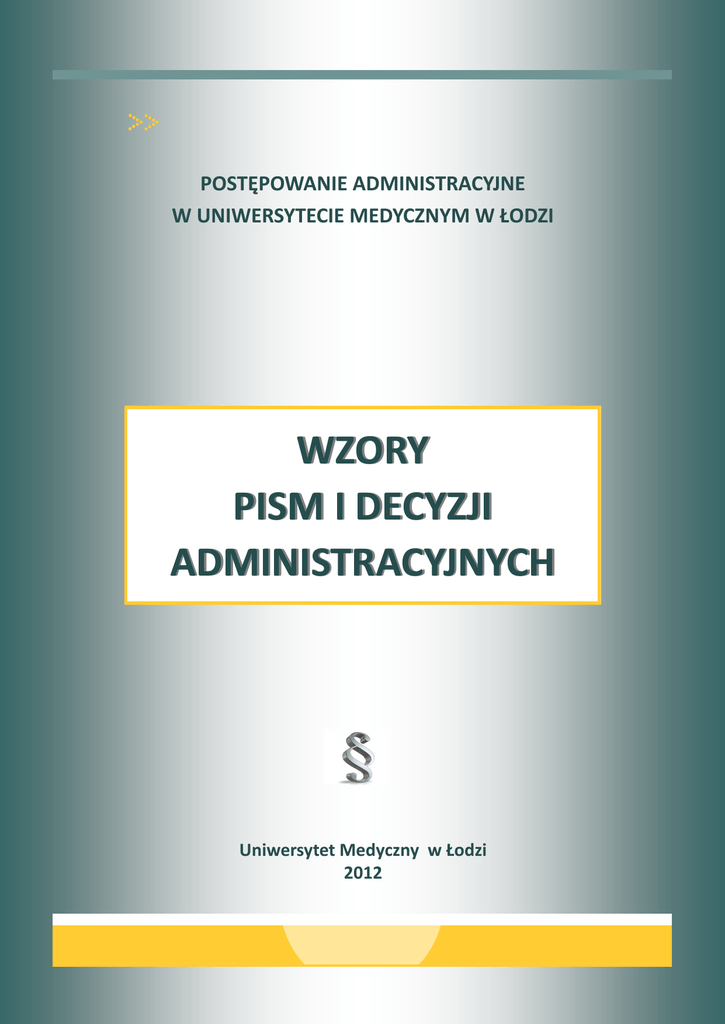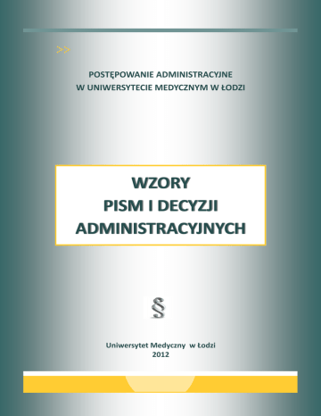 POSTĘPOWANIE ADMINISTRACYJNE W UNIWERSYTECIE MEDYCZNYM W ŁODZI WZORY PISM I DECYZJI ADMINISTRACYJNYCH Uniwersytet Medyczny w Łodzi 2012 2 SPIS TREŚCI I. INFORMACJE WSTĘPNE …………………………………………………………………………………….……… 3 II. WEZWANIA .................................................................................................................... 8 III. ZAWIADOMIENIA …………………………………………………………………………………………………….. 9 IV. POSTANOWIENIA ……………………………………………………………………………….…………………... 11 V. DECYZJE ADMINISTRACYJNE W SPRAWACH STUDENCKICH ..................................... 13 Przyjęcie na studia …………………………………………………………………………………………………. Skreślenie z listy studentów …………………………………………………………………………………… Wznowienie studiów (reaktywacja) ……………………………………………………………………….. Przeniesienie z innej uczelni ………………………………………………………………………………….. Pomoc materialna ……………………..………………………………………………………….………………. Zwolnienie z opłat za zajęcia dydaktyczne ..…………………………………………………………... Kontynuowanie studiów na drugim kierunku bez wnoszenia opłat ……………………….. 13 15 18 19 21 24 25 VI. DECYZJE ADMINISTRACYJNE W SPRAWACH DOKTORANCKICH ................................. 26 Przyjęcie na studia doktoranckie …………………………………………………………………………… Skreślenie z listy uczestników studiów doktoranckich …………………………………………… Stypendium doktoranckie ………………………………………..………………………...................... Pomoc materialna …………………………………………………………………………………………………. 26 28 30 33 VII. PRZYKŁADY PISM I DECYZJI ADMINISTRACYJNYCH .................................................... 34 Postanowienie w sprawie przywrócenia terminu …………………………………………………. Decyzja Uczelnianej Komisji Rekrutacyjnej ….……………………………………………………….. Decyzje o skreśleniu z listy studentów ……………………………………………………............... 34 36 38 VIII. WYKAZ SPRAW ROZSTRZYGANYCH DRODZE DECYZJI ADMINISTRACYJNEJ …………. 41 IX. 42 WYKAZ AKTÓW PRAWNYCH ………………………………………………...……………………………... 3 I. INFORMACJE WSTĘPNE Niniejsza broszura stanowi uzupełnienie do Instrukcji stosowania procedur postępowania administracyjnego w Uniwersytecie Medycznym w Łodzi, wprowadzonej zarządzeniem nr 61/2012 z dnia 29 czerwca 2012 r. Rektora Uniwersytetu Medycznego w Łodzi. Zawiera ona wzory pism oraz decyzji wydawanych w toku postępowania administracyjnego prowadzonego w Uczelni. W celu lepszego zobrazowania zasad redagowania ww. dokumentów umieszczono w niej także przykłady decyzji administracyjnych zawierające uzasadnienia podjętych rozstrzygnięć. W opracowaniu uwzględniono ponadto podstawowe informacje na temat postępowania administracyjnego, wykaz spraw rozstrzyganych w Uczelni w drodze decyzji administracyjnej oraz zestawienie aktów prawnych stanowiących podstawę rozstrzygnięć prezentowanych we wzorach pism i decyzji. Aby ułatwić korzystanie z opracowanych wzorów, zastosowano w nich następujące wyróżnienia: • kolory niebieski, brązowy i zielony – dla wskazania formuł alternatywnych, • kolor czerwony oraz pismo pochyłe – dla oznaczenia przypisów oraz komentarzy dotyczących sposobu opracowania dokumentu. Redagując pismo lub decyzję administracyjną na podstawie wybranego wzoru, należy w odpowiednich polach dokumentu wpisać właściwe informacje oraz usunąć (nie skreślić!) formuły alternatywne i komentarze, gdyż dla zachowania ważności decyzji istotne jest, aby nie zawierała skreśleń. Należy także pamiętać o aktualizowaniu podstaw prawnych podanych we wzorze (mogą ulec zmianie). Opracowanie to nie rozwieje z pewnością wszystkich wątpliwości, które mogą pojawić się w trakcie przygotowania decyzji administracyjnej, każda sprawa ma bowiem swoją specyfikę i wymaga odrębnej analizy przepisów prawa, faktów oraz zgromadzonych dokumentów. Pamiętajmy również, że gwarancją prawidłowości postępowania administracyjnego jest nie tylko właściwe redagowanie pism oraz decyzji administracyjnych, ale także stosowanie się do zasad regulujących sposób prowadzenia postępowania, w tym zasad ogólnych, określonych w art. 6-16 Kodeksu postępowania administracyjnego*, tj.: pisemności postępowania; terminowego załatwiania spraw; • dwuinstancyjności postępowania; • informowania strony o jej prawach w zakresie prowadzonego postępowania; * Ustawa z dnia 14 czerwca 1960 r. – Kodeks postępowania administracyjnego (tekst jedn. Dz. U. z 2000 r. Nr 98, poz. 1071 z późn. zm.) . 4 przestrzegania prawa strony do zapoznania z aktami sprawy i uczestniczenia w postępowa- niu na każdym jego etapie oraz wypowiedzenia się co do zebranych dowodów i materiałów przed wydaniem decyzji; • udzielania stronie postępowania niezbędnych wyjaśnień i wskazówek, tak aby strona nie poniosła szkody z powodu nieznajomości prawa. Terminowe załatwianie spraw Terminowe załatwienie sprawy wymaga od osoby prowadzącej postępowanie administracyjne notowania oraz egzekwowania terminów wymaganych na każdym etapie postępowania. Oznacza to m.in.: wysyłanie pism w formie umożliwiającej kontrolowanie u
