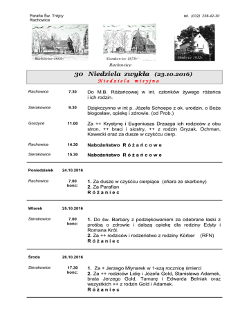 Parafia Św. Trójcy Rachowice tel. (032) 238-42-30 Rachowice 1663r. Sierakowice 1673r. Goszyce 1932r. Rachowice 1663r. 30 Niedziela zwykła (23.10.2016) Niedziela misyjna Rachowice 7.30 Do M.B. Różańcowej w int. członków żywego różańca i ich rodzin. Sierakowice 9.30 Dziękczynna w int p. Józefa Schoepe z ok. urodzin, o Boże błogosław, opiekę i zdrowie. (od Prob.) Goszyce 11.00 Za ++ Krystynę i Eugeniusza Drzazga ich rodziców z obu stron, ++ braci i siostry, ++ z rodzin Gryzak, Ochman, Kawecki oraz za dusze w czyśćcu cierp. Rachowice 14.30 Nabożeństwo R ó ż a ń c o w e Sierakowice 15.30 Nabożeństwo R ó ż a ń c o w e Poniedziałek Rachowice Wtorek Sierakowice Środa Sierakowice 24.10.2016 7.00 konc: 1. Za dusze w czyśćcu cierpiące (ofiara ze skarbony) 2. Za Parafian Różaniec 25.10.2016 7.00 konc: 1. Do św. Barbary z podziękowaniem za odebrane łaski z prośbą o zdrowie i dalszą opiekę dla rodziny Edyty i Romana Król. 2. Za ++ rodziców i rodzeństwo z rodziny Körber (RFN) Różaniec 26.10.2016 17.30 konc: 1. Za + Jerzego Młynarek w 1-szą rocznicę śmierci 2. Za ++ rodziców Lidię i Józefa Gold, Stanisława Adamek, brata Jerzego Gold, Tamarę i Edwarda Belniak oraz wszystkich ++ z rodzin Gold i Adamek. Różaniec Parafia Św. Trójcy Rachowice Czwartek 27.10.2016 tel. (032) 238-42-30 Sierakowice 17.30 Za + męża Ewalda Hassa na pamiątkę urodzin, jego ++ rodziców, 2-ch braci, 4 siostry, 2-ch szwagrów, za ++ rodziców Pawła i Paulinę Pieczka, 3-ch braci, 2 siostry 2-ch szwagrów, zięcia Edwarda oraz siostrzenice Marię i Jadwigę i za ++ z całego pokrewieństwa. Różaniec Rachowice 18.00 18.30 Różaniec Za ++ Marię i Ottona Gehrke, Wernera Greiner, dziadków Marcinek, Gliński, Sawicki, Karola Tondygro, Annę Drewniok, Gizelę i Ingę Sander. Piątek 28.10.2016 Święto świętych Apostołów Szymona i Judy Tadeusza Sierakowice 17.30 konc: M. szkol. 1. Za + męża Adama Piskorz jego rodziców, Wincentego Straszek, Adama Purzyński, Józefa Choroś, Renatę Kosider, Genowefę Bogut, ++ dziadków i duszę w czyśćcu cierpiące. 2. Za + Zbigniewa Choroś w 6-ść tygodni po śmierci. Różaniec Rachowice 18.00 18.30 Różaniec M. szkol. Za + ojca i teścia Manfreda Kowol na pamiątkę jego urodzin oraz ++ dziadków z rodzin Marcinek, Piper, Kowol i Morys. Sobota 29.10.2016 Sierakowice 12.00 Śl. Rz. pomiędzy Sandrą Szafranek a Sebastianem Jojko Sierakowice 16.35 17.00 Różaniec M.N. Za ++ rodziców Alfreda i Gertrudę Kowol, za + matkę Amelię Stolarek, + Iwonę oraz ++ z pokrewieństwa z obu stron. Rachowice 18.05 18.30 Różaniec M.N. Do Anioła Stróża za roczne Magdalenę Smyk w int. jej rodziców i chrzestnych o błogosław. Boże i pomoc w jej wychowaniu. 31 Niedziela zwykła (30.10.2016) ( Zmiana czasu na zimowy) Rachowice 7.30 Za ++ Marię i Hieronima Franik, synów Józefa i Wilhelma, Grażynę Franik, Bartłomieja Mazur, Karola i Martę Szczesny ich dzieci, synową Annę, 4-ch zięciów i wnuków, Marię Galonska, ++ z rodzin Szczesny, Franik, Adamczyk, Parafia Św. Trójcy Rachowice tel. (032) 238-42-30 Minas, Brzozowski, Drewniok. Sierakowice 9.30 Za ++ dziadków Rudolfa i Urszulę Magiera, ++ dziadków z rodzin Lach, Magiera, Suchan i Pietrzyk praz za ++ z całego pokrewieństwa. Goszyce 11.00 Za ++ rodziców Gertrudę i Feliksa Wojdyna, Sylwię Foit oraz ++ z pokrewieństwa. OGŁOSZENIA DUSZPASTERSKIE 1) Dzisiejsza kolekta z racji niedzieli misyjnej na misje (zgodnie z instrukcją Episkopatu Polski) w przyszłym tygodniu , ołtarzowa (tradycyjnie raz w miesiącu) na Sidilia i ławki wokół ołtarza, za wszelkie ofiary składam „Bóg zapłać”. 2) W dzisiejszej Ewangelii Pan Jezus ponownie przypomina o wartości pokornej, ufnej, wytrwałej modlitwy. Gdy stanę w prawdzie przed Bogiem i przed samymi sobą, uznam swoją słabość i grzeszność, wtedy zostanę wysłuchany i Pan udzieli mi swojej łaski. Przykładem takiej modlitwy jest modlitwa różańcowa, której szczególnie poświęcony jest październik. 3) Dziś nabożeństwo różańcowe w Rachowicach i Sierakowicach. 4) Dziś przeżywamy Światowy Dzień Misyjny, który w naszej Ojczyźnie rozpoczyna Tydzień Misyjny. Podczas różańcowych nabożeństw w tym tygodniu będziemy omadlać dzieło misyjne Kościoła. Ofiary. 5) Za tydzień z soboty na niedzielę zmiana czasu na zimowy - / noc będzie dłuższa o jedną godz., przesuwamy wskazówki zegara o jedną godzinę w tył. 6) Wg. starej tradycji Kościoła już od środy w zakrystii będzie można składać z racji uroczystości Wszystkich Świętych zalecki - / wypominki / w „Dzień Zaduszny” msze św. będą odprawiane za zalecanych ++ jak również przez cały tydzień różaniec będzie odprawiany za ++ zalecanych. 7) Zachęcam aby skorzystać z Sakramentu Pokuty i ofiarować Komunię Św. oraz odpust zupełny za naszych zmarłych, gdyż okres ten to szczególna okazja i Dar Łaski Bożej dla naszych zmarłych 8) W piątek po mszy św. i różańcu w Sierakowicach spotkanie z kandytami do bierzmowania. 9) W zakrystii są do nabycia znicze Caritasowskie w cenie 3 zł. Jak co roku zachęcam, aby przynajmniej jeden taki znicz zapłoną na naszych grobach. 10)Spowiedź przed Uroczystością Wszystkich Świętych w poniedziałek za tydzień: - uwaga dzieci to jest wasza spowiedź miesięczna. 10)Przyjmowanie intencji na 2017 r. w Sierakowicach w środę i w od 16.15 i po mszy św. oraz w piątek od 16.00 do mszy św. w Rachowicach w czwartek i piątek po mszy św. wieczornej. Rachowice – sprzątanie Kościoła : Kułakowska K., Szmandra D., Skapczyk J. Sierakowice - sprzątanie Kościoła (ul. Blok Ceram.) : Jarosz S., Kaczmarczyk E., Wójcik J., Król A. W TYM TYGODNIU PATRONUJĄ NAM: 28 X – święci Apostołowie Szymon Gorliwy i Juda Tadeusz, wymieniani w „katalogu” Apostołów jako krewni Pana Jezusa; według niektórych pisarzy wczesnochrześcijańskich mieli razem głosić Ewangelię i p