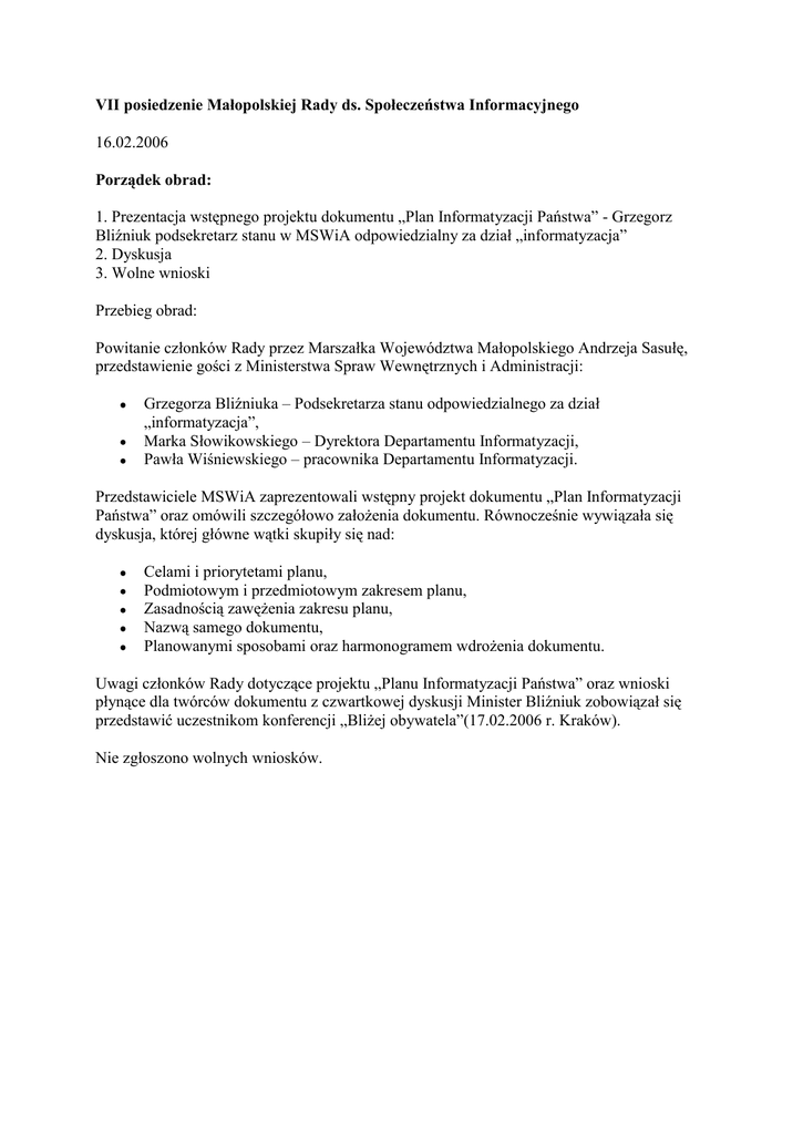 VII posiedzenie Małopolskiej Rady ds. Społeczeństwa Informacyjnego 16.02.2006 Porządek obrad: 1. Prezentacja wstępnego projektu dokumentu „Plan Informatyzacji Państwa” - Grzegorz Bliźniuk podsekretarz stanu w MSWiA odpowiedzialny za dział „informatyzacja” 2. Dyskusja 3. Wolne wnioski Przebieg obrad: Powitanie członków Rady przez Marszałka Województwa Małopolskiego Andrzeja Sasułę, przedstawienie gości z Ministerstwa Spraw Wewnętrznych i Administracji: Grzegorza Bliźniuka – Podsekretarza stanu odpowiedzialnego za dział „informatyzacja”, Marka Słowikowskiego – Dyrektora Departamentu Informatyzacji, Pawła Wiśniewskiego – pracownika Departamentu Informatyzacji. Przedstawiciele MSWiA zaprezentowali wstępny projekt dokumentu „Plan Informatyzacji Państwa” oraz omówili szczegółowo założenia dokumentu. Równocześnie wywiązała się dyskusja, której główne wątki skupiły się nad: Celami i priorytetami planu, Podmiotowym i przedmiotowym zakresem planu, Zasadnością zawężenia zakresu planu, Nazwą samego dokumentu, Planowanymi sposobami oraz harmonogramem wdrożenia dokumentu. Uwagi członków Rady dotyczące projektu „Planu Informatyzacji Państwa” oraz wnioski płynące dla twórców dokumentu z czwartkowej dyskusji Minister Bliźniuk zobowiązał się przedstawić uczestnikom konferencji „Bliżej obywatela”(17.02.2006 r. Kraków). Nie zgłoszono wolnych wniosków.