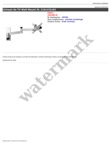 Informacje o produkcie Utworzono 04-03-2017 Uchwyt do TV Wall Mount XL 116x152x81 Cena : 210,00 zł er m ar k Nr katalogowy : 49396 Stan magazynowy : poniżej średniego Średnia ocena : brak recenzji Uchwyt ścienny do montażu na ściane do telewizora. Uchwyt aluminiowy srebny na ekran od "13" do "30" cal. w at Ładowność do 15kg. Wygenerowano w programie www.oscGold.com