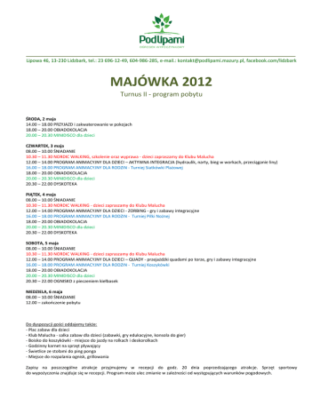 Lipowa 46, 13-230 Lidzbark, tel.: 23 696-12-49, 604-986-285, e-mail.: [email protected], facebook.com/lidzbark MAJÓWKA 2012 Turnus II - program pobytu ŚRODA, 2 maja 14.00 – 18.00 PRZYJAZD i zakwaterowanie w pokojach 18.00 – 20.00 OBIADOKOLACJA 20.00 – 20.30 MINIDISCO dla dzieci CZWARTEK, 3 maja 08.00 – 10.00 ŚNIADANIE 10.30 – 11.30 NORDIC WALKING, szkolenie oraz wyprawa - dzieci zapraszamy do Klubu Malucha 12.00 – 14.00 PROGRAM ANIMACYJNY DLA DZIECI – AKTYWNA INTEGRACJA (hydraulik, narty, bieg w workach, przeciąganie liny) 16.00 – 18.00 PROGRAM ANIMACYJNY DLA RODZIN - Turniej Siatkówki Plażowej 18.00 – 20.00 OBIADOKOLACJA 20.00 – 20.30 MINIDISCO dla dzieci 20.30 – 22.00 DYSKOTEKA PIĄTEK, 4 maja 08.00 – 10.00 ŚNIADANIE 10.30 – 11.30 NORDIC WALKING - dzieci zapraszamy do Klubu Malucha 12.00 – 14.00 PROGRAM ANIMACYJNY DLA DZIECI - ZORBING - gry i zabawy integracyjne 16.00 – 18.00 PROGRAM ANIMACYJNY DLA RODZIN - Turniej Piłki Nożnej 18.00 – 20.00 OBIADOKOLACJA 20.00 – 20.30 MINIDISCO dla dzieci 20.30 – 22.00 DYSKOTEKA SOBOTA, 5 maja 08.00 – 10.00 ŚNIADANIE 10.30 – 11.30 NORDIC WALKING - dzieci zapraszamy do Klubu Malucha 12.00 – 14.00 PROGRAM ANIMACYJNY DLA DZIECI – QUADY - przejażdżki quadami po torze, gry i zabawy integracyjne 16.00 – 18.00 PROGRAM ANIMACYJNY DLA RODZIN - Turniej Koszykówki 18.00 – 20.00 OBIADOKOLACJA 20.00 – 20.30 MINIDISCO dla dzieci 20.30 – 22.00 OGNISKO z pieczeniem kiełbasek NIEDZIELA, 6 maja 08.00 – 10.00 ŚNIADANIE 12.00 – zakooczenie pobytu Do dyspozycji gości oddajemy także: - Plac zabaw dla dzieci - Klub Malucha - salka zabaw dla dzieci (zabawki, gry edukacyjne, konsola do gier) - Boisko do koszykówki - miejsce do jazdy na rolkach i deskorolkach - Godzinny karnet na sprzęt pływający - Świetlice ze stołami do ping ponga - Miejsce do rozpalania ognisk, grillowania Zapisy na poszczególne atrakcje przyjmujemy w recepcji do godz. 20 dnia poprzedzającego atrakcje. Sprzęt sportowy do wypożyczenia znajduje się w recepcji. Program może ulec zmianie w zależności od występujących warunków pogodowych.