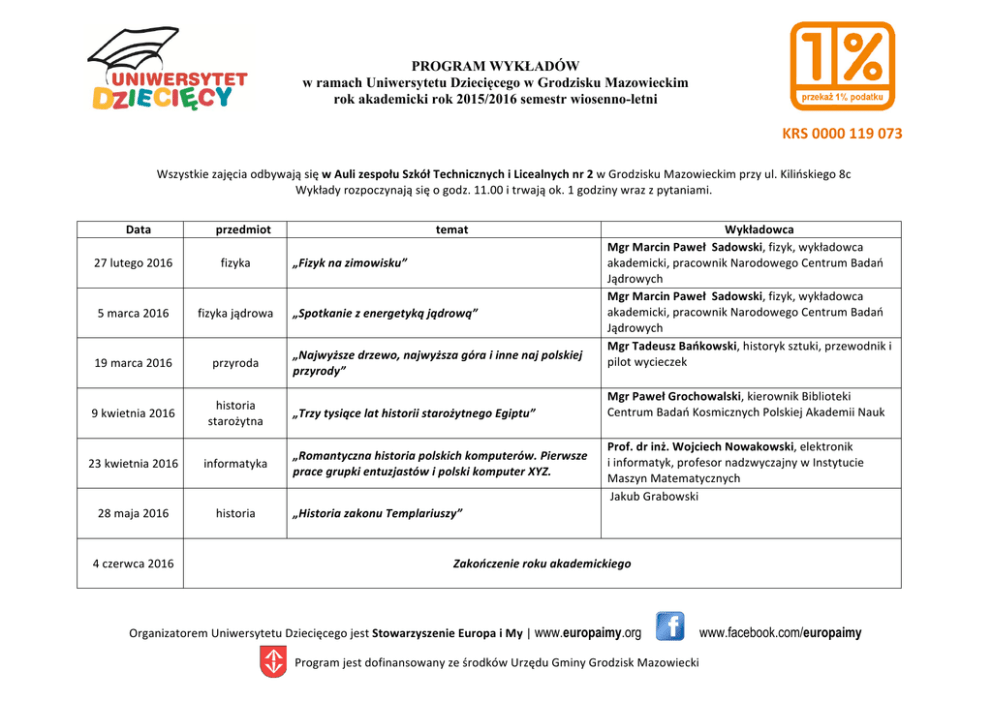 PROGRAM WYKŁADÓW w ramach Uniwersytetu Dziecięcego w Grodzisku Mazowieckim rok akademicki rok 2015/2016 semestr wiosenno-letni KRS0000119073 WszystkiezajęciaodbywająsięwAulizespołuSzkółTechnicznychiLicealnychnr2wGrodziskuMazowieckimprzyul.Kilińskiego8c Wykładyrozpoczynająsięogodz.11.00itrwająok.1godzinywrazzpytaniami. Data przedmiot 27lutego2016 fizyka 5marca2016 fizykajądrowa 19marca2016 przyroda 9kwietnia2016 historia starożytna 23kwietnia2016 informatyka 28maja2016 historia 4czerwca2016 temat „Fizyknazimowisku” „Spotkaniezenergetykąjądrową” „Najwyższedrzewo,najwyższagóraiinnenajpolskiej przyrody” „TrzytysiącelathistoriistarożytnegoEgiptu” „Romantycznahistoriapolskichkomputerów.Pierwsze pracegrupkientuzjastówipolskikomputerXYZ. Wykładowca MgrMarcinPawełSadowski,fizyk,wykładowca akademicki,pracownikNarodowegoCentrumBadań Jądrowych MgrMarcinPawełSadowski,fizyk,wykładowca akademicki,pracownikNarodowegoCentrumBadań Jądrowych MgrTadeuszBańkowski,historyksztuki,przewodniki pilotwycieczek MgrPawełGrochowalski,kierownikBiblioteki CentrumBadańKosmicznychPolskiejAkademiiNauk Prof.drinż.WojciechNowakowski,elektronik iinformatyk,profesornadzwyczajnywInstytucie MaszynMatematycznych JakubGrabowski „HistoriazakonuTemplariuszy” Zakończenierokuakademickiego OrganizatoremUniwersytetuDziecięcegojestStowarzyszenieEuropaiMy|www.europaimy.org www.facebook.com/europaimy ProgramjestdofinansowanyześrodkówUrzęduGminyGrodziskMazowiecki PROGRAM WARSZTATÓW w ramach Uniwersytetu Dziecięcego Wszystkiezajęciaodbywająsięwsoboty,rozpoczynająsięogodz.12itrwająok.1h.-1,5ha.Miejsce:ZespółSzkółTechnicznychiLicealnych,ul.Kilińskiego8c DATA 27lutego 5marca 19marca 9kwietnia 23kwietnia 28maja TEMAT WYKŁADOWCA* Obcywewnątrznas,czyliopasożytachsłówkilka. DariuszKucharski Jakimamywpływnaswojezdrowie. KatarzynaTokarz Definicjaicharakterystykaefektywnegouczeniasię AleksandraNiedźwiecka-Wardak Jakznaleźćgwiazdozbiorynaniebie? PawełGrochowalski Czynnikimającewpływnanaszezdrowie? KatarzynaTokarz AleksandraNiedźwiecka-Wardak Wprowadzeniewproblematykęuczeniasię.Znanei/lubwykorzystywanetechnikiinarzędzia ułatwiająceuczeniesię,analiza. Dlaczegowielorybwyglądajakryba(warsztatoewolucji). DariuszKucharski Zdroweżywienie. KatarzynaTokarz Uświadomienieindywidualnychsposobówułatwieniasobienauki. AleksandraNiedźwiecka-Wardak Przygodawobiektywie(warsztatfotograficzny-każdyuczestnikzajęćpowinienposiadaćaparat fotograficzny). DariuszKucharski Rolaiznaczeniewodywnaszymorganizmie. KatarzynaTokarz Wybranemnemotechnikiuczeniasię. AleksandraNiedźwiecka-Wardak Ktokogozjadawprzyrodzie? DariuszKucharski Stwórzwłasnyherb. PawełGrochowalski Mapymyśli. Rolagimnastykiwnaszymorganizmie. AleksandraNiedźwiecka-Wardak KatarzynaTokarz Warsztatyztworzeniatarcz,mieczy,hełmów,koronizbroiztektury… PawełGrochowalski. KomputeriInternetjakonarzędziawspierająceuczącegosię. AleksandraNiedźwiecka-Wardak * MgrDariuszKucharski,absolwentWydziałuBiologiiUniwersytetuWarszawskiego,redaktornajwiększego,polskiegoportalupoświęconegoegzotycznymzwierzętomwww.terrarium.pl. MgrPawełGrochowalski,kierownikBibliotekiCentrumBadańKosmicznychPolskiejAkademiiNauk MgrKatarzynaTokarz,Naturoterapeutka,wykładowca,EraNowegoZdrowia MgrAleksandraNiedźwiecka-Wardak,asystentwAkademiiPedagogikiSpecjalnejim.MariiGrzegorzewskiejwWarszawie